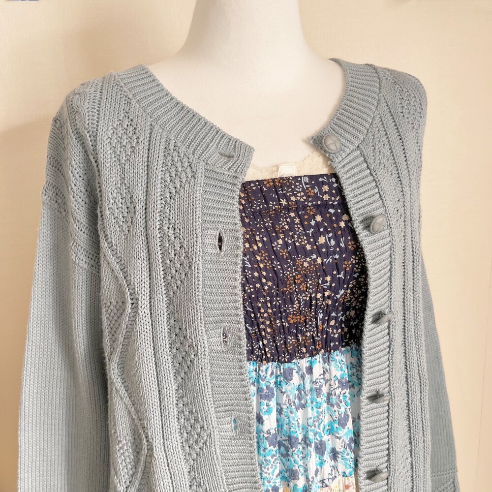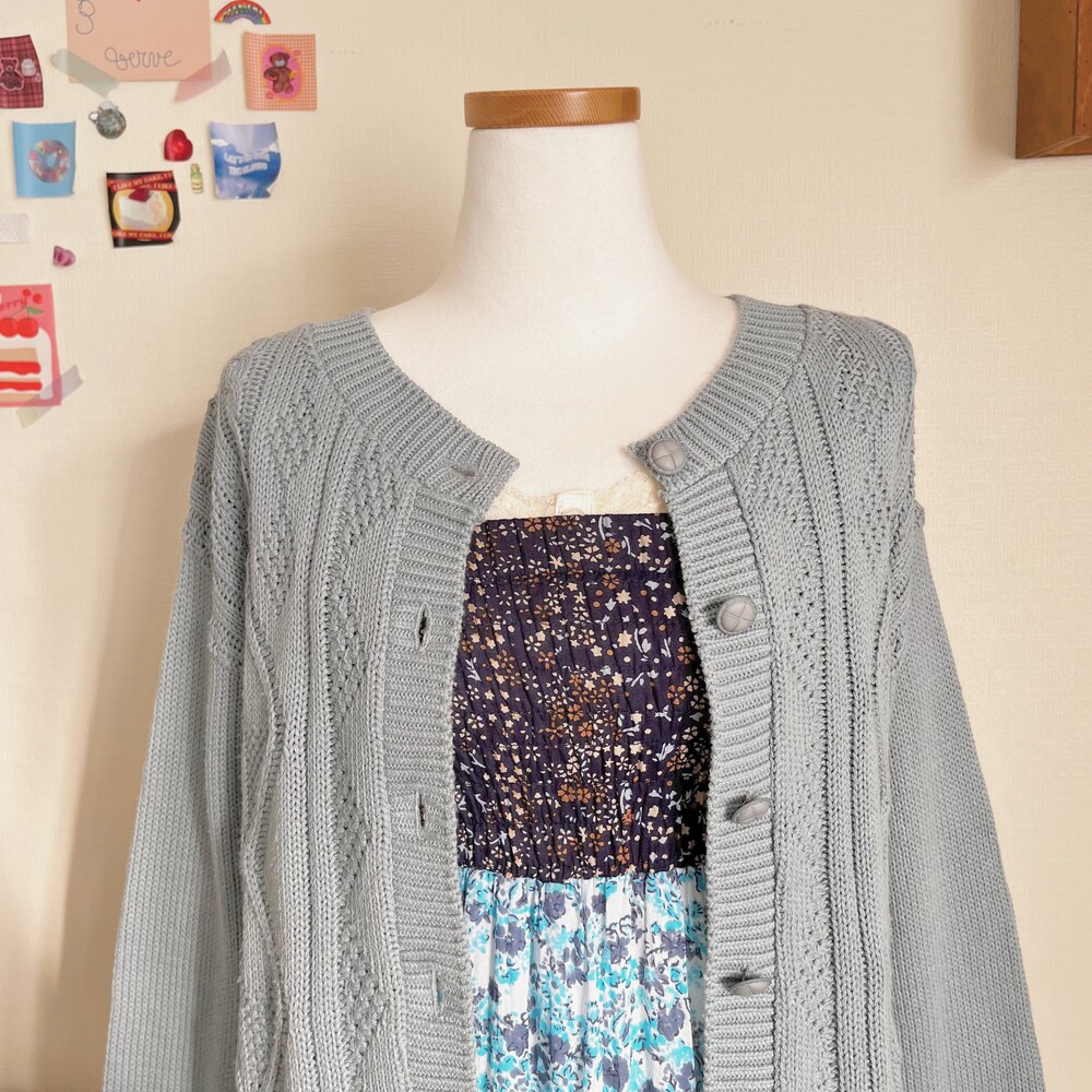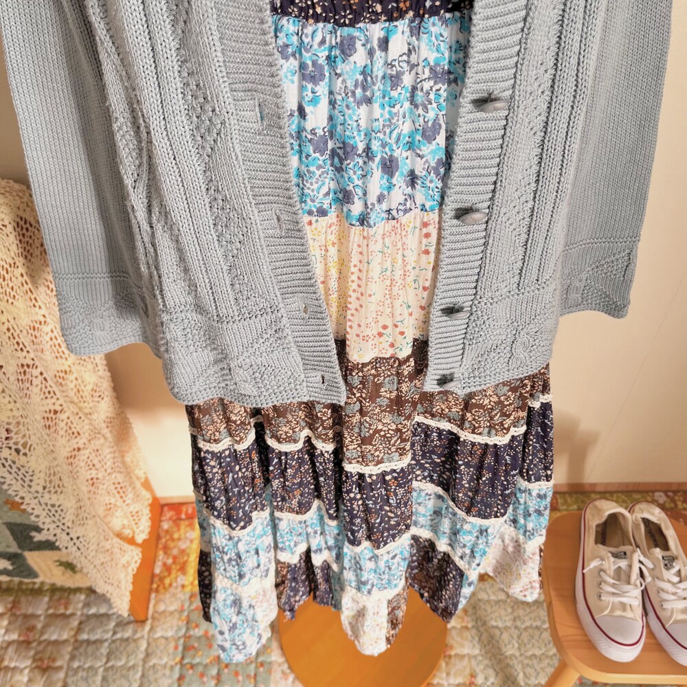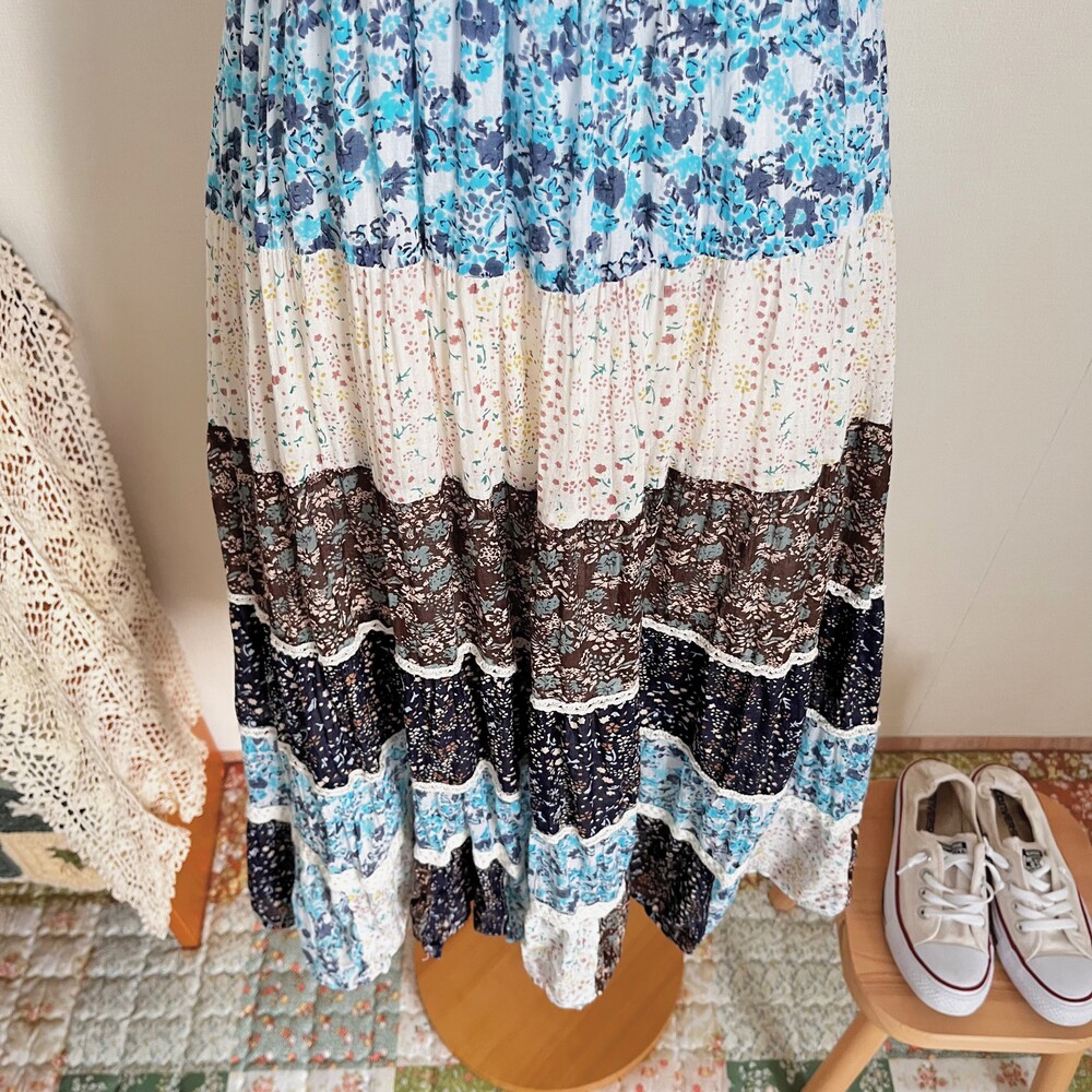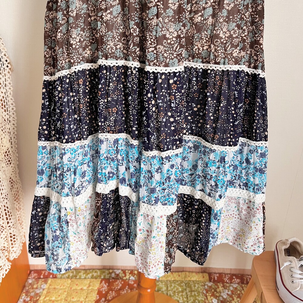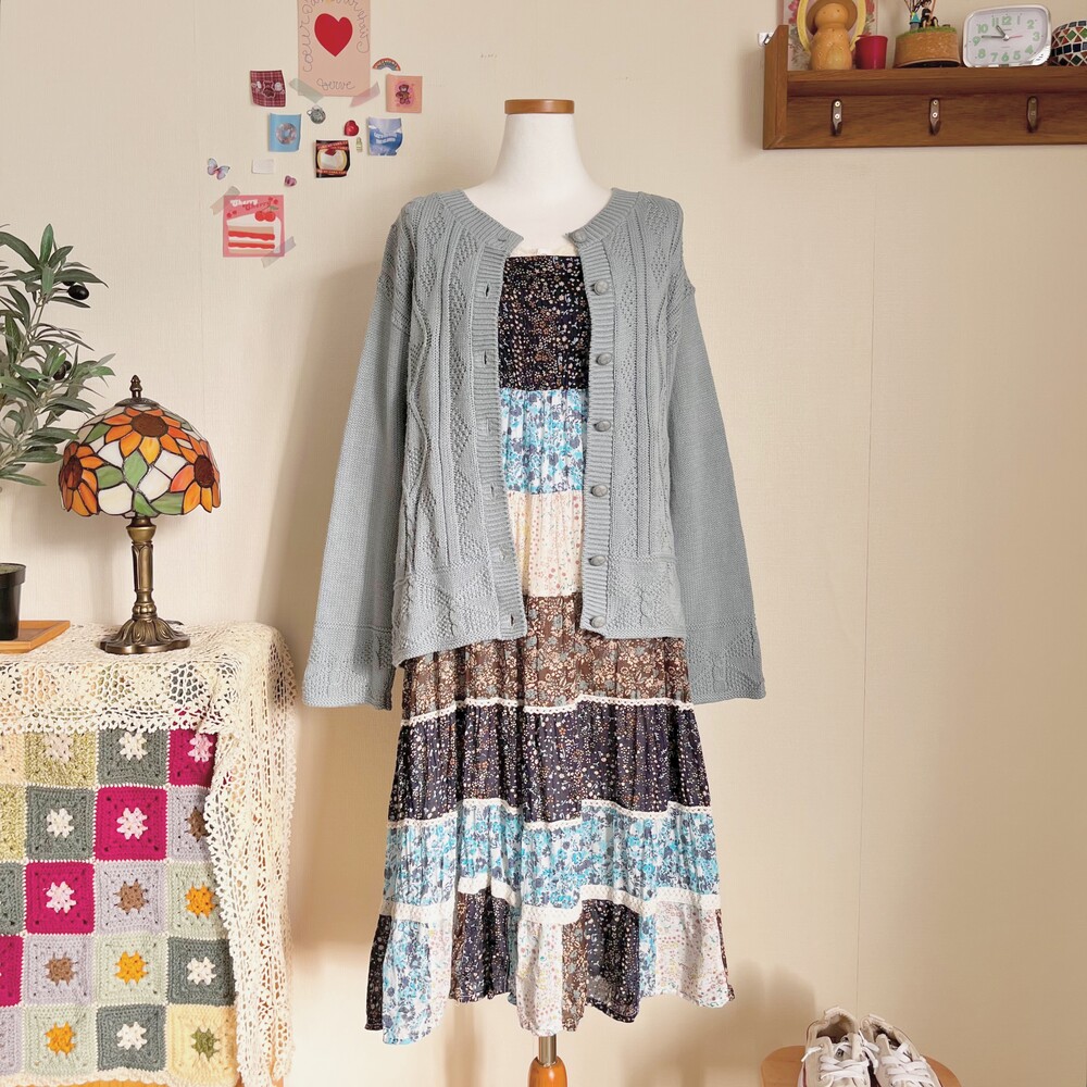 네이비, 블루 색감 베이스의 잔꽃 패치 끈원피스예요