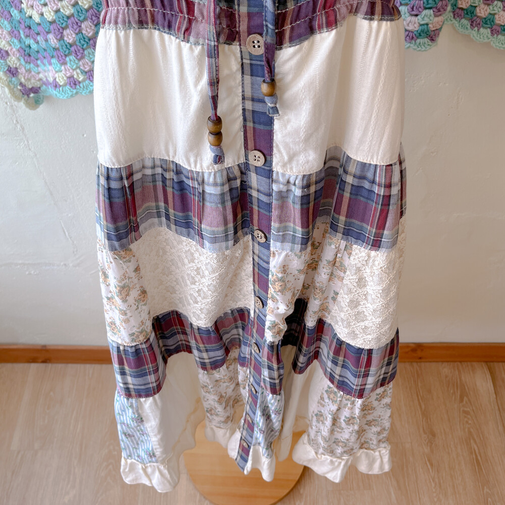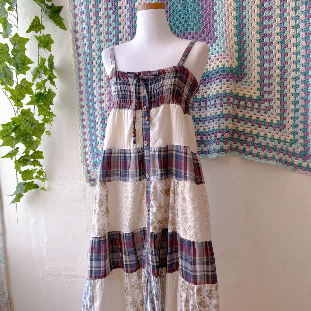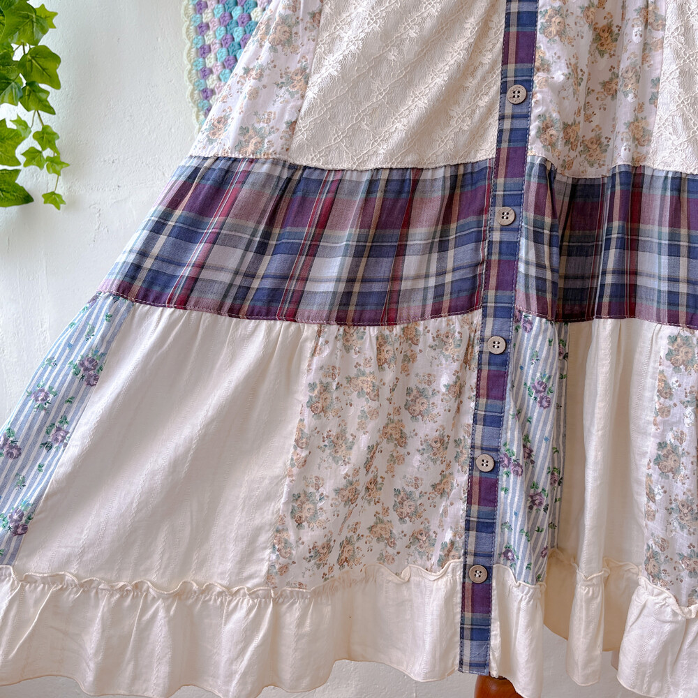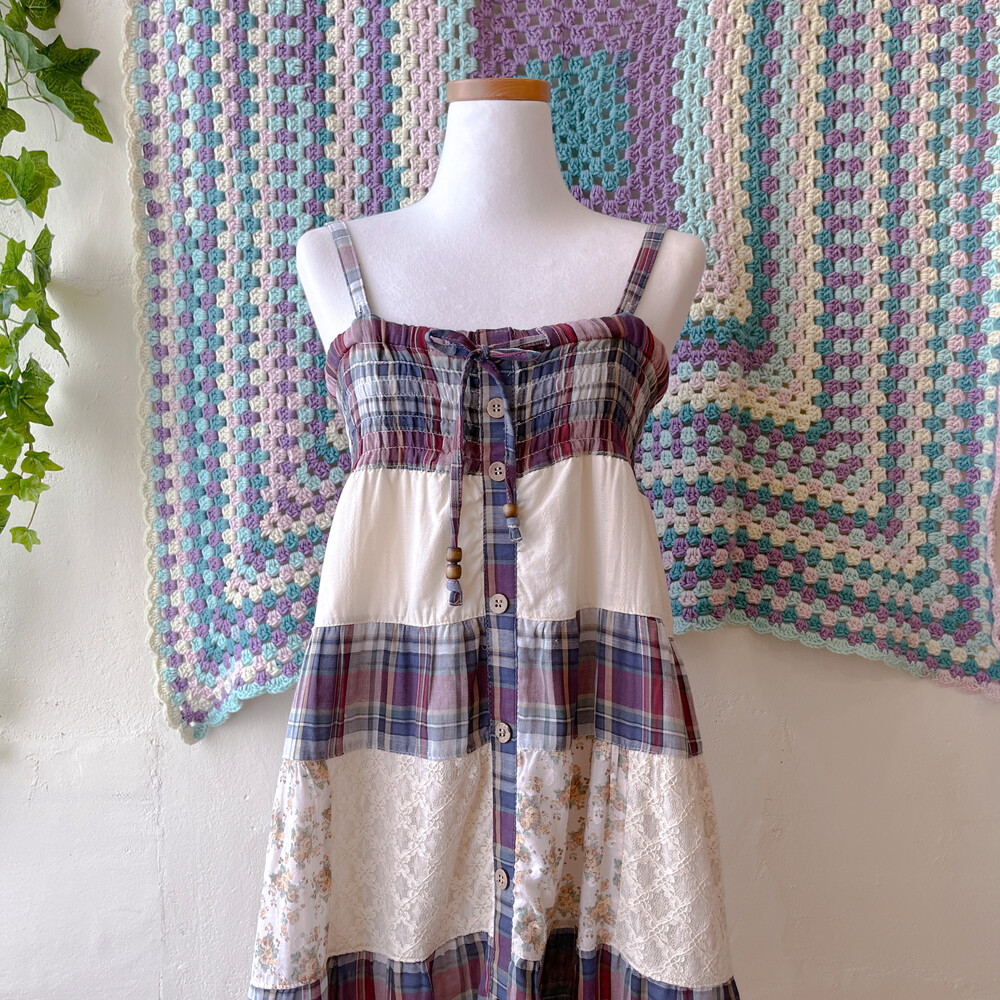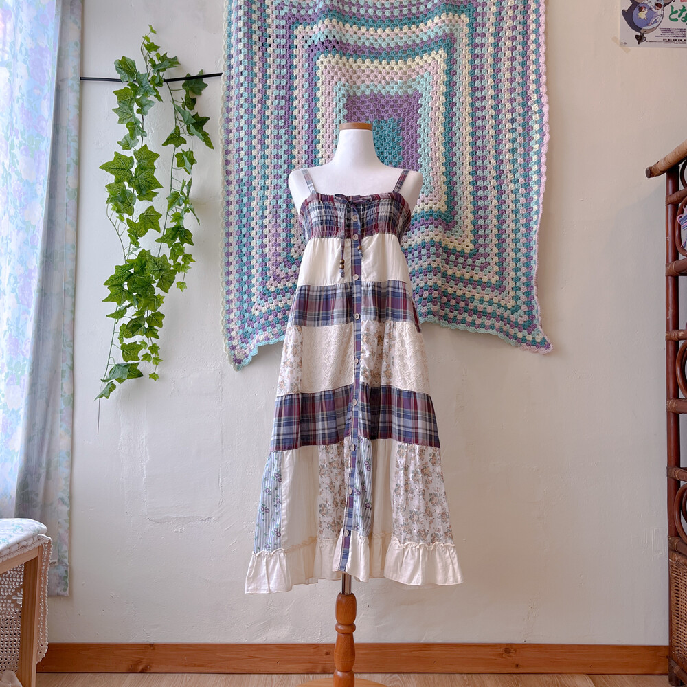 네이비 체크 포인트의 코튼 패치워크 끈원피스예요