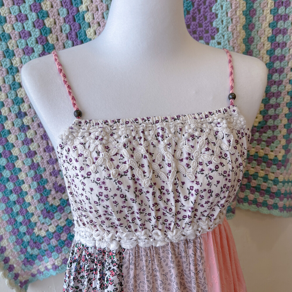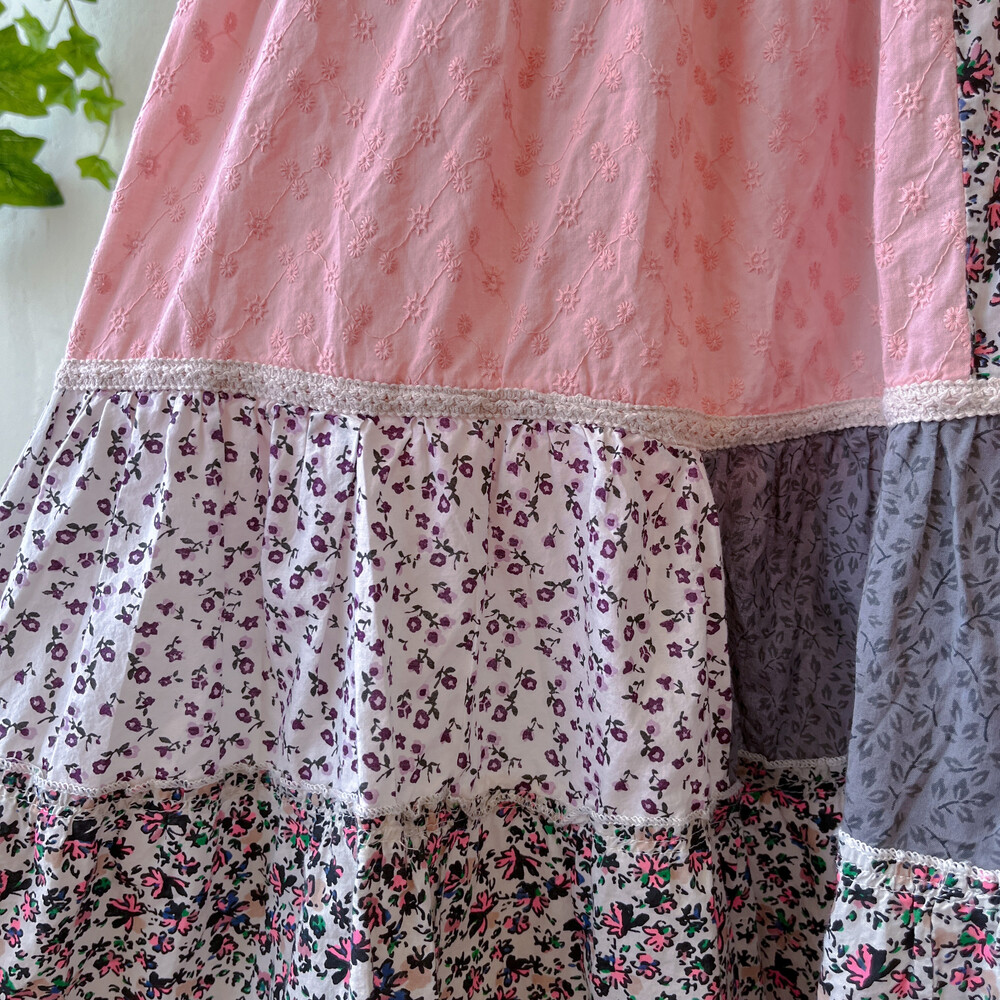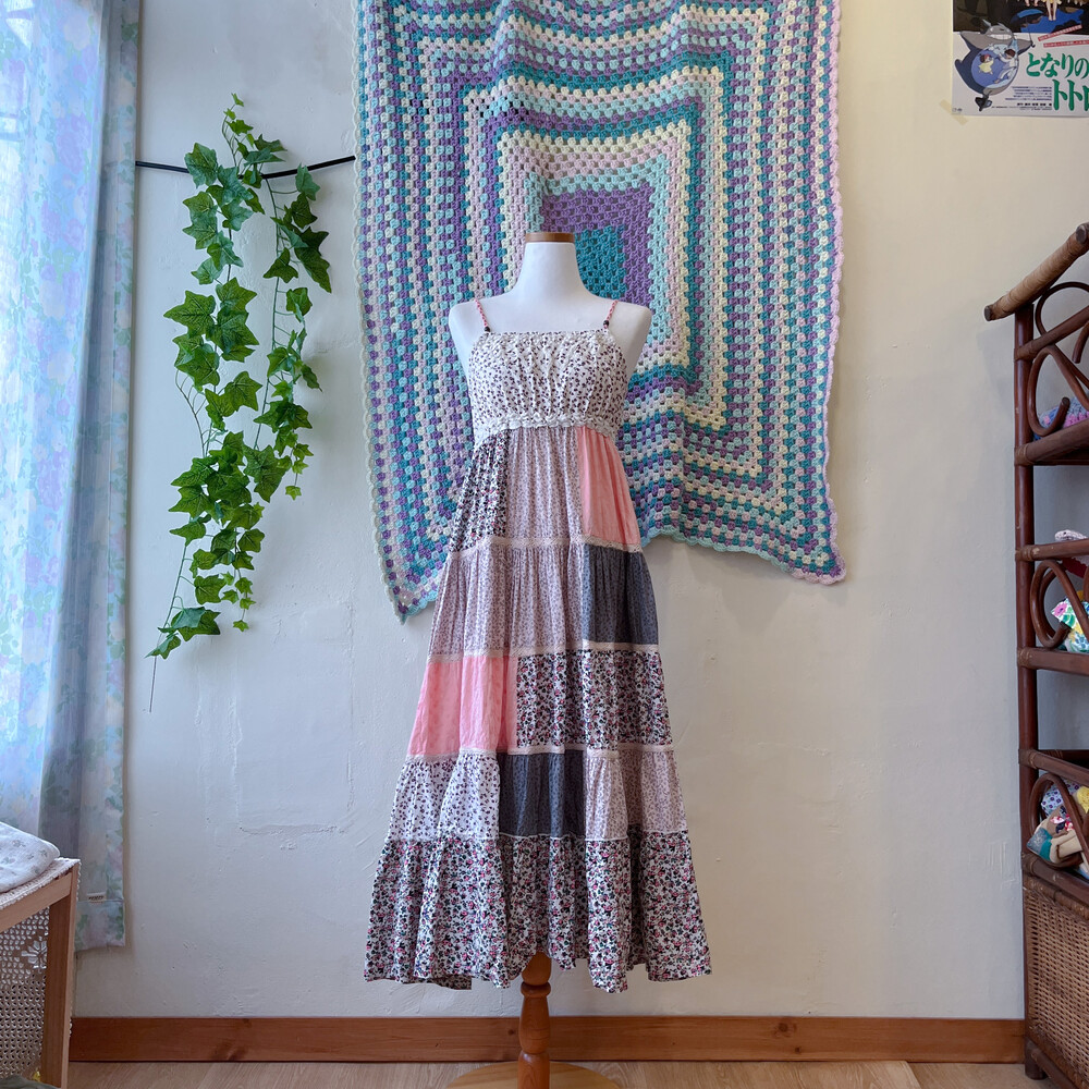 핑크, 먹색 패치 조합의 코튼 끈원피스예요