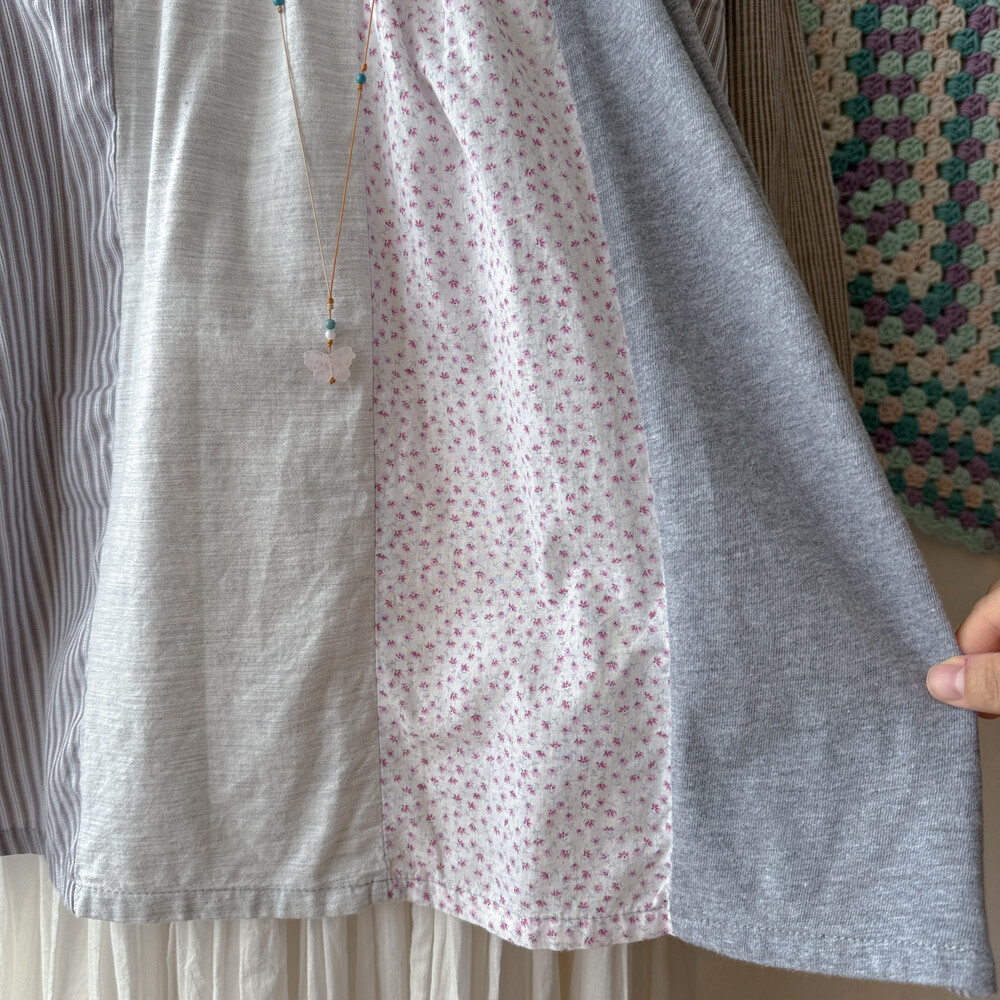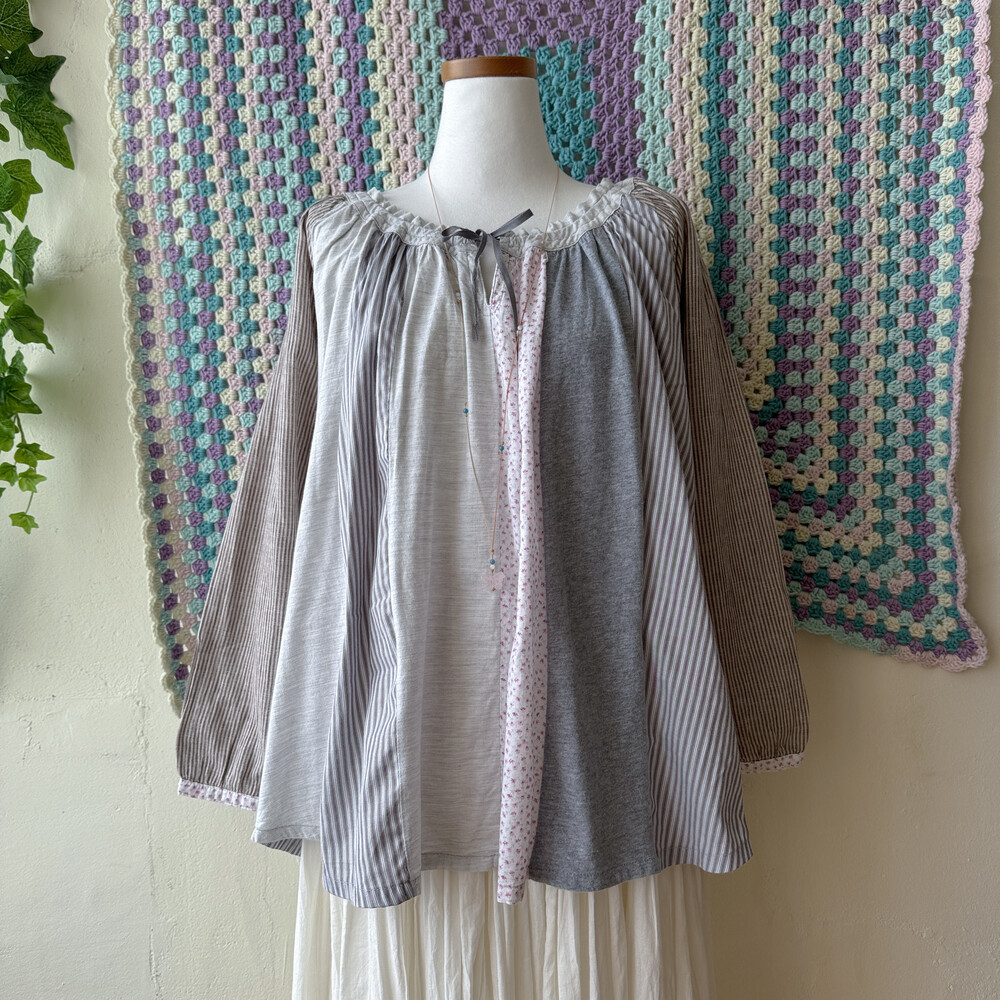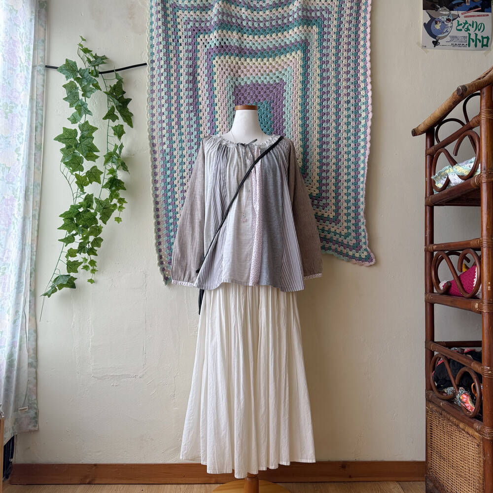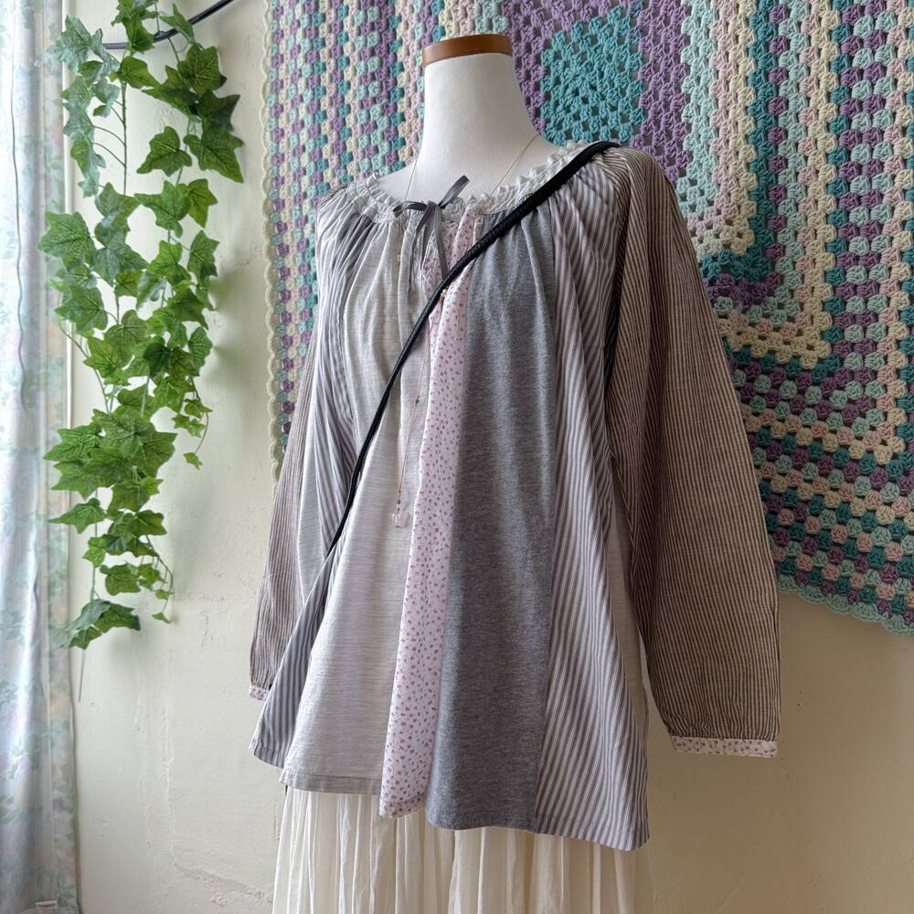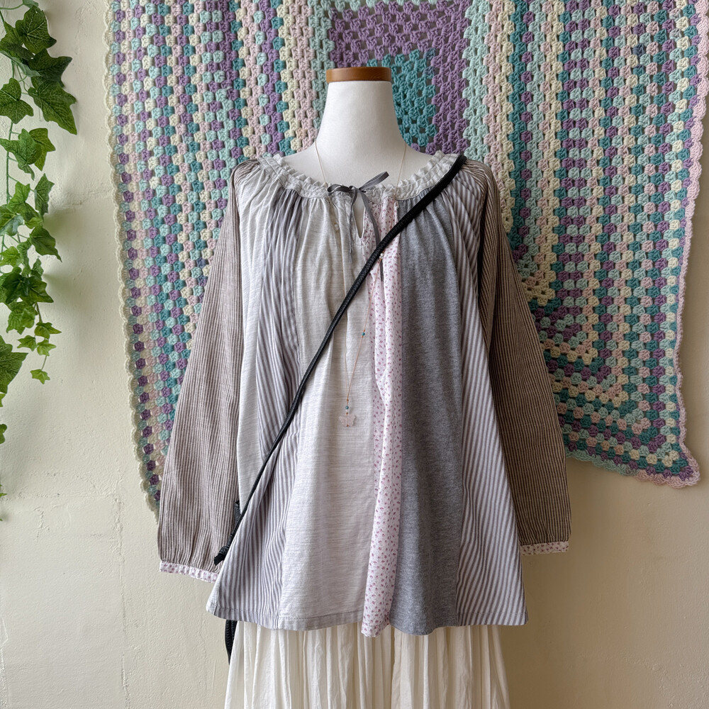 코지한 분위기의 세로 패치워크 블라우스예요