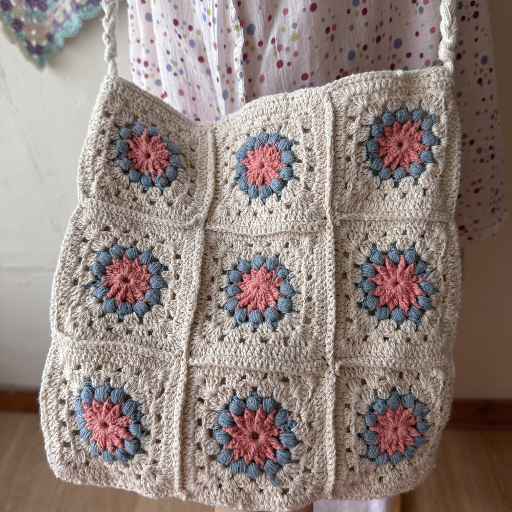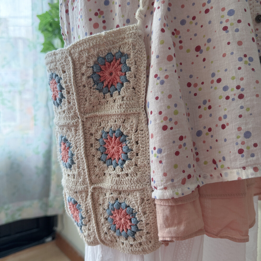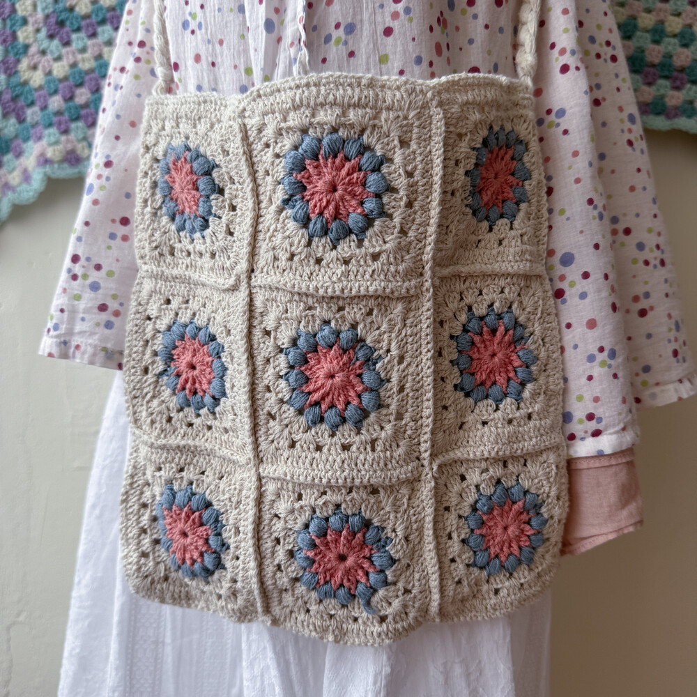 blue&pink flower granny square cross bag