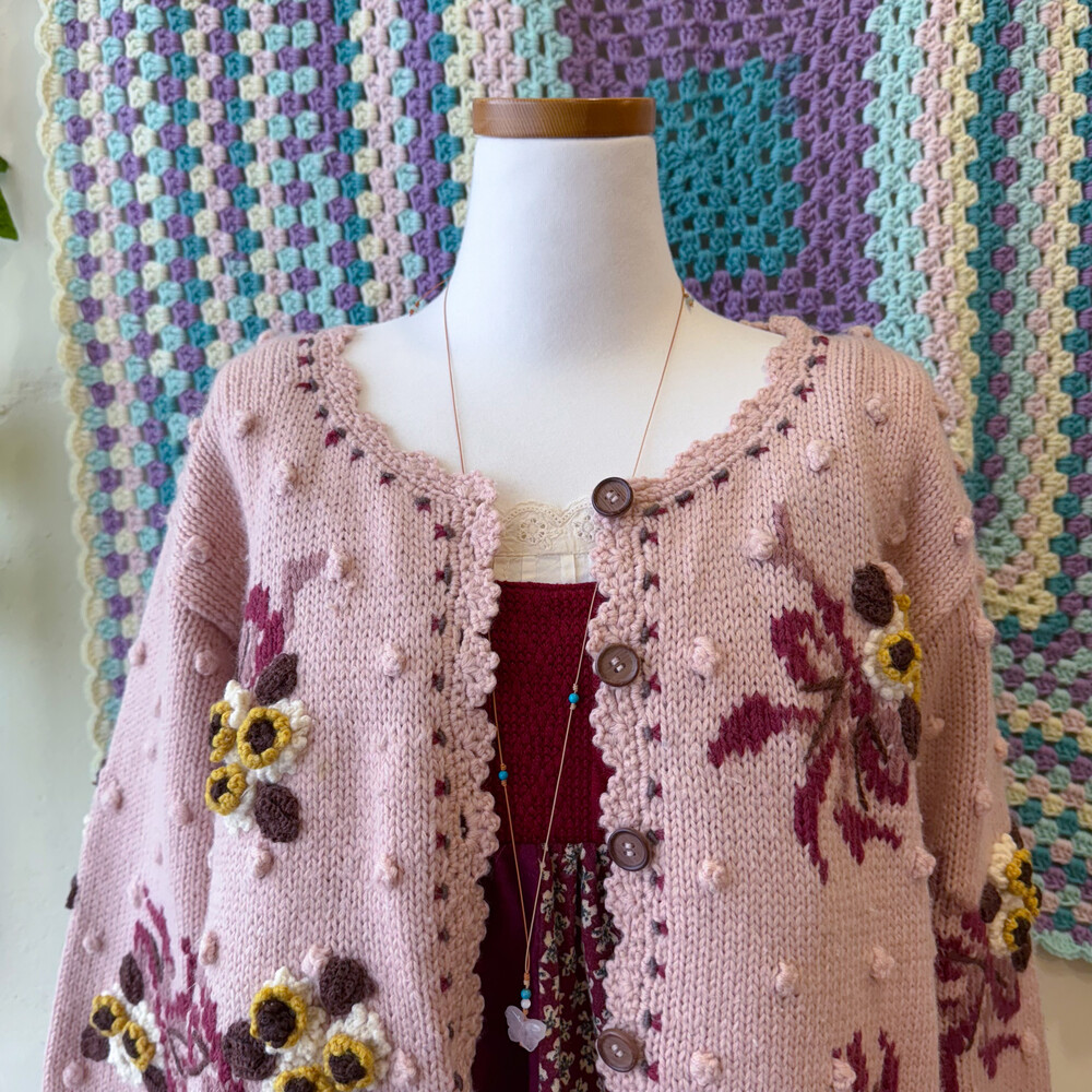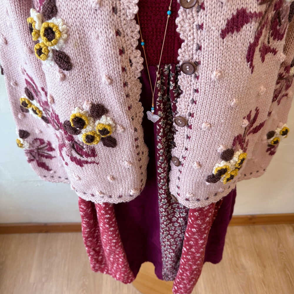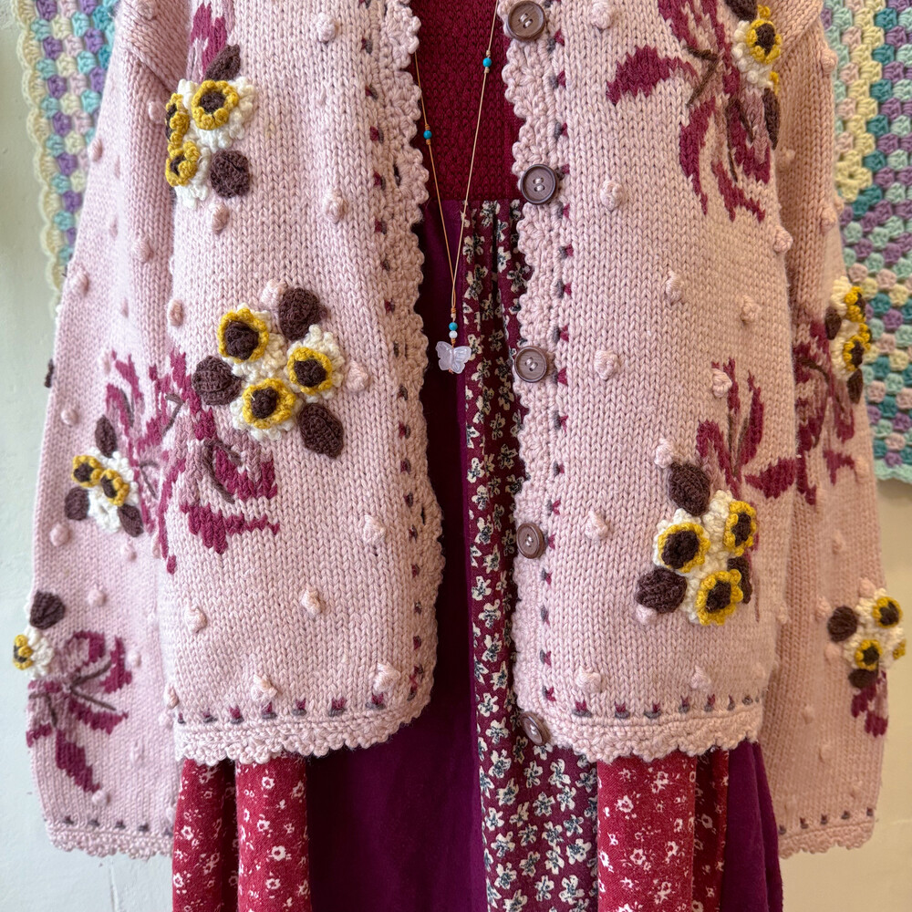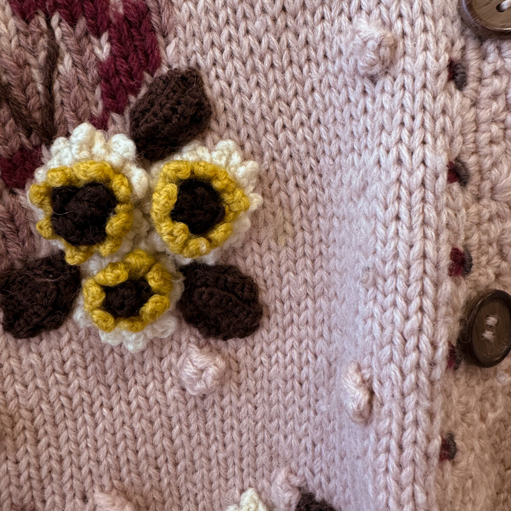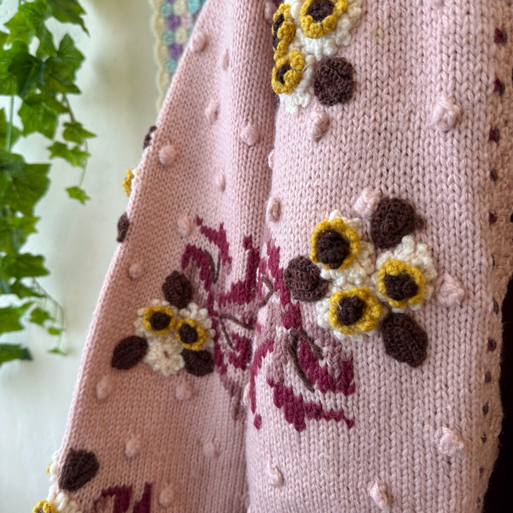 꽃모티브와 폼폼이 가득 들어가 있는 사랑스러운 가디건이에요