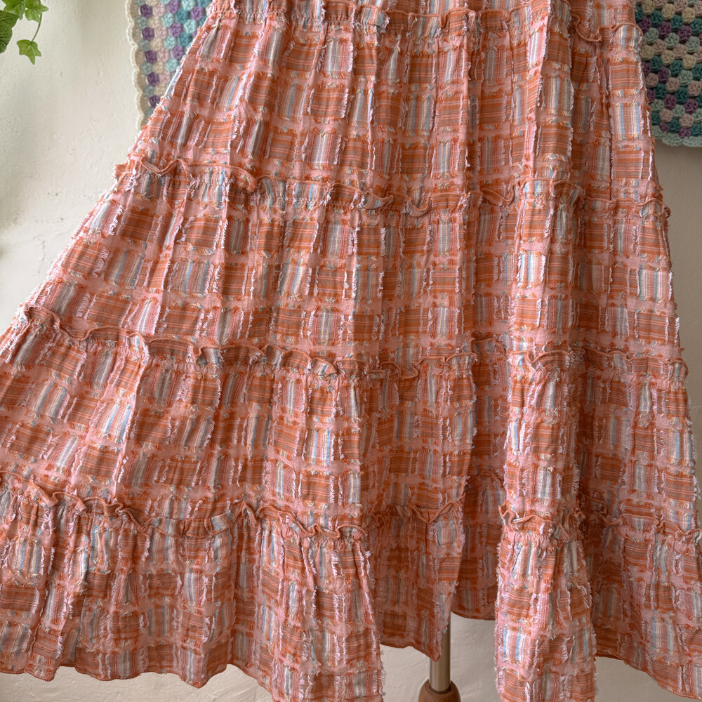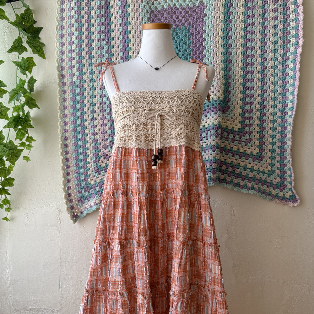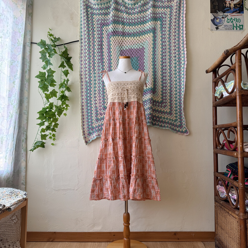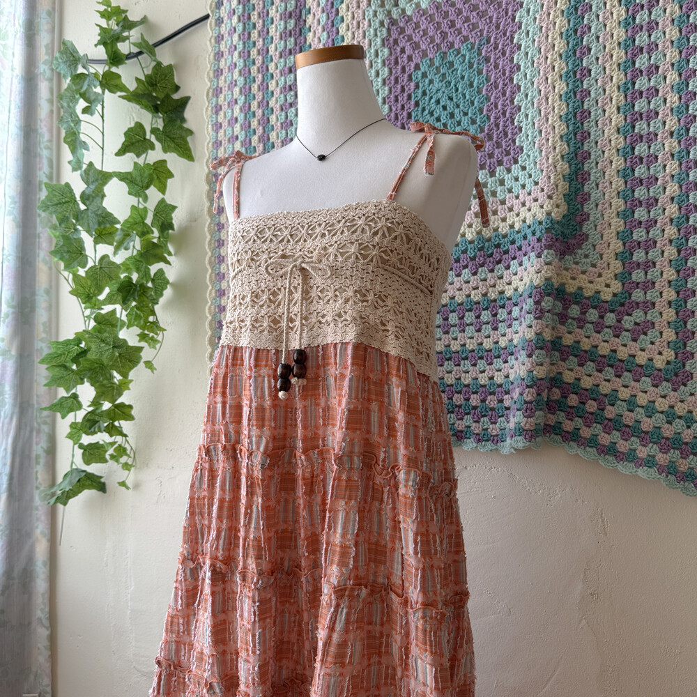 오렌지, 아쿠아블루 등 색감 조합의 사각 무늬 끈원피스예요