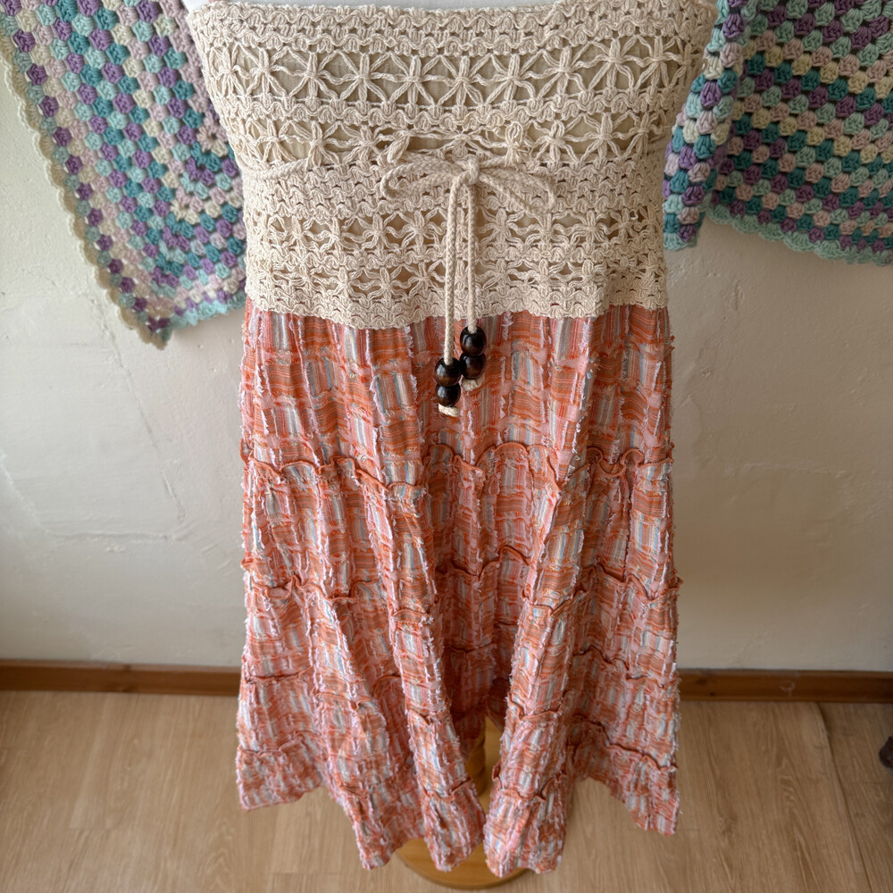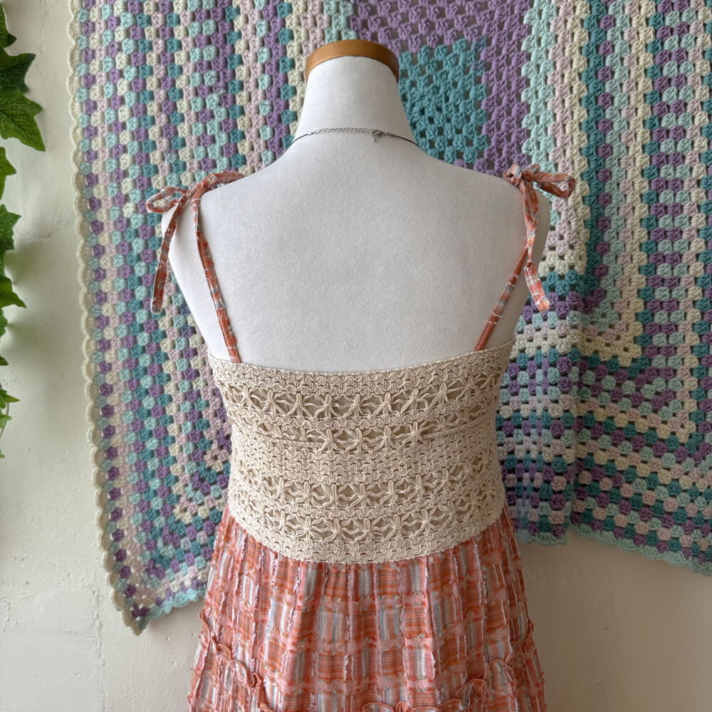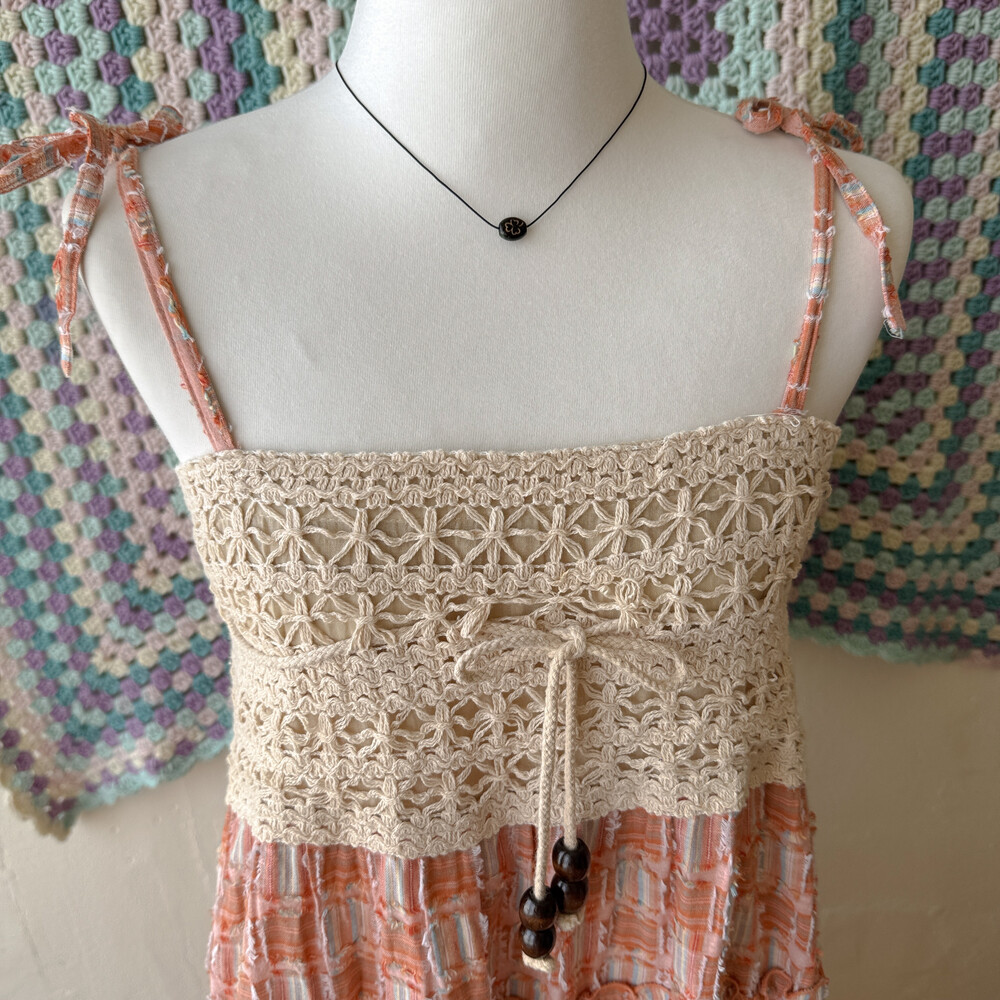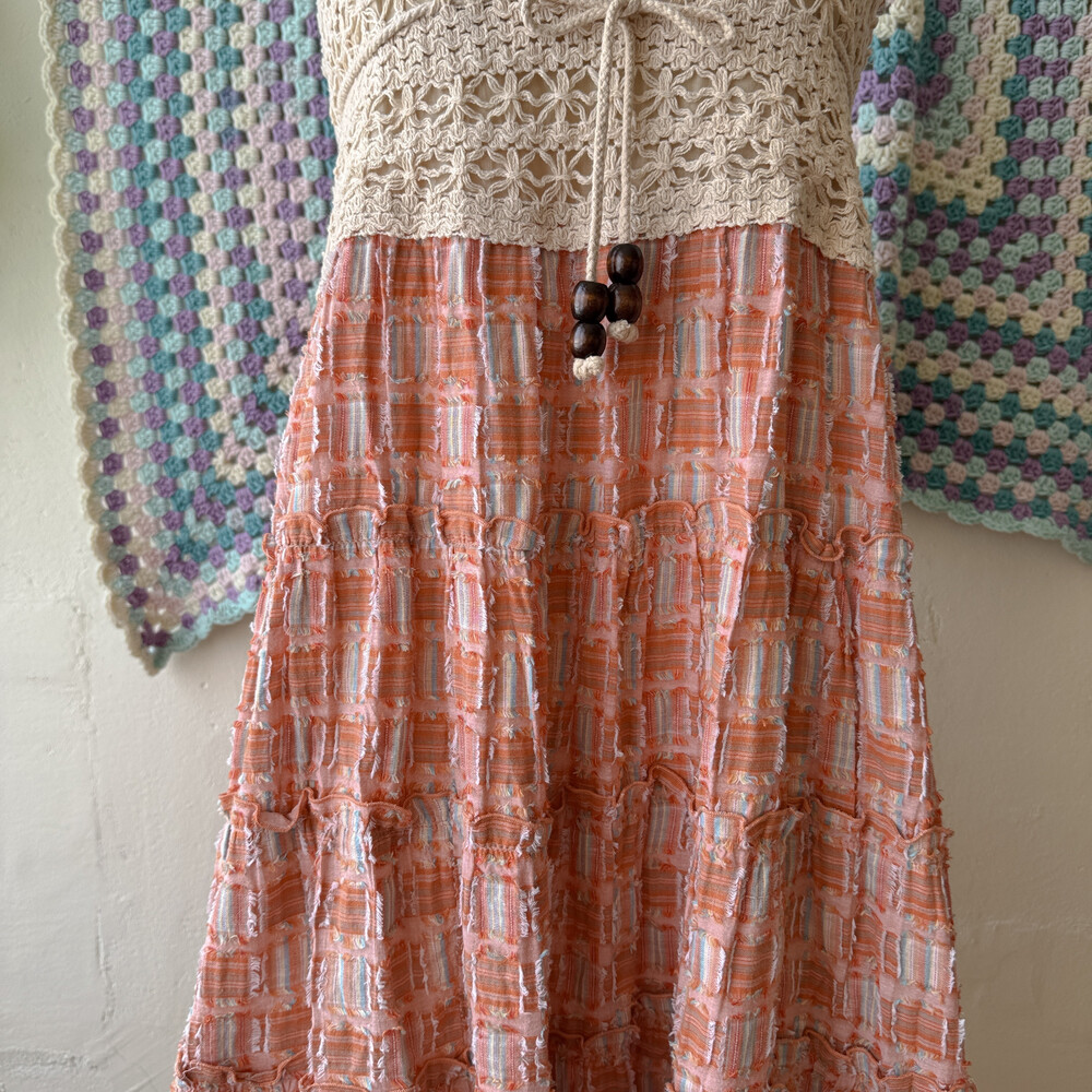 오렌지, 아쿠아블루 등 색감 조합의 사각 무늬 끈원피스예요