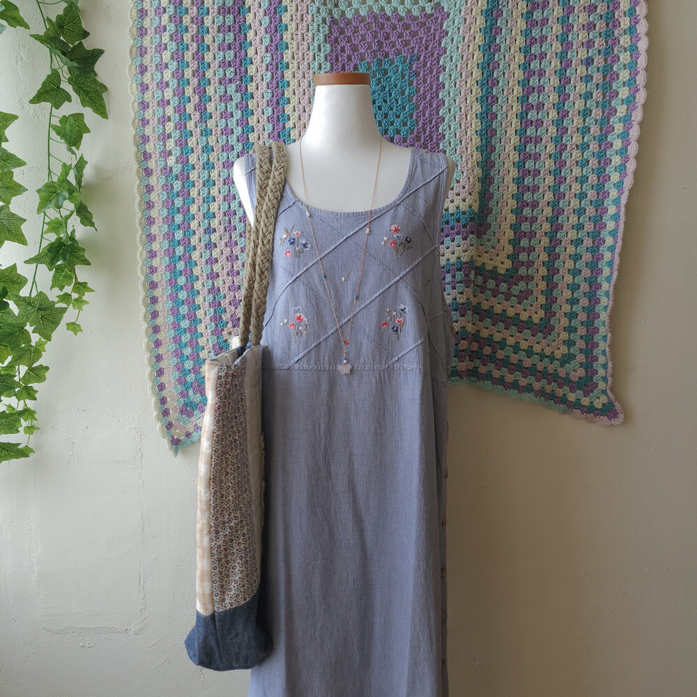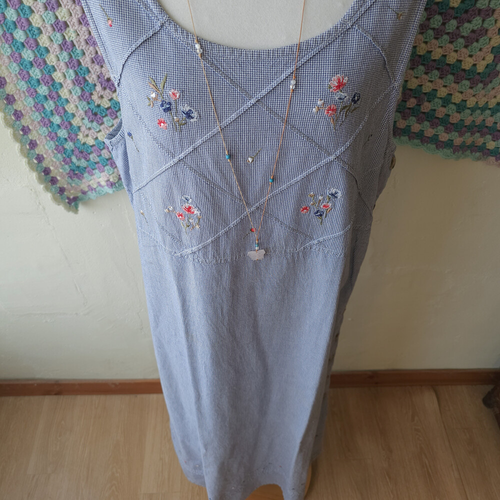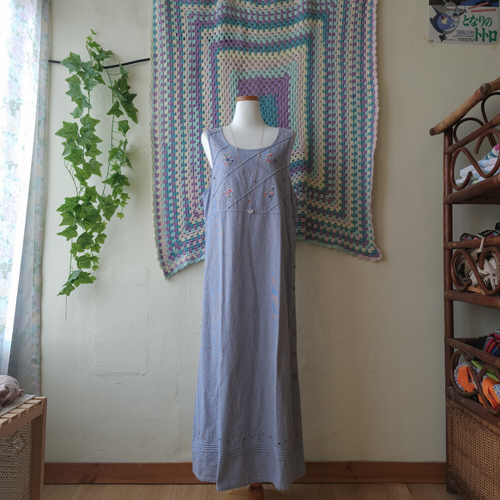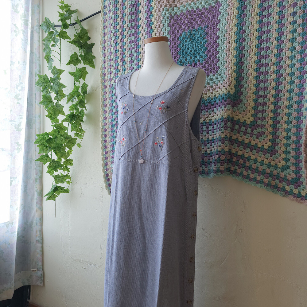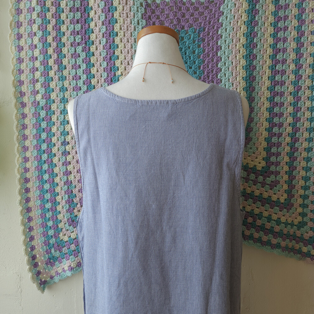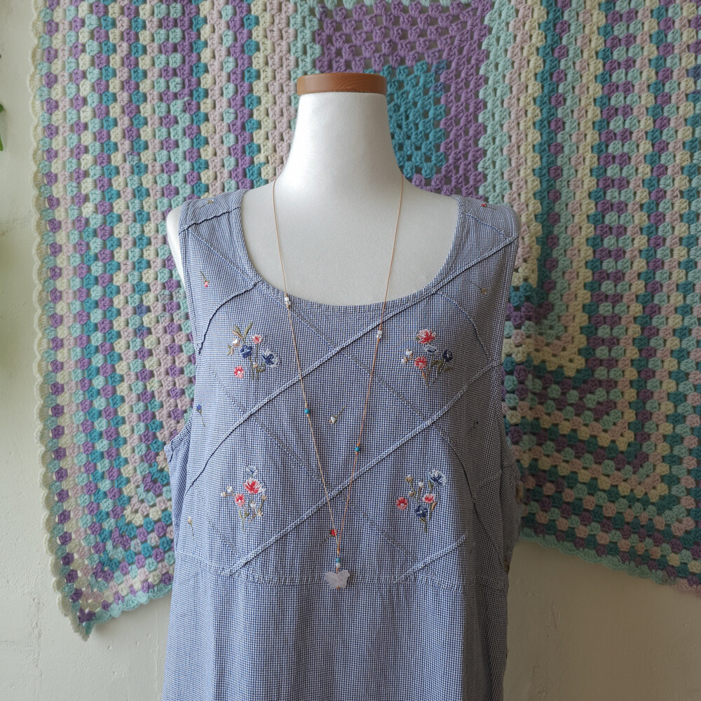 블루 색감의 깅엄체크 민소매 자수 원피스예요