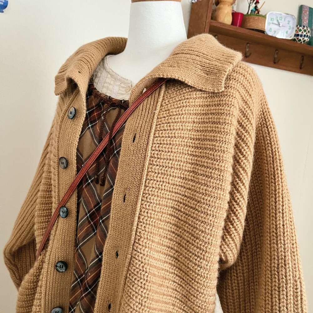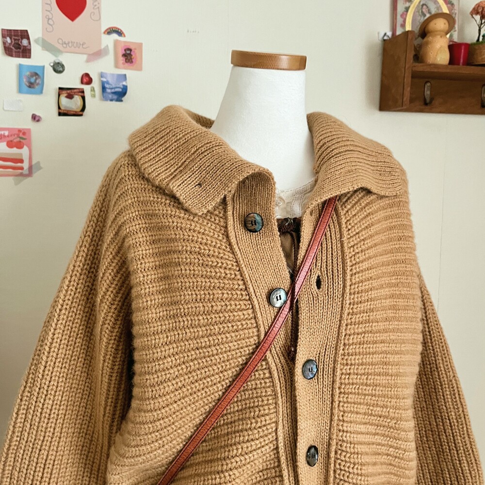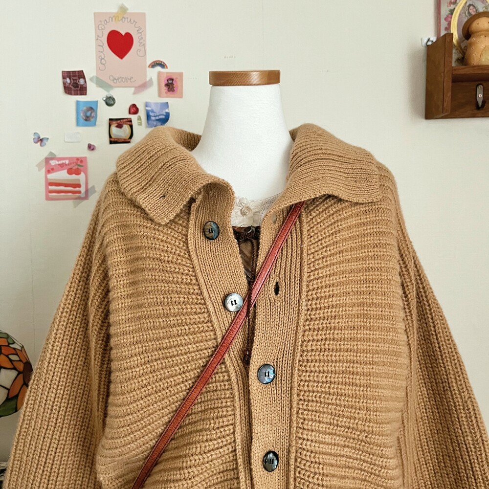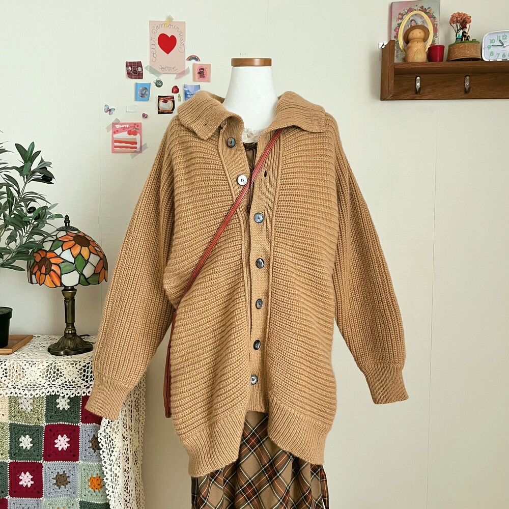 카멜 색감의 오버사이즈 카라 가디건이에요