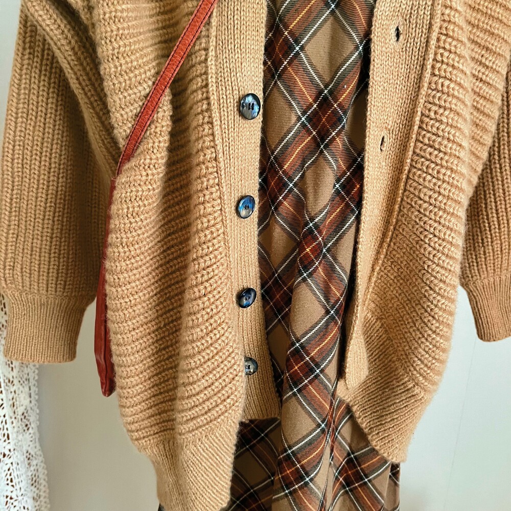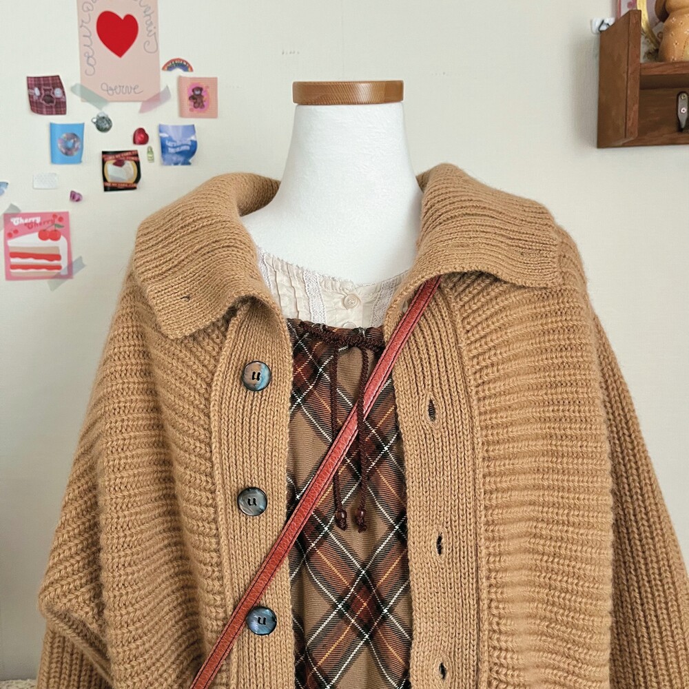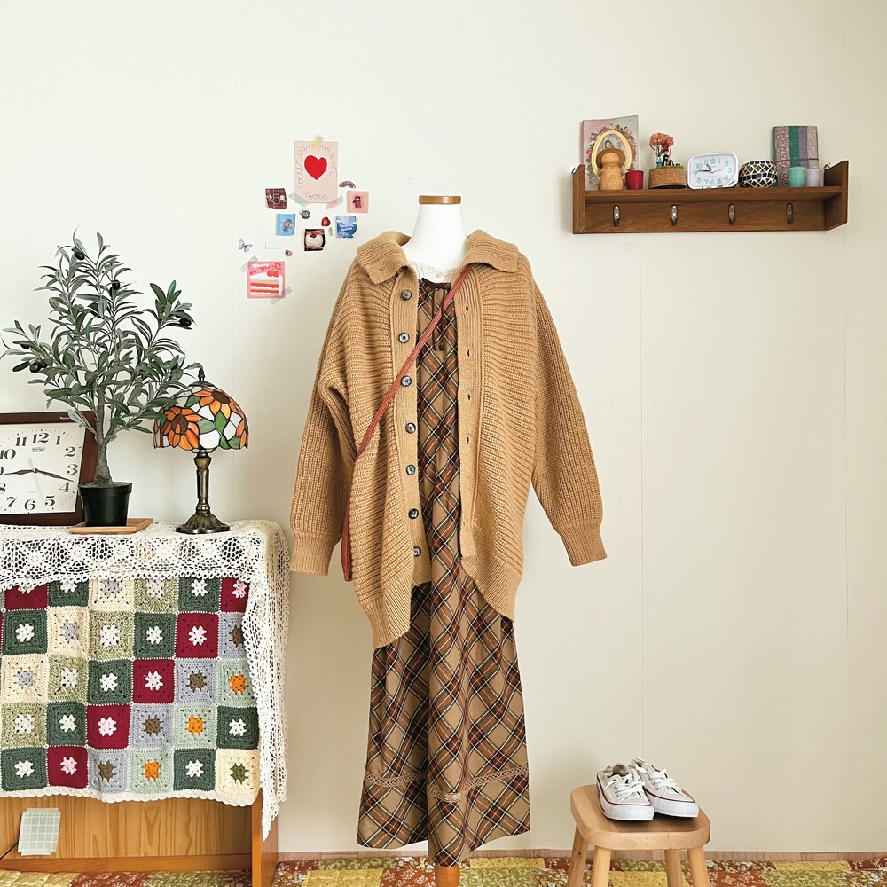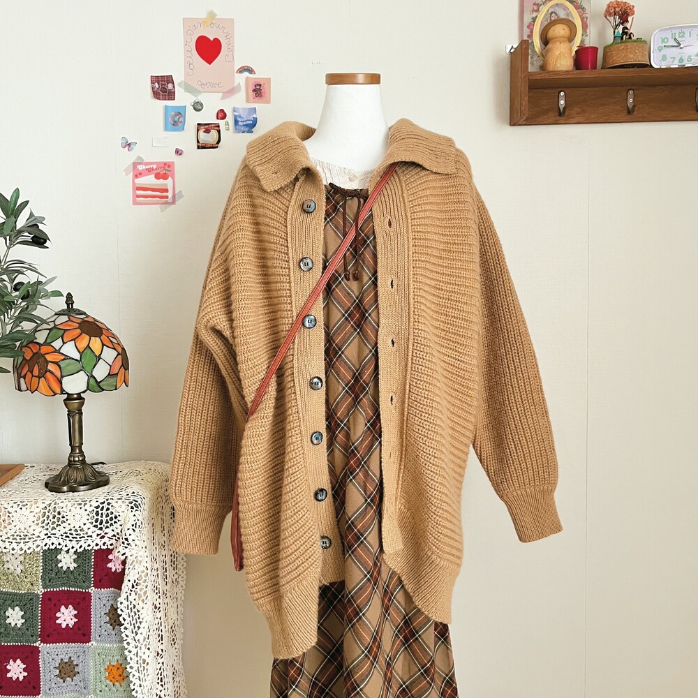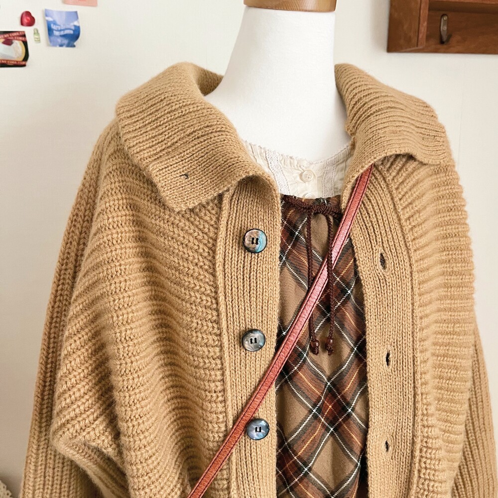 카멜 색감의 오버사이즈 카라 가디건이에요