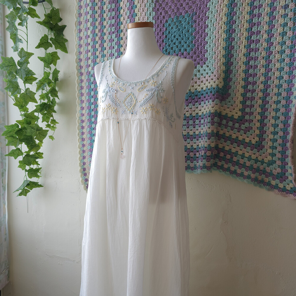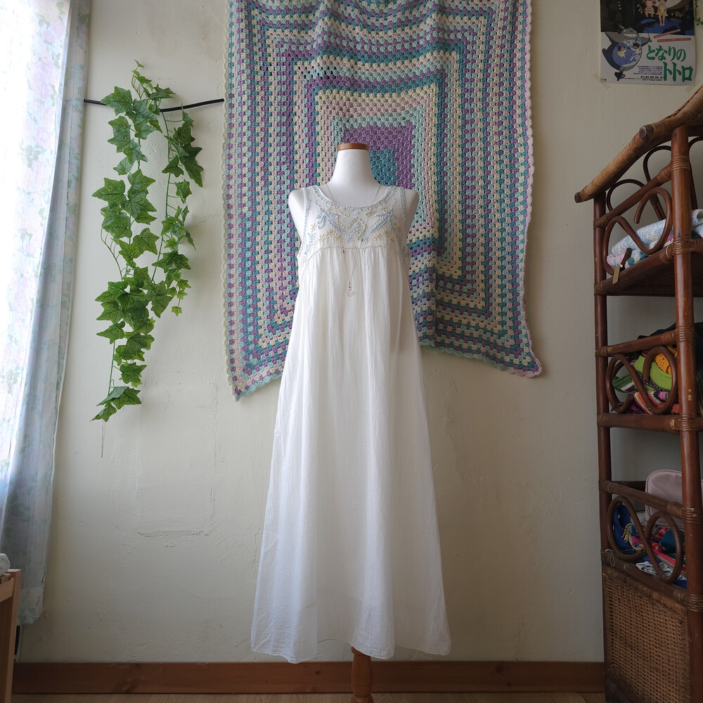파스텔 자수 포인트의 민소매 원피스예요