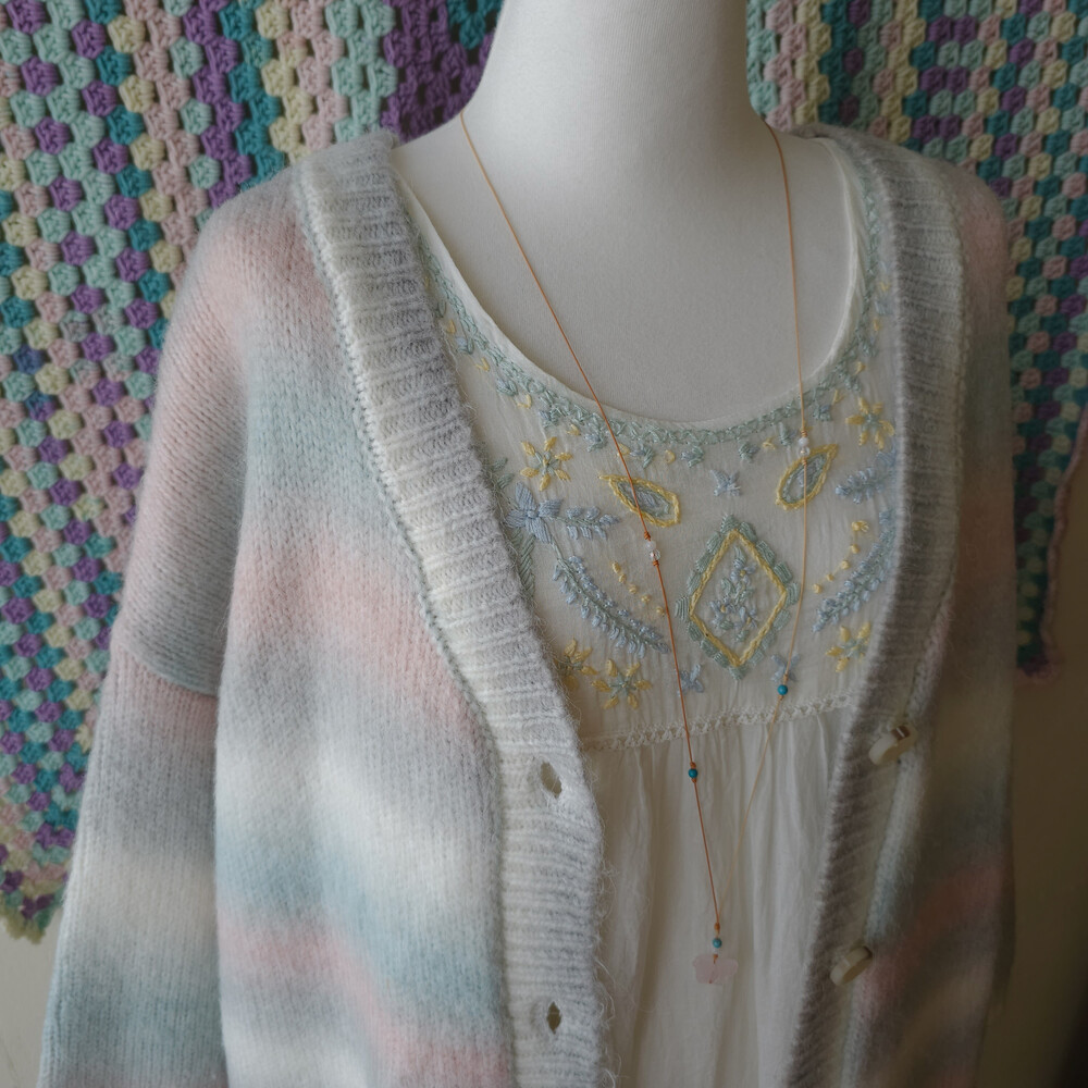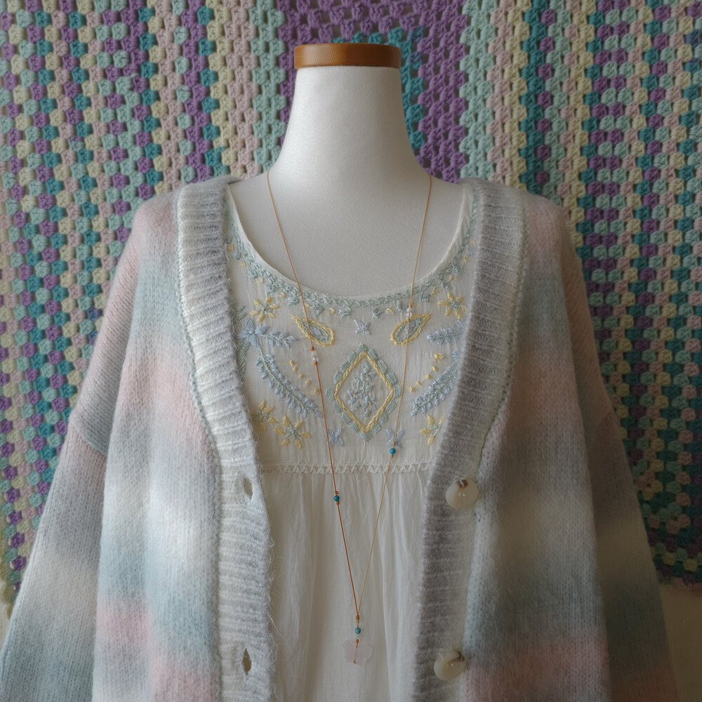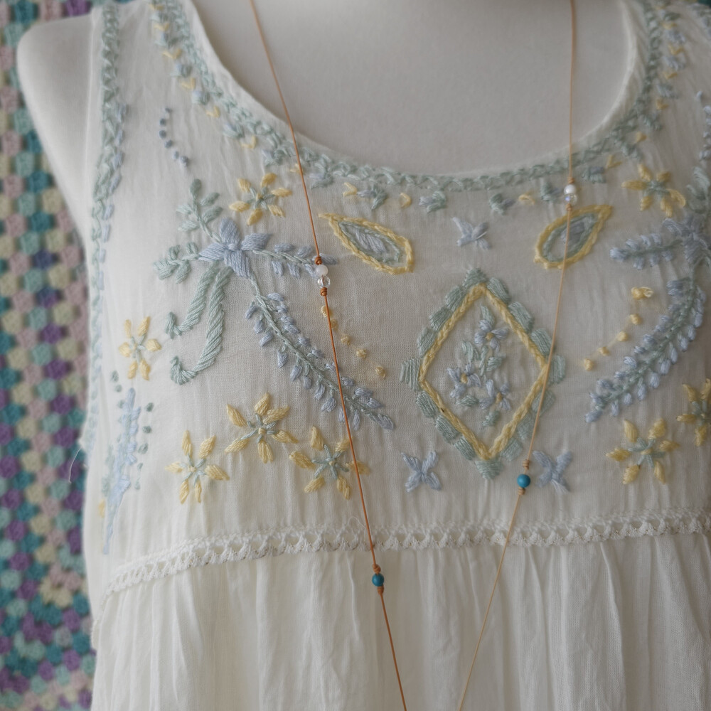화이트 바탕에 민트, 블루, 레몬 색감의 자수 포인트가 가득 들어간