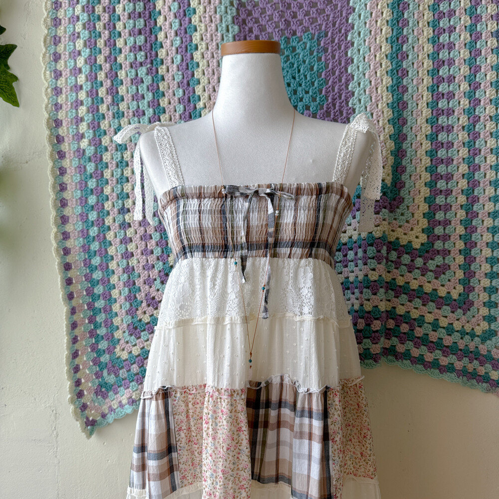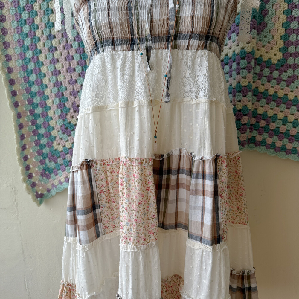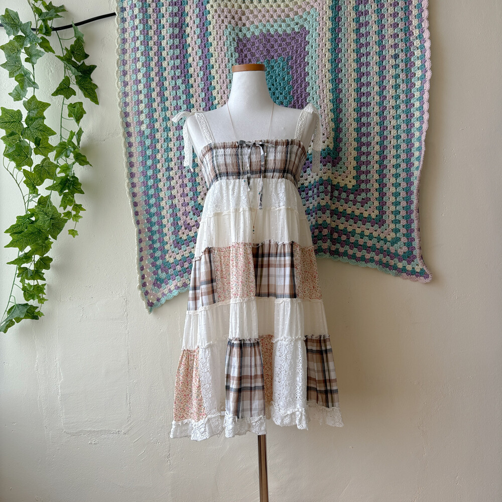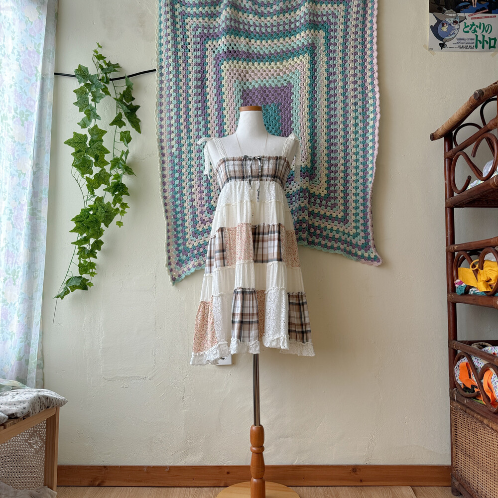 웜한 색감의 체크, 플라워 패치 끈원피스예요