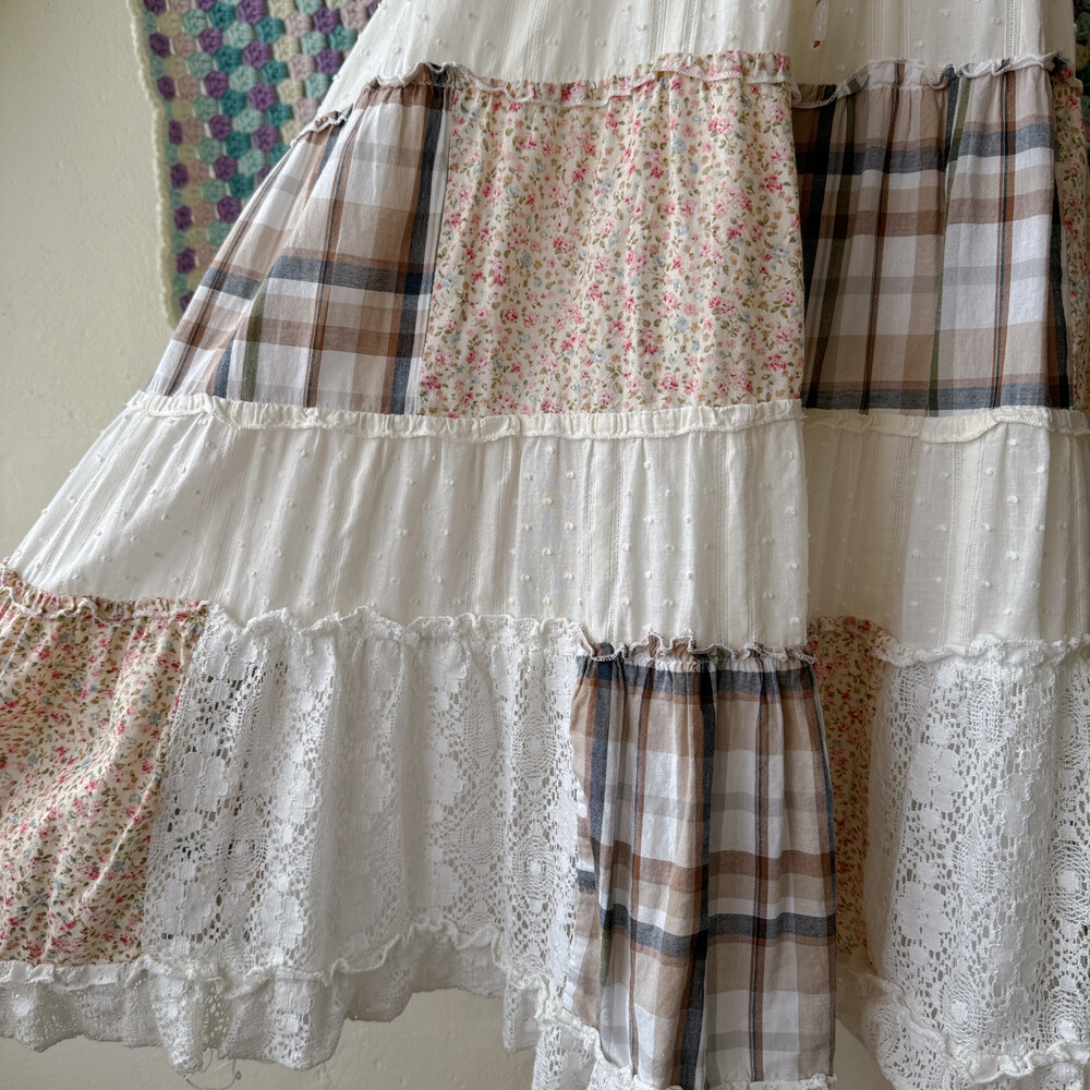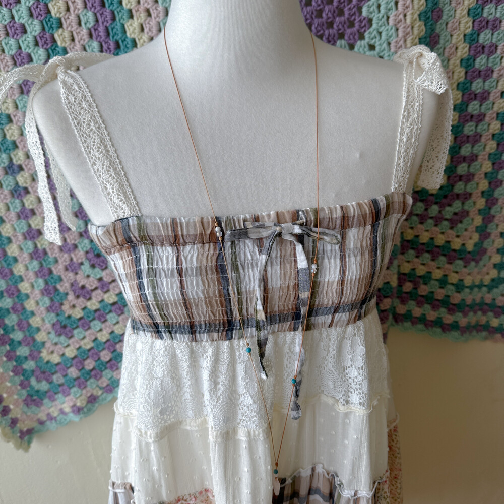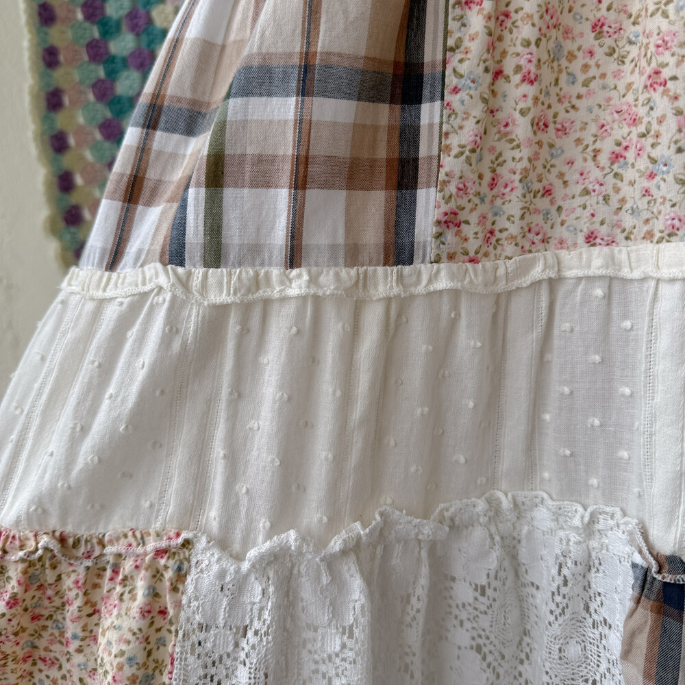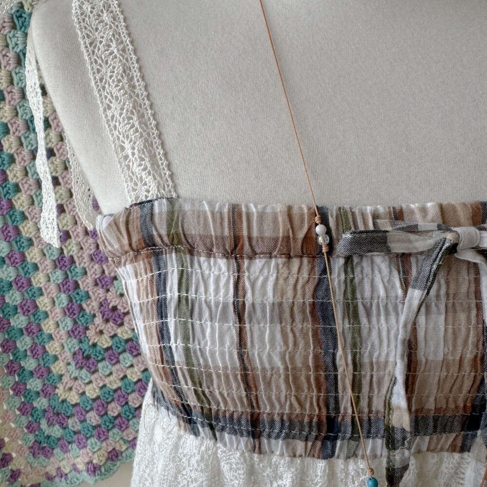 웜한 색감의 체크, 플라워 패치 끈원피스예요