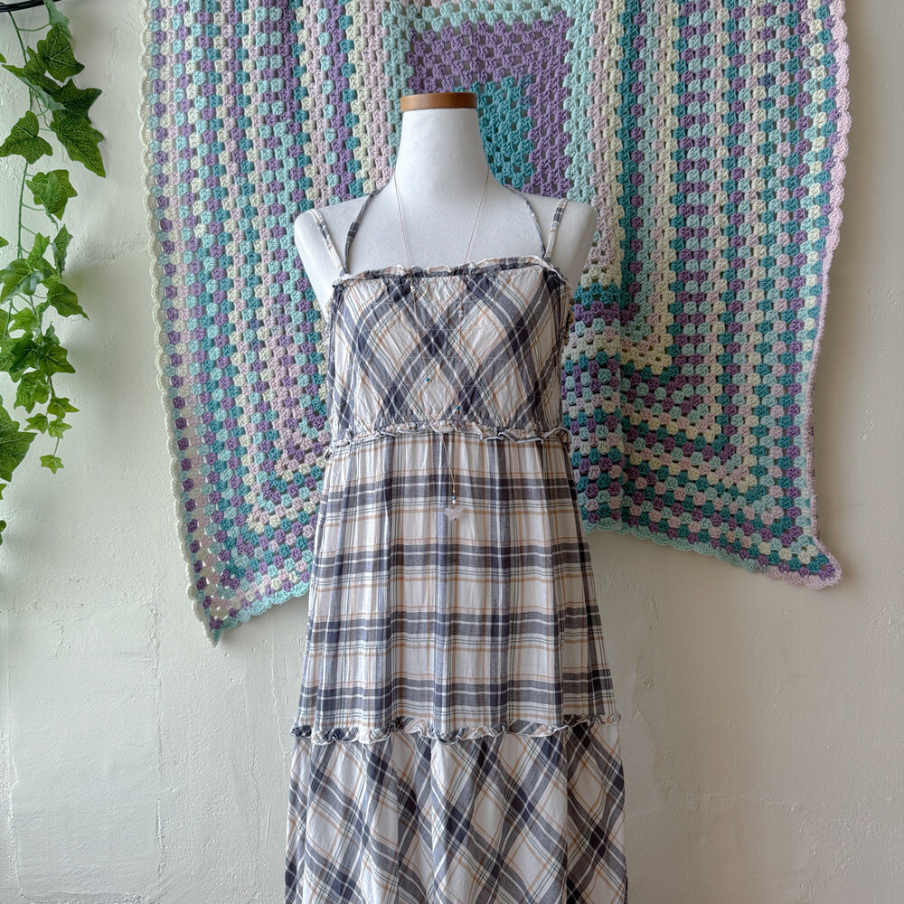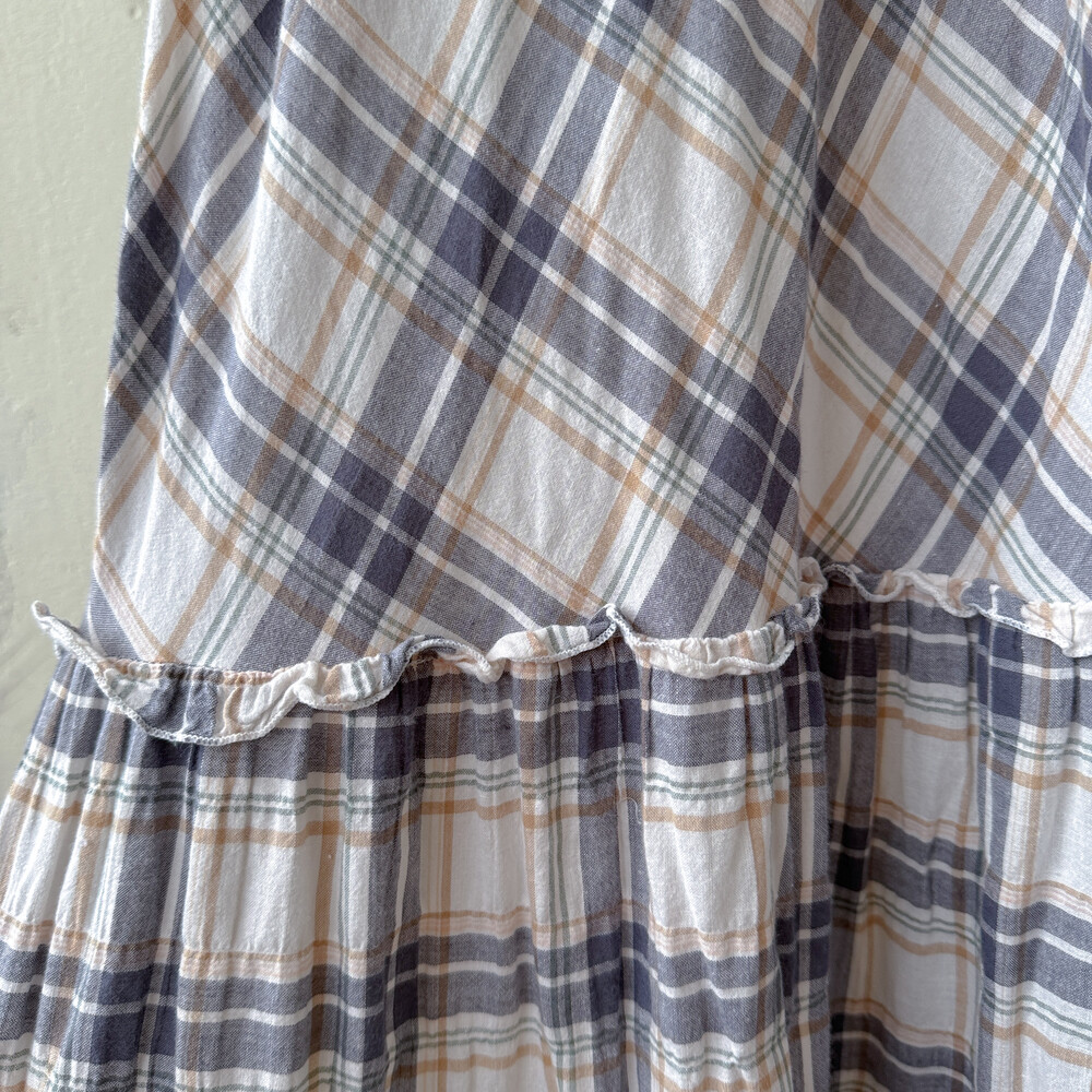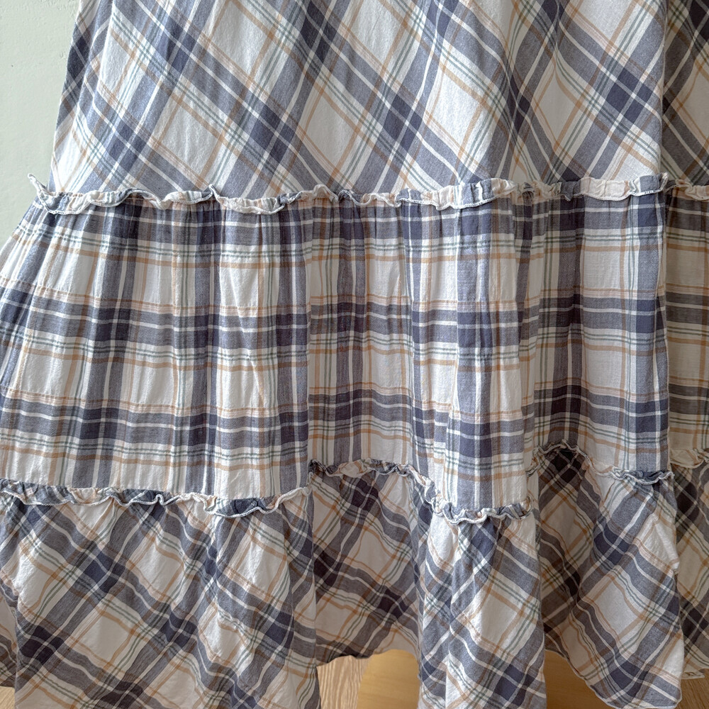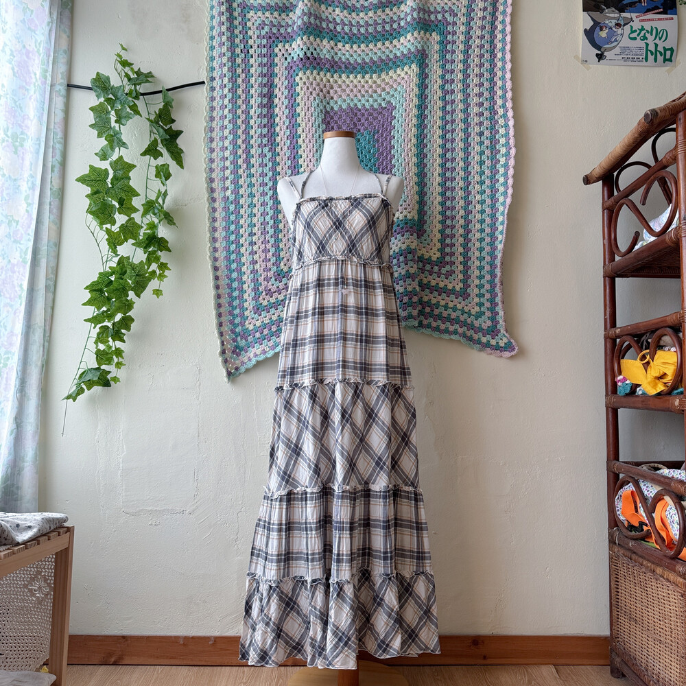 네이비, 베이지 색감 조합의 체크 끈원피스예요