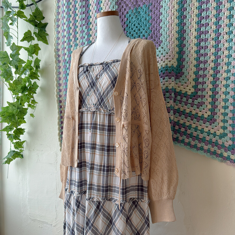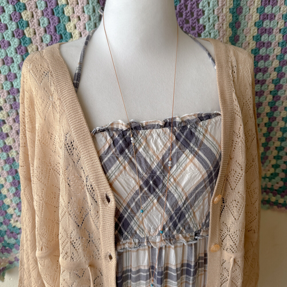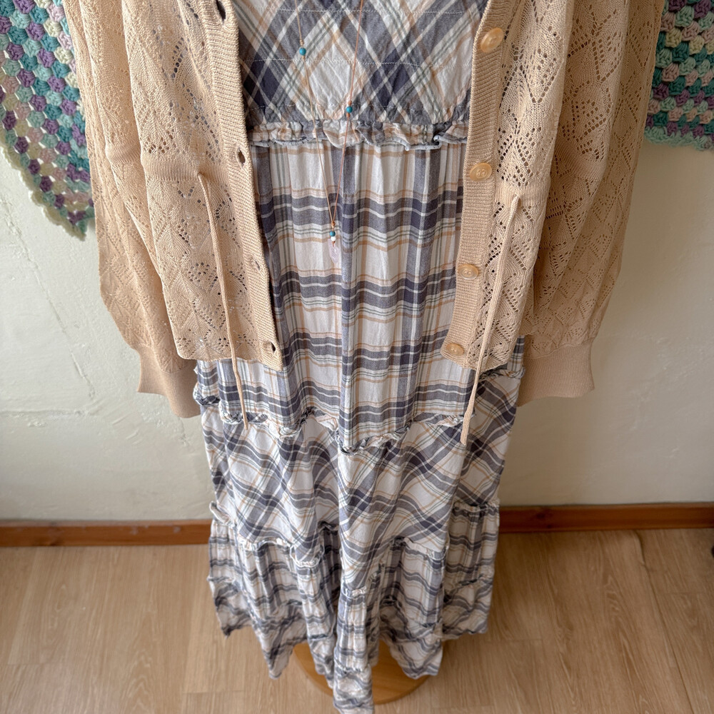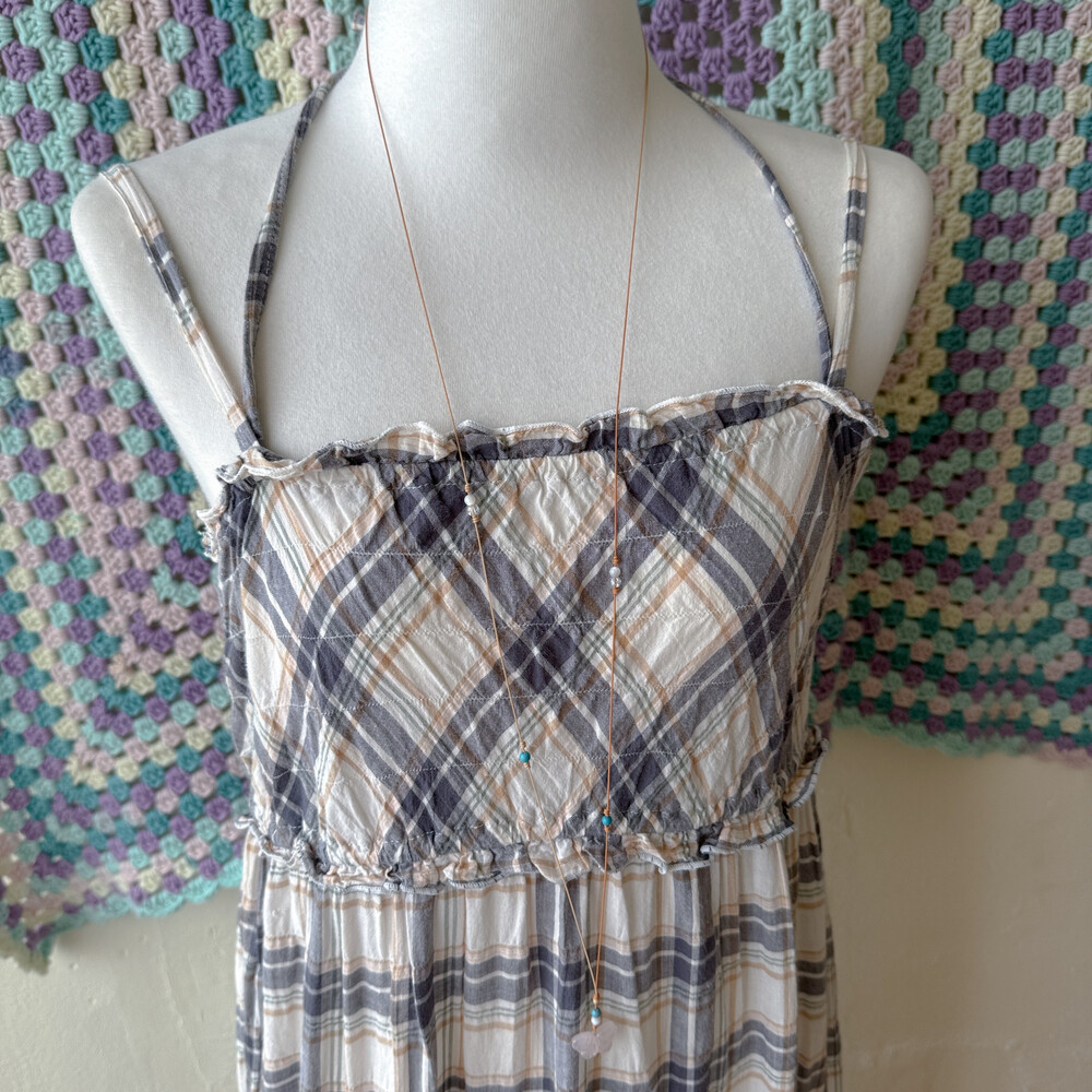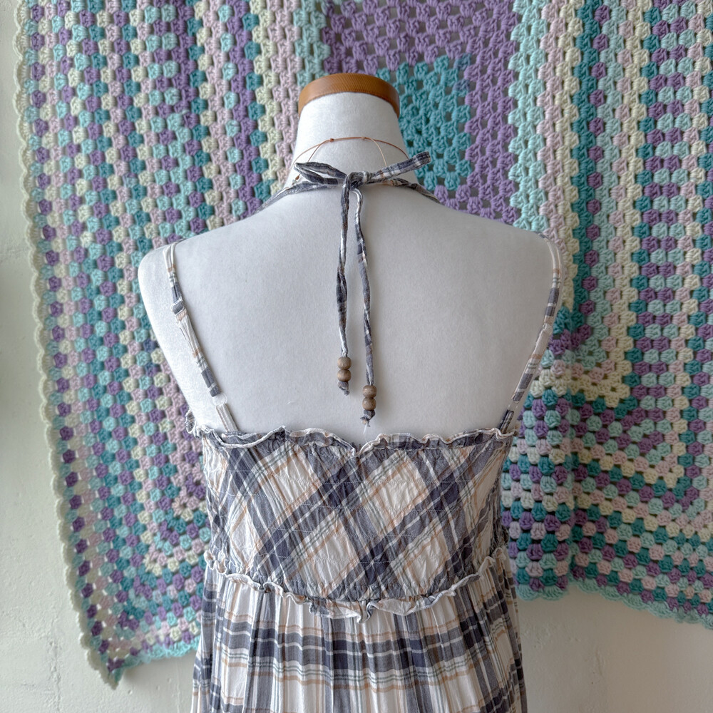 네이비, 베이지 색감 조합의 체크 끈원피스예요