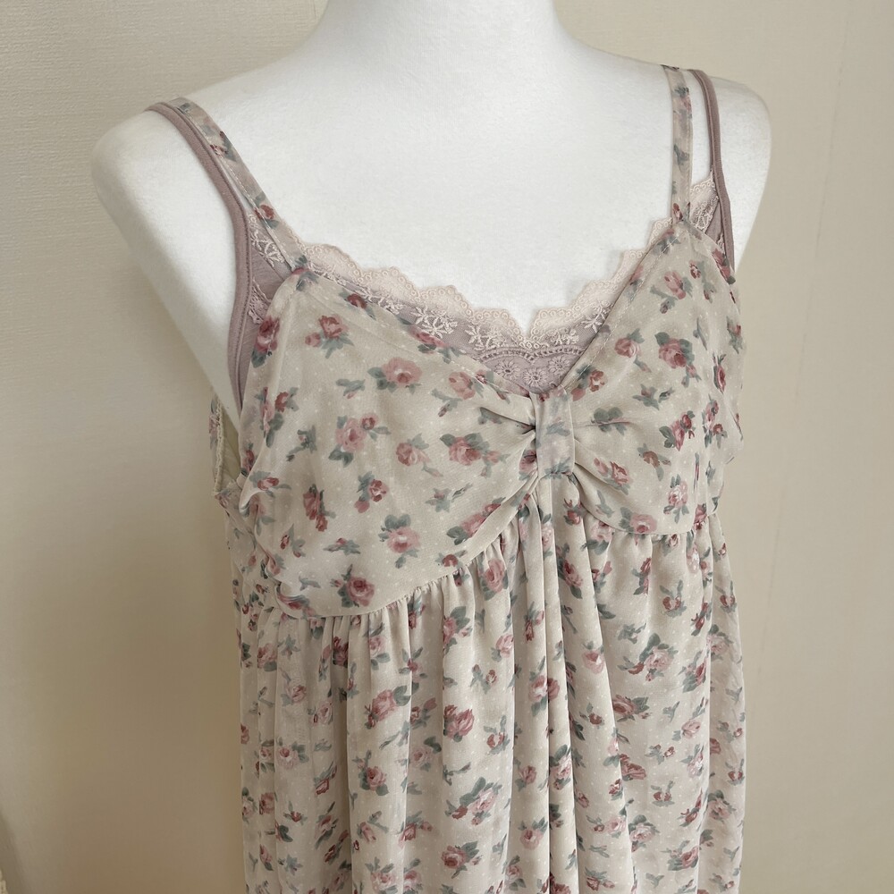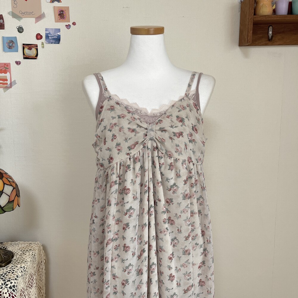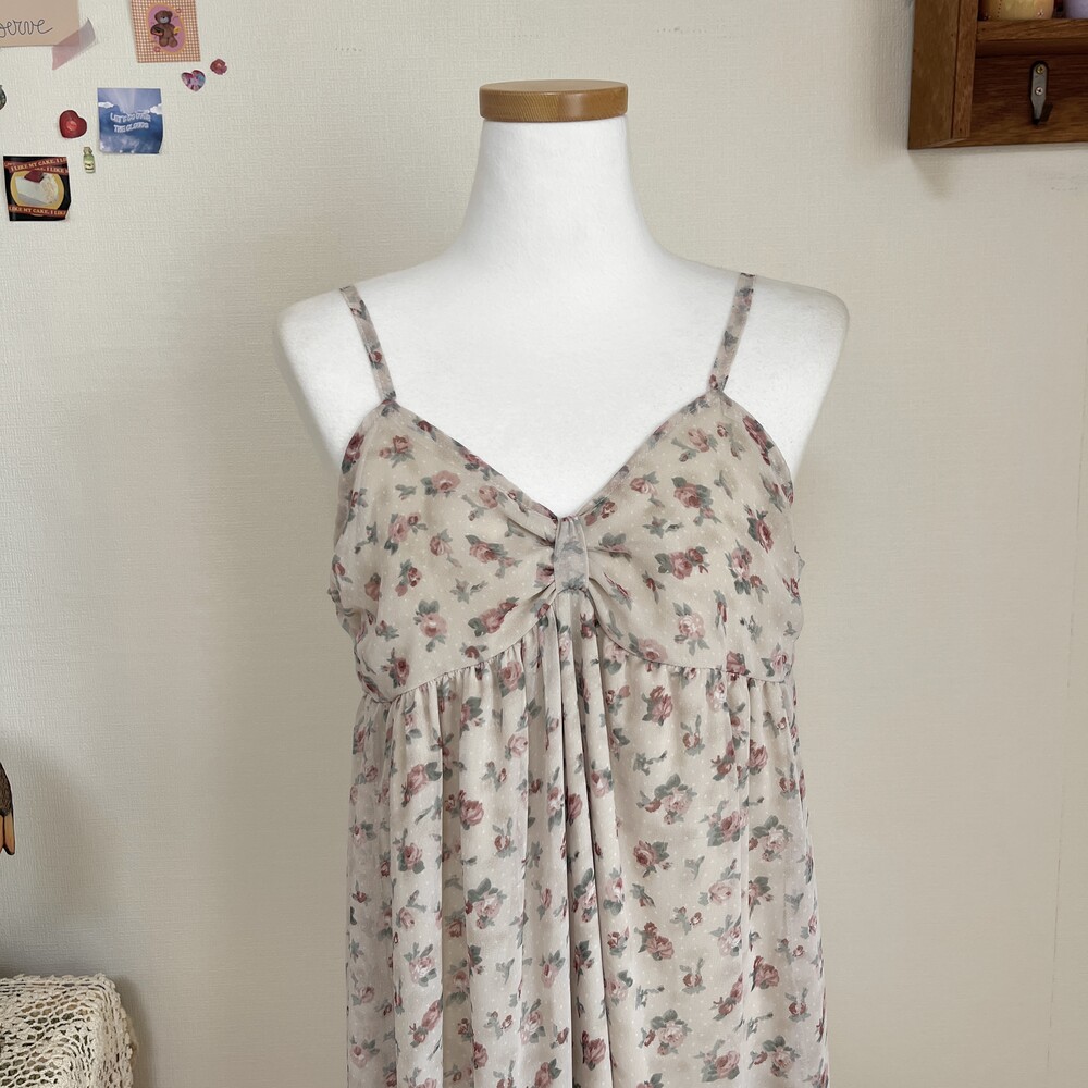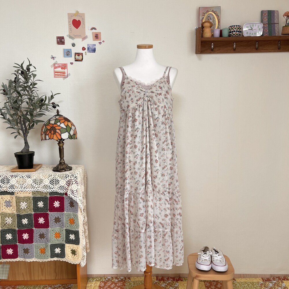 베이지 색감에 분홍 꽃 패턴인 브이넥 끈원피스예요