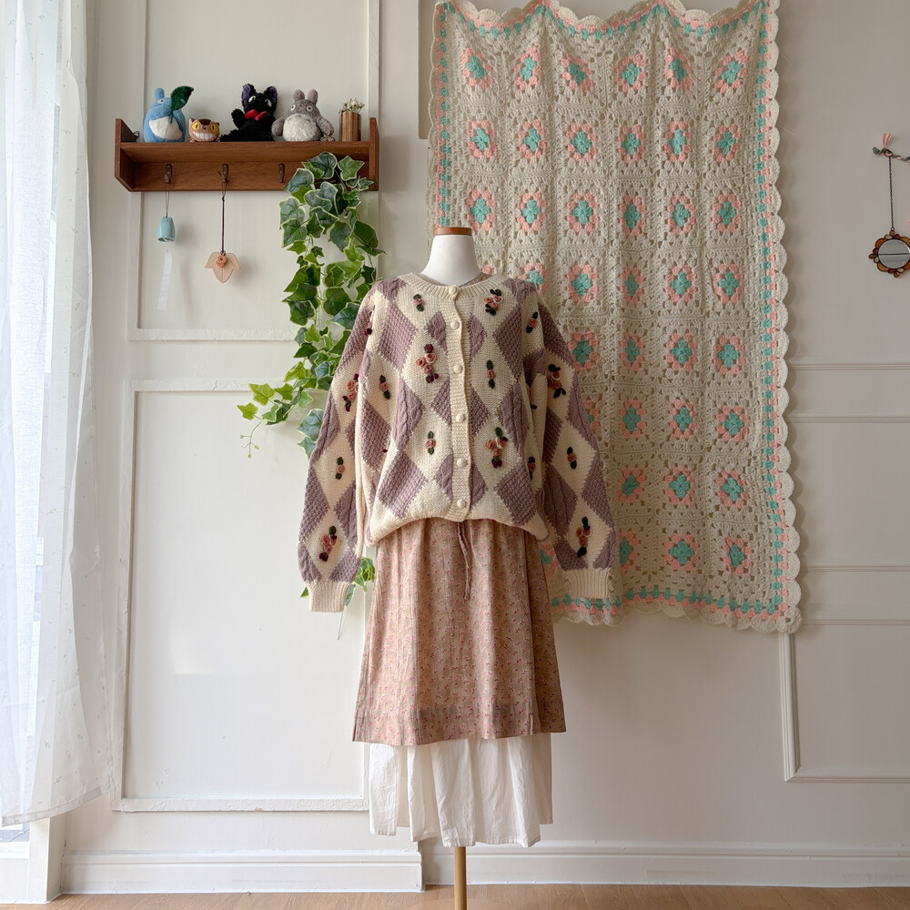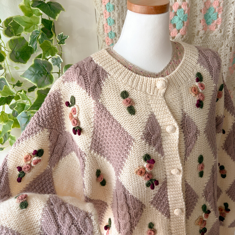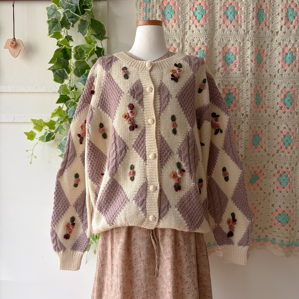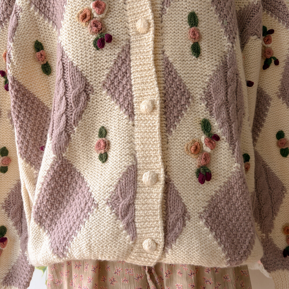 꽃모티브 포인트가 들어간 아가일 가디건이에요