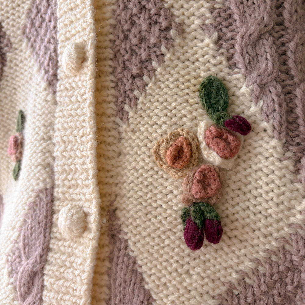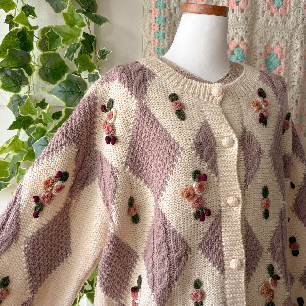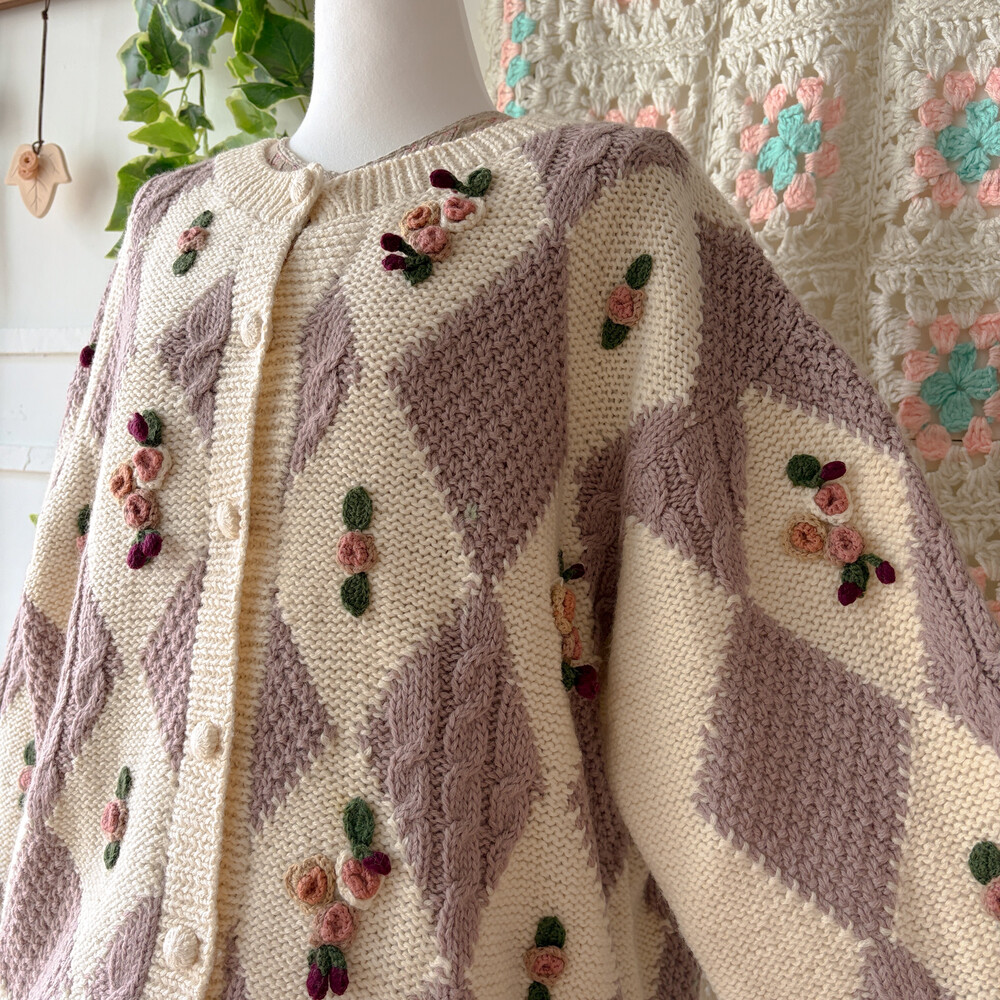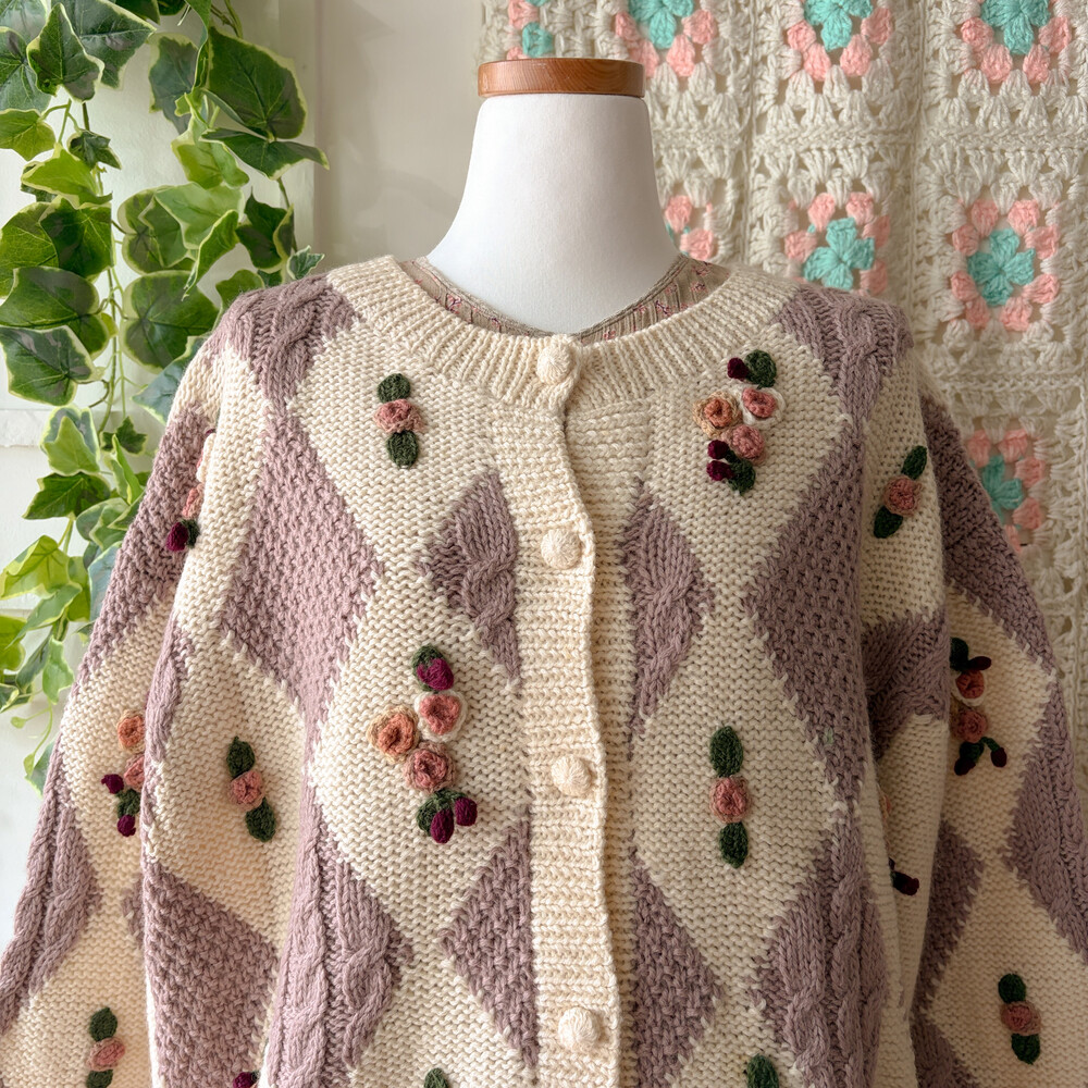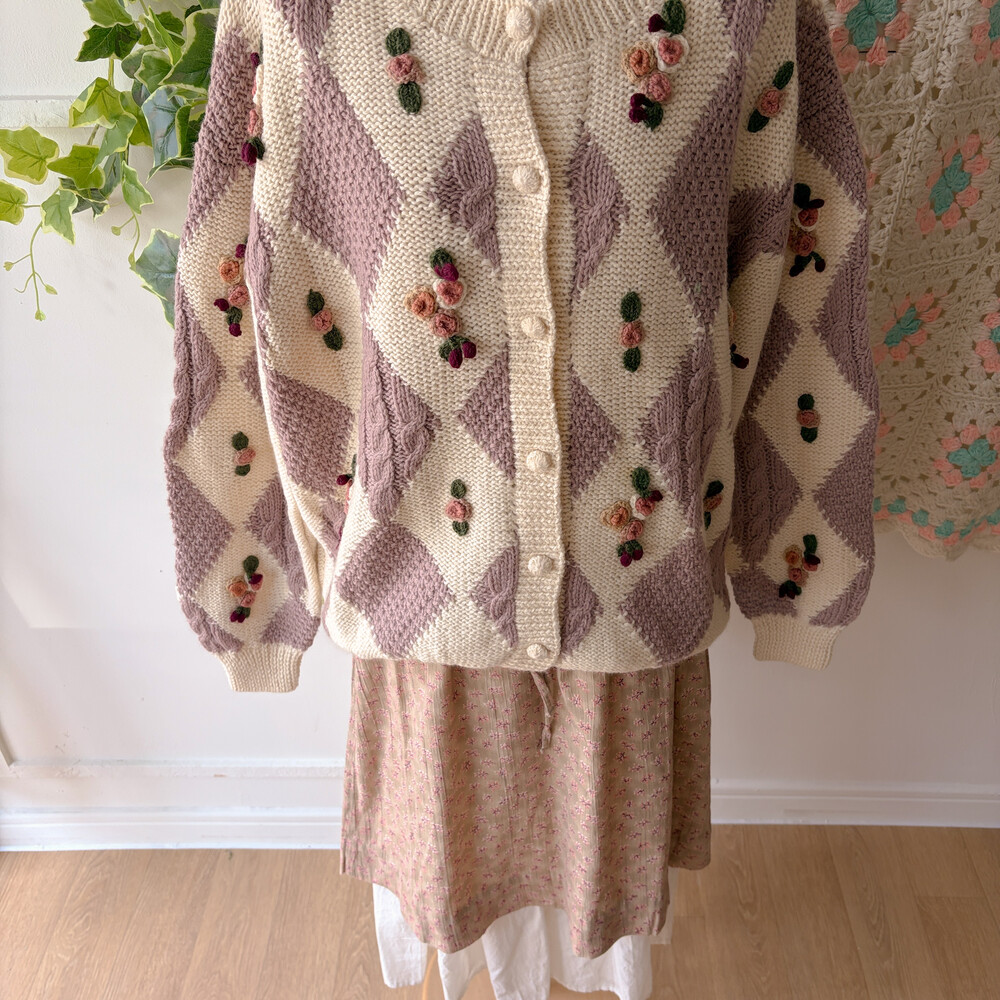 꽃모티브 포인트가 들어간 아가일 가디건이에요