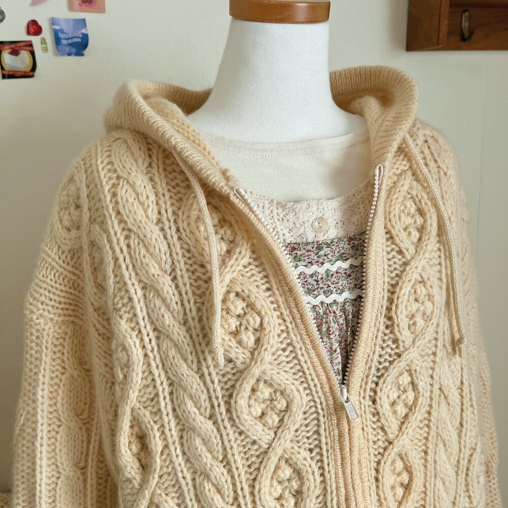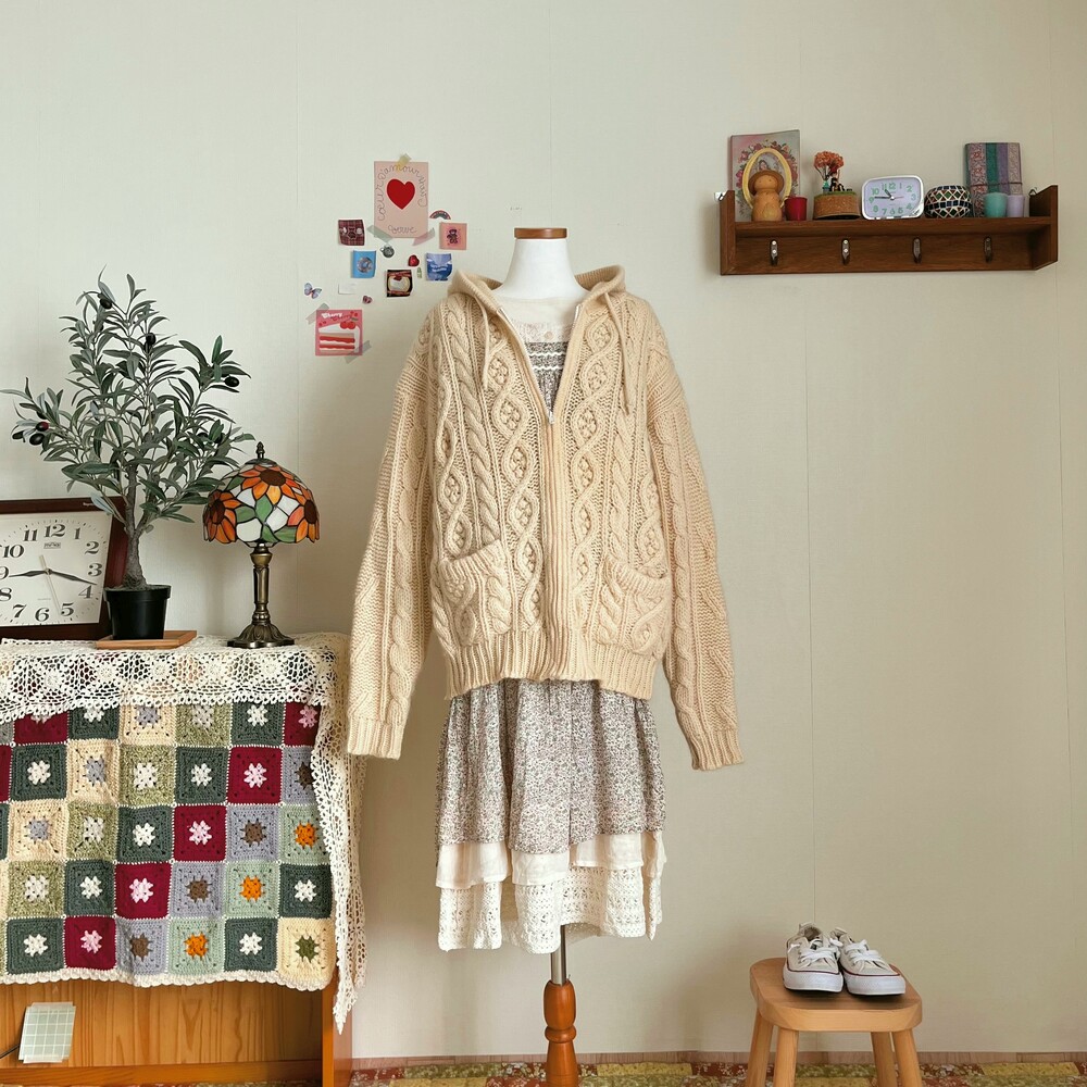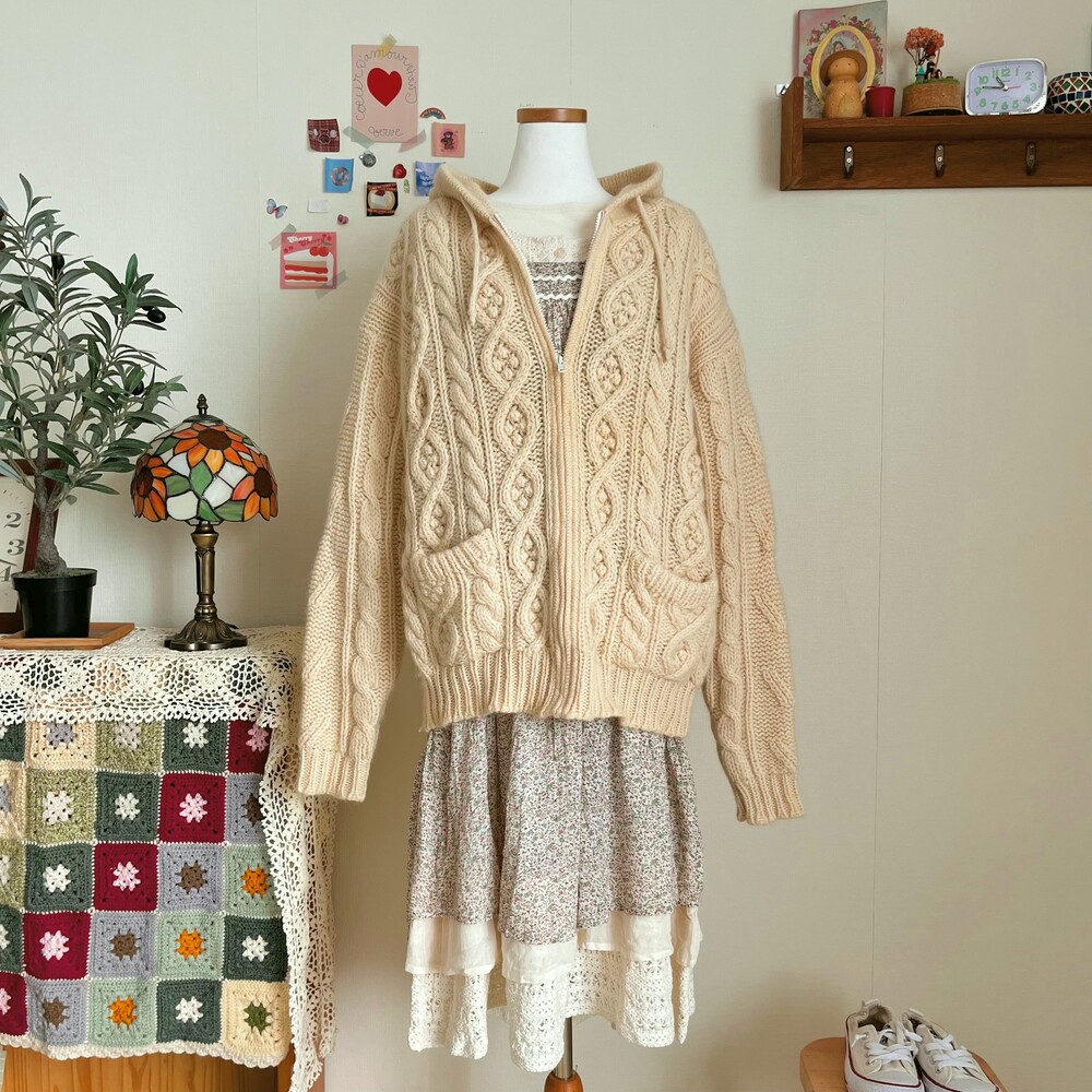 아이보리 색감의 폼폼 후드 집업 가디건이에요