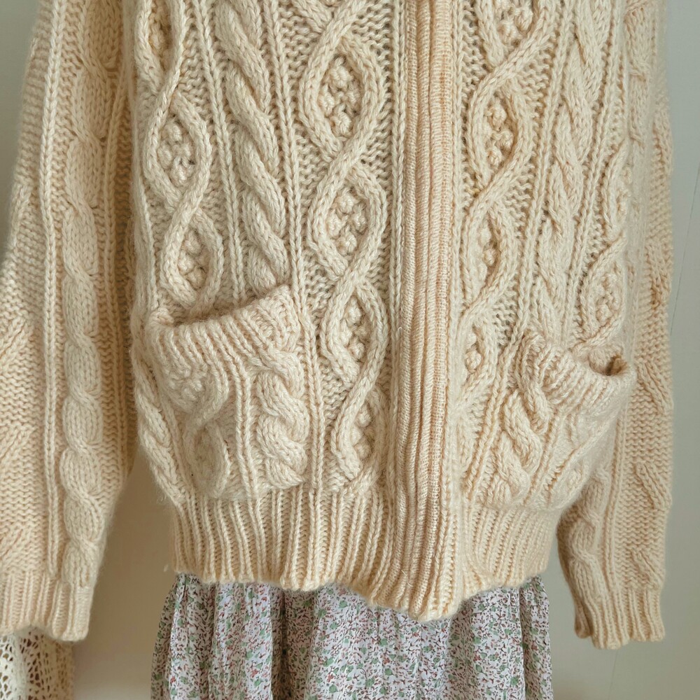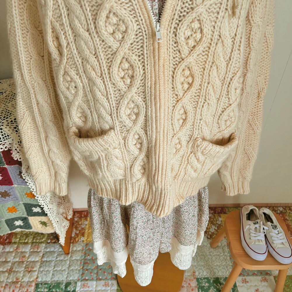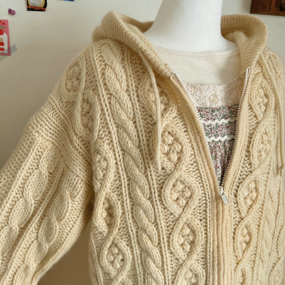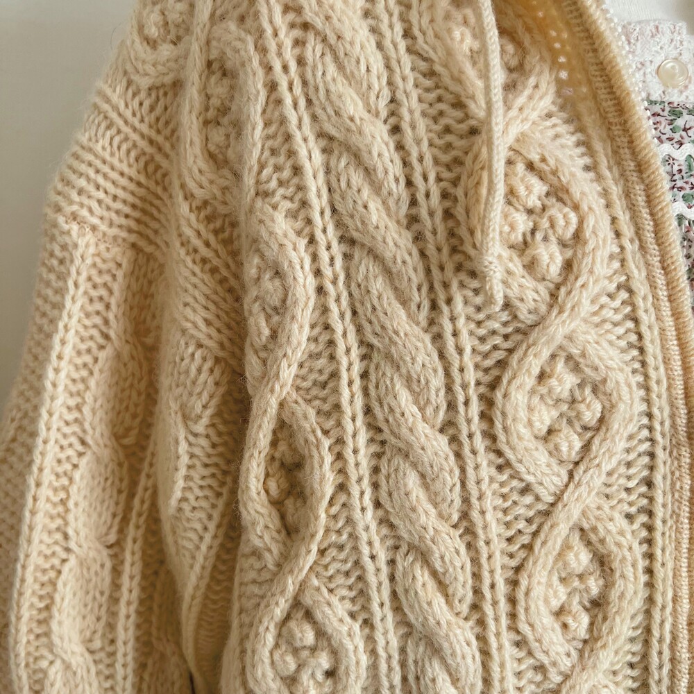아이보리 색감의 폼폼 후드 집업 가디건이에요