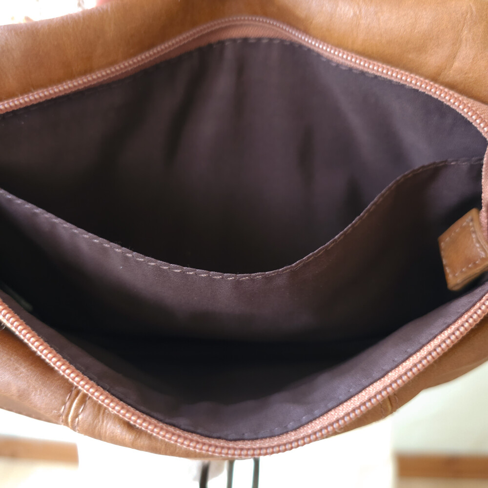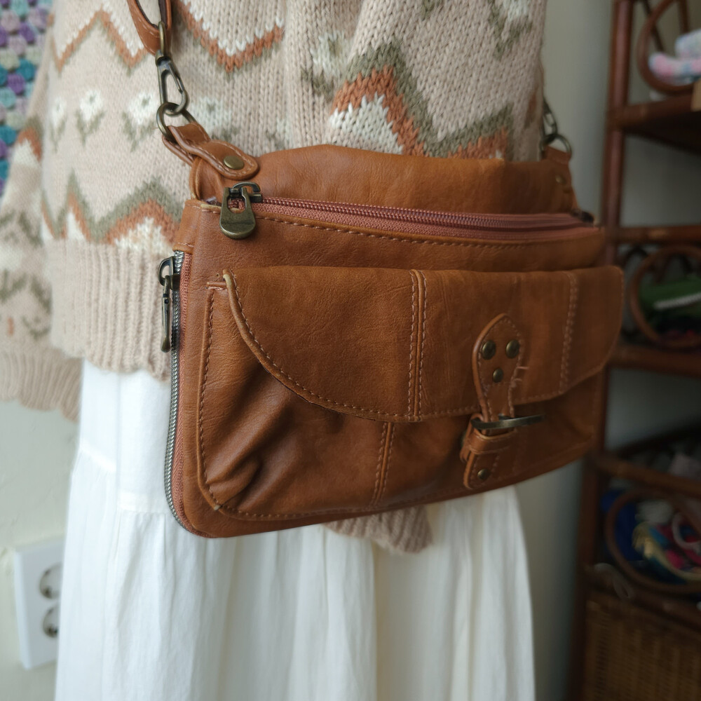 브라운 색감의 가죽 미니 크로스백이에요
