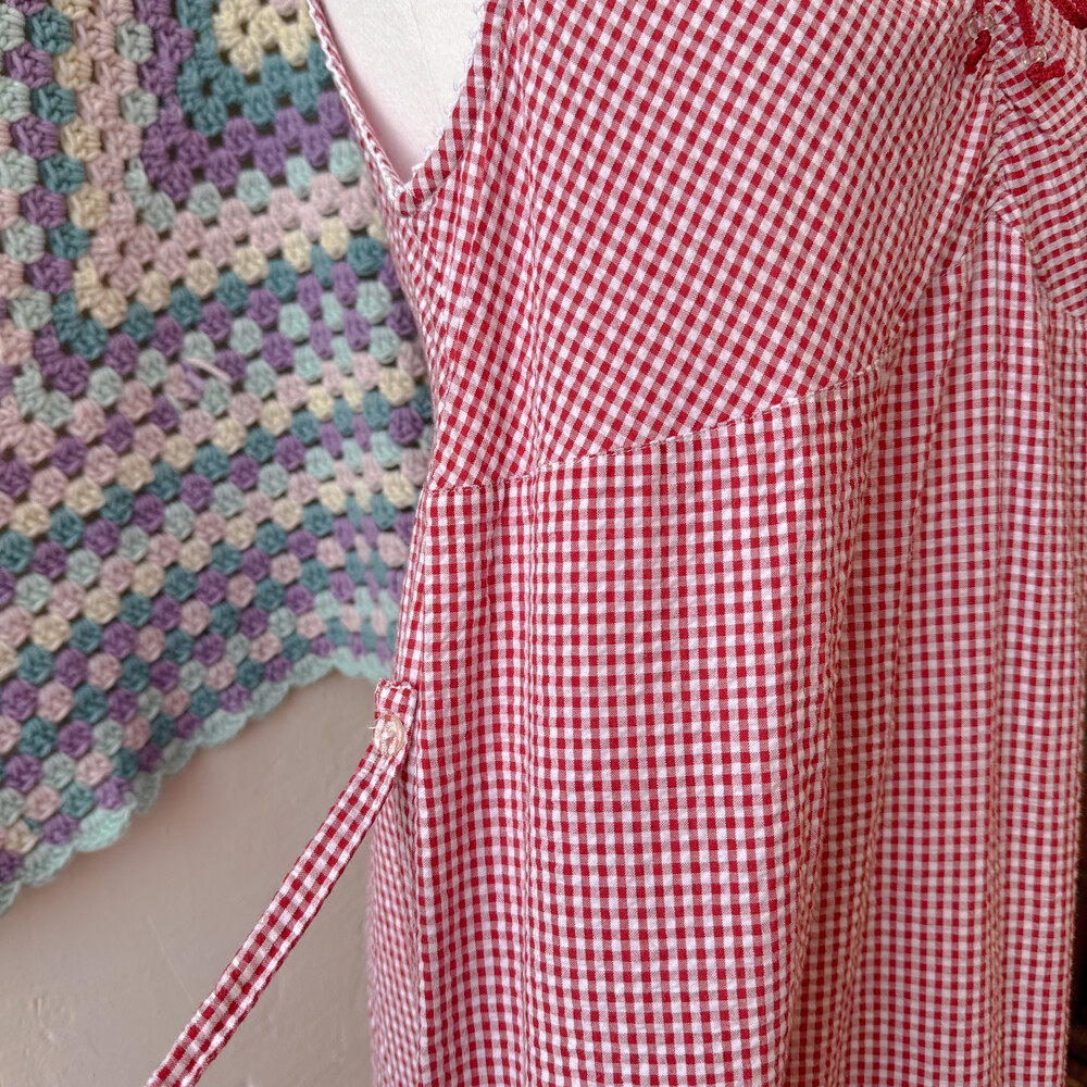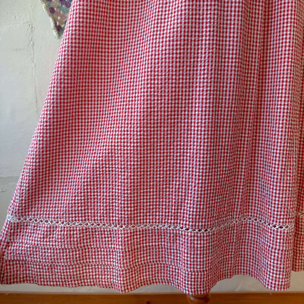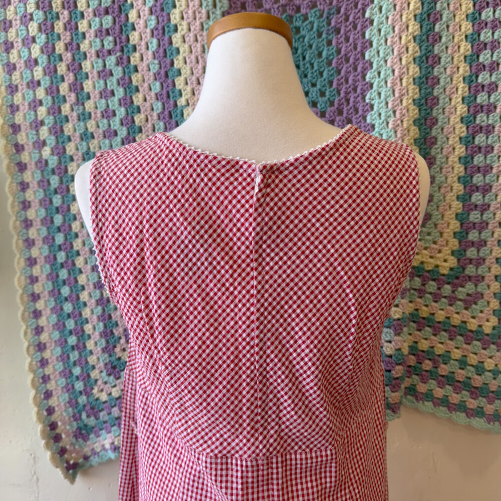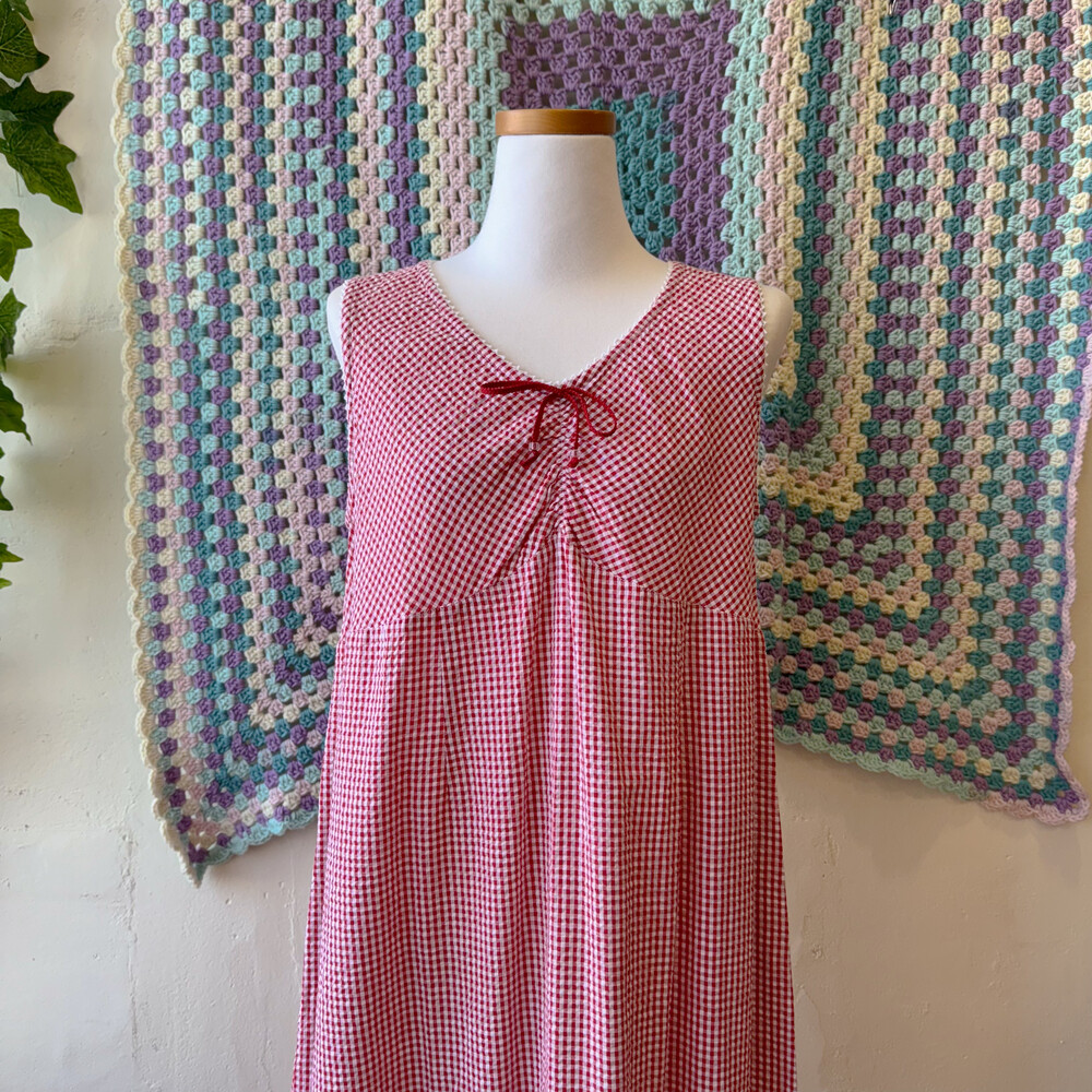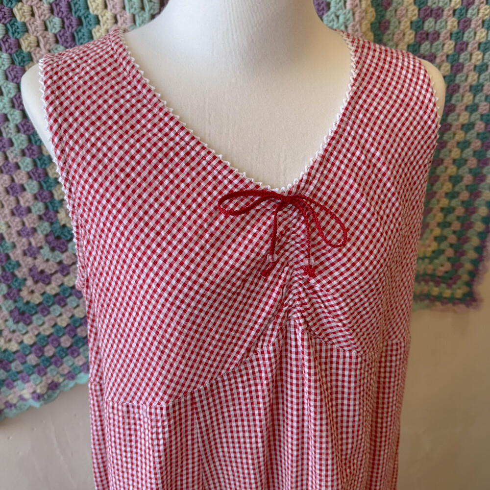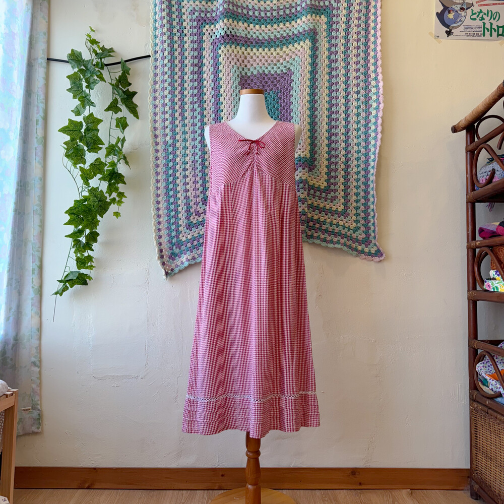 레드 색감의 체크 브이넥 민소매 원피스예요