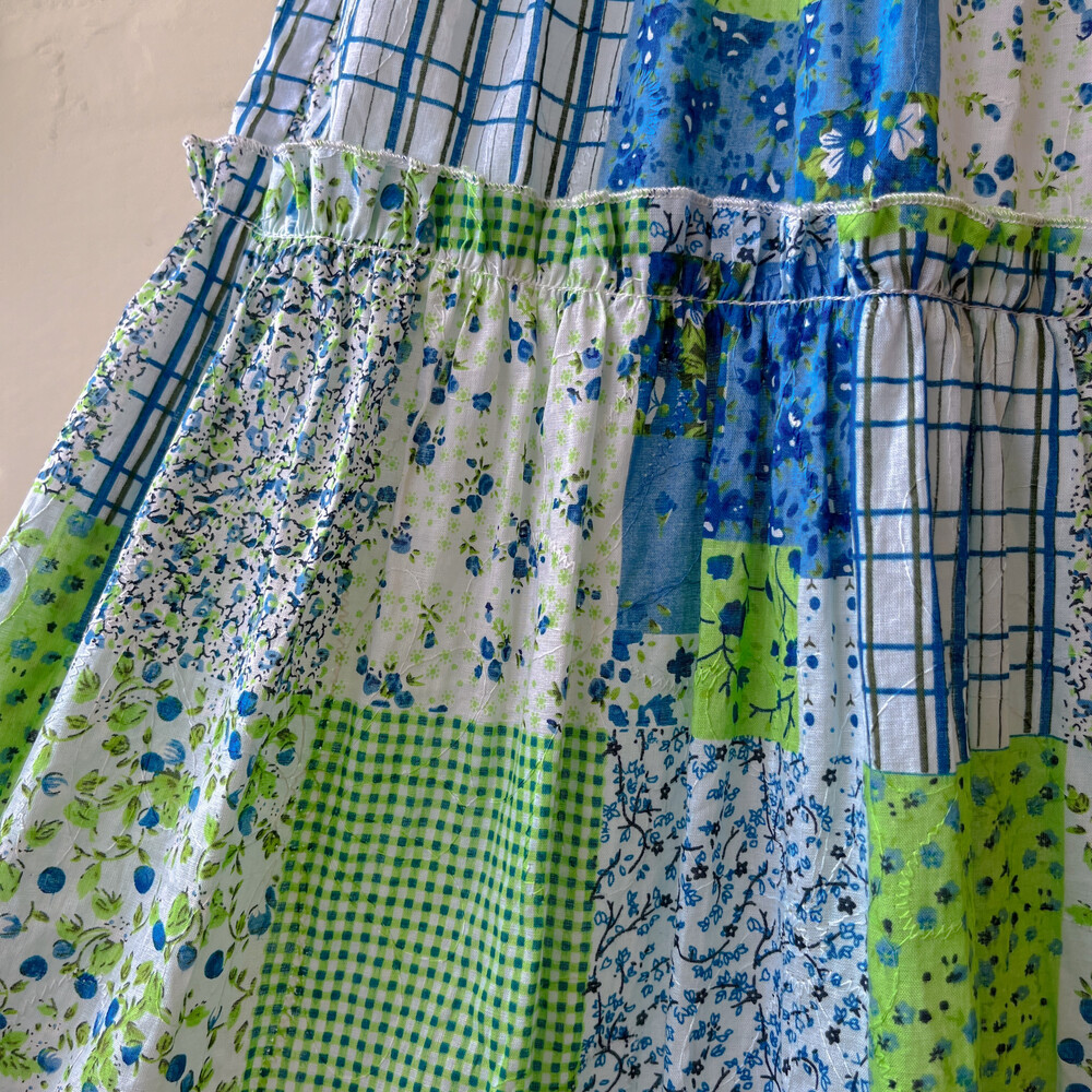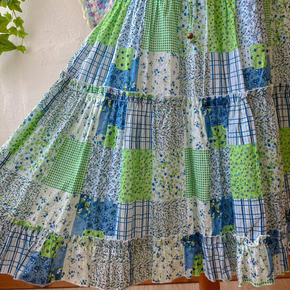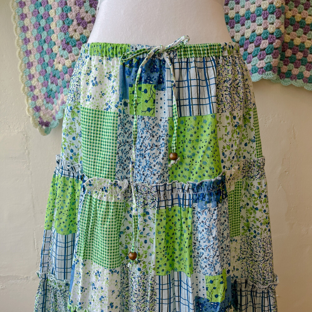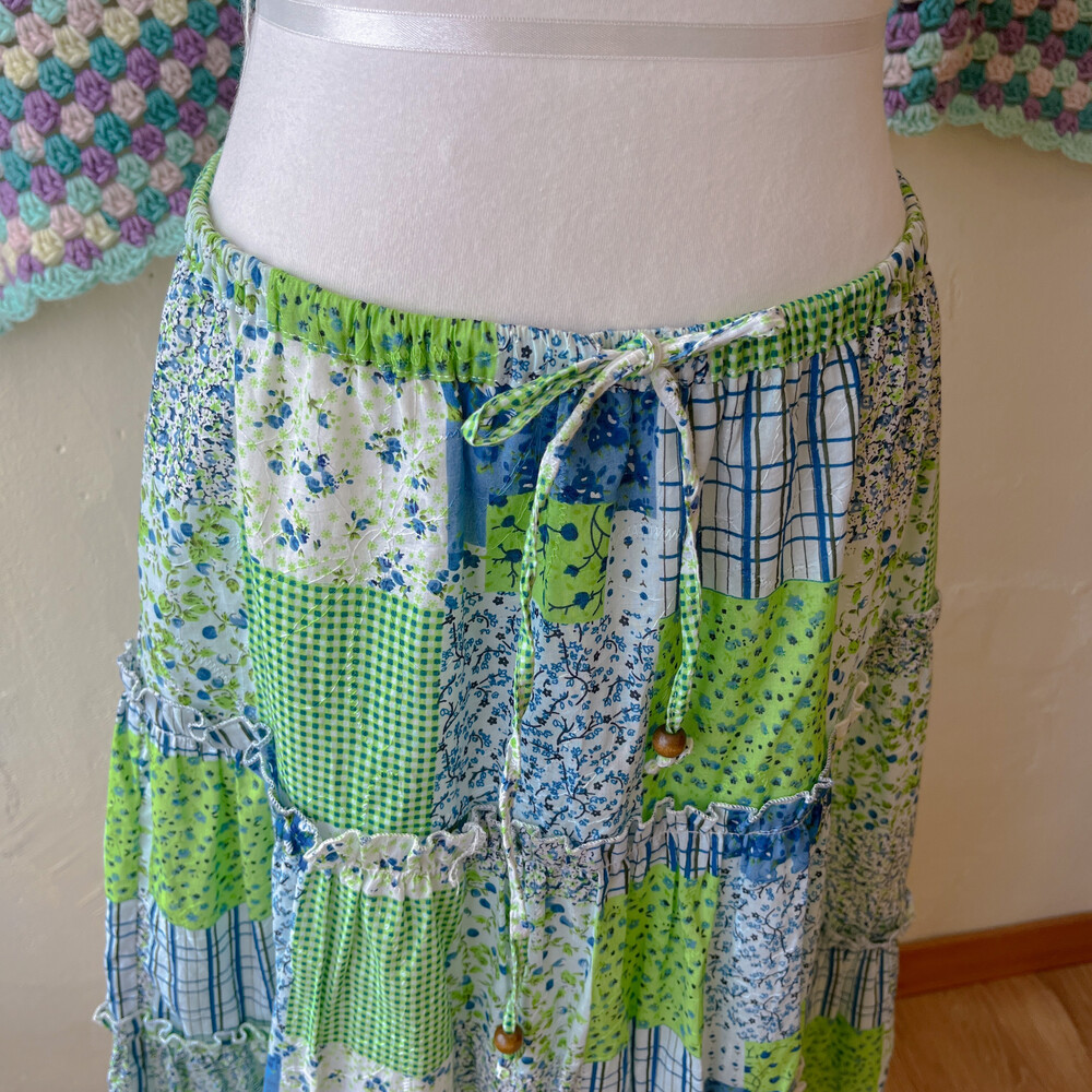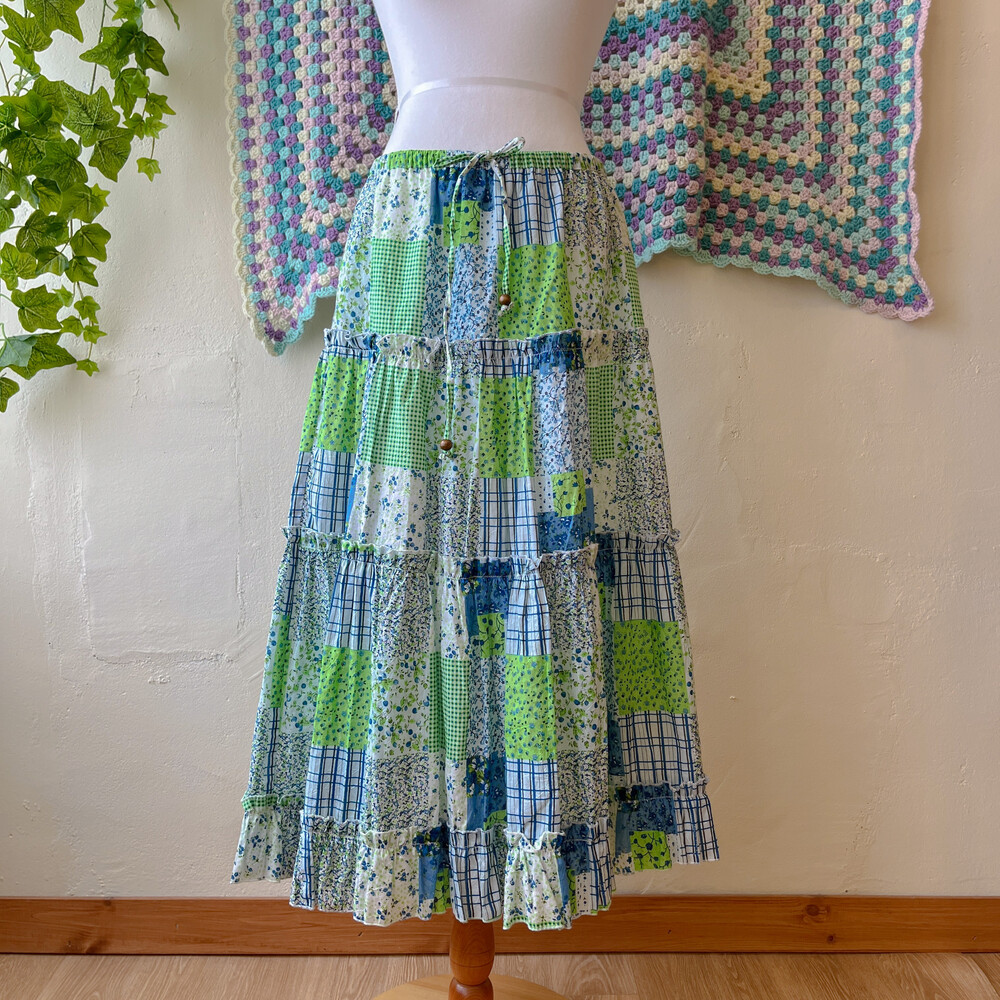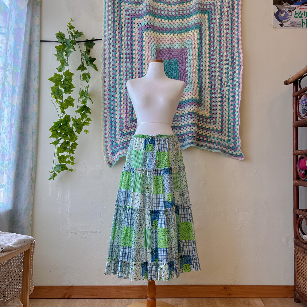 그린, 블루 색감의 패치워크 패턴 롱스커트예요