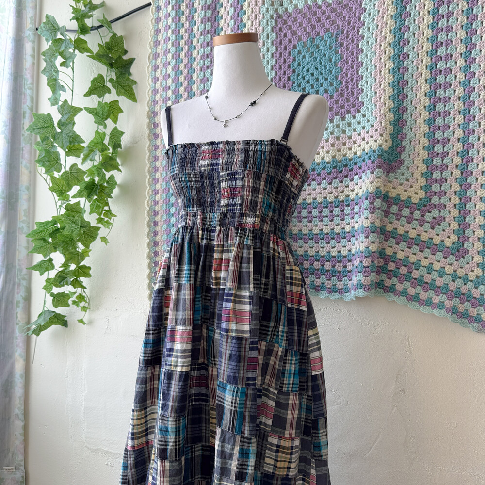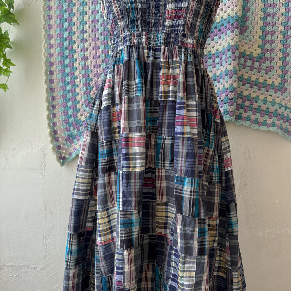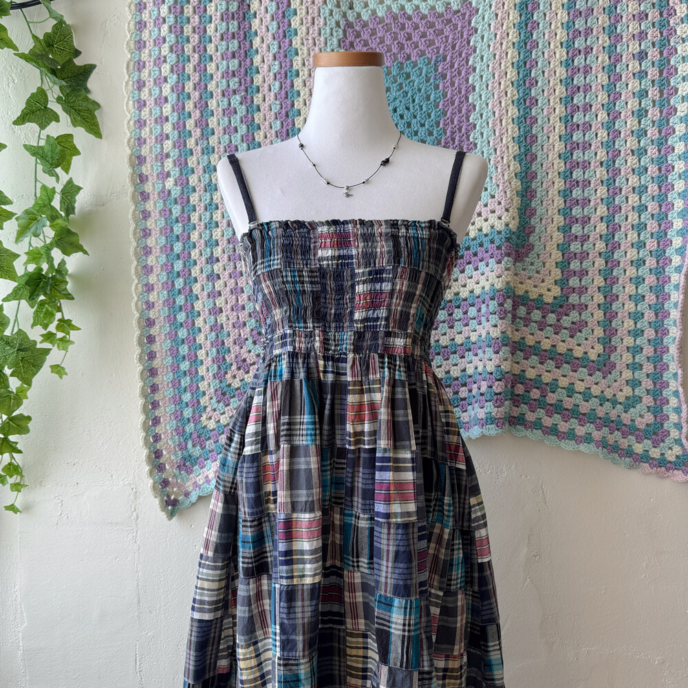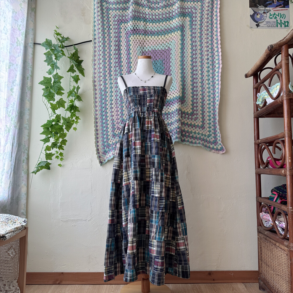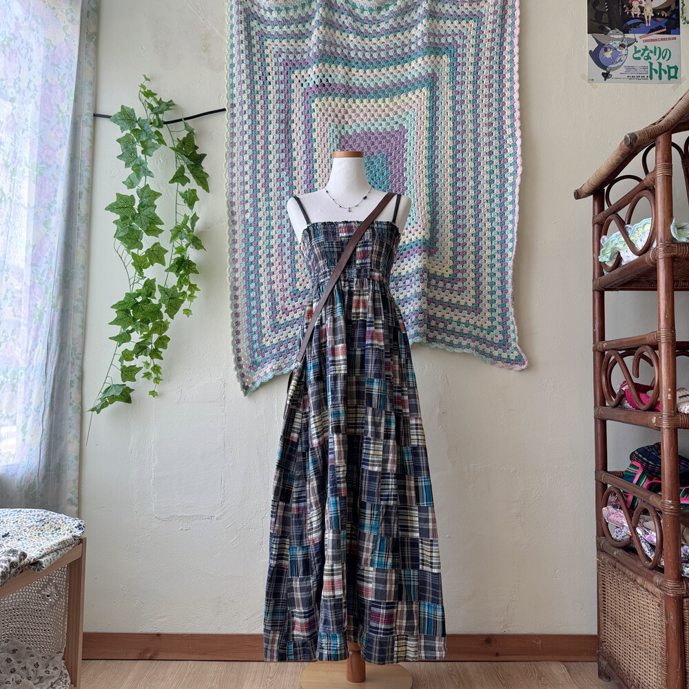 네이비 색감의 체크 패치워크 끈원피스예요