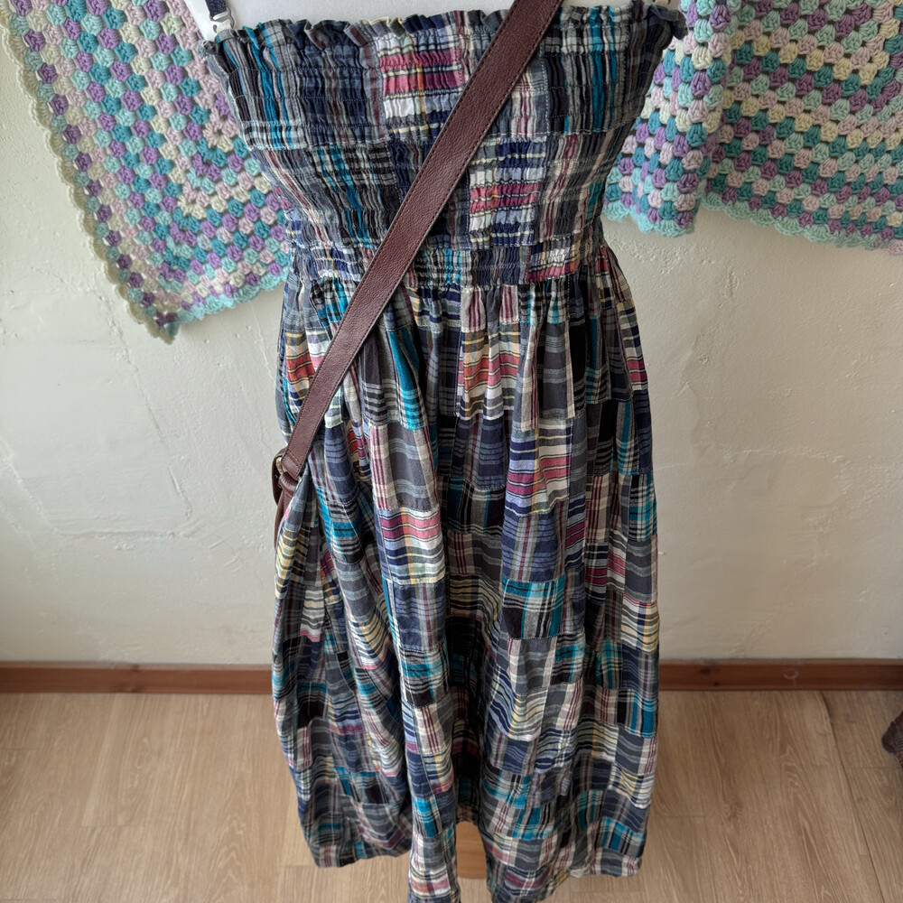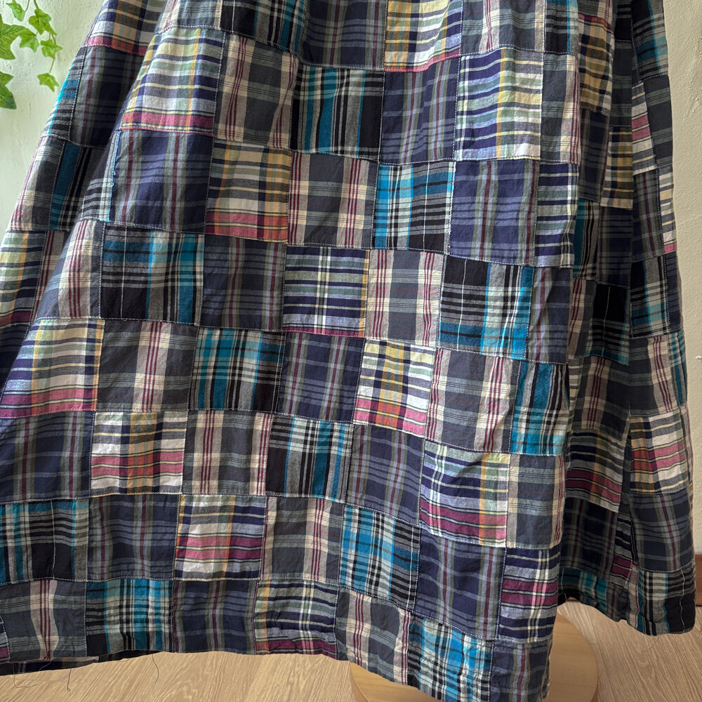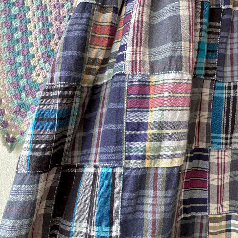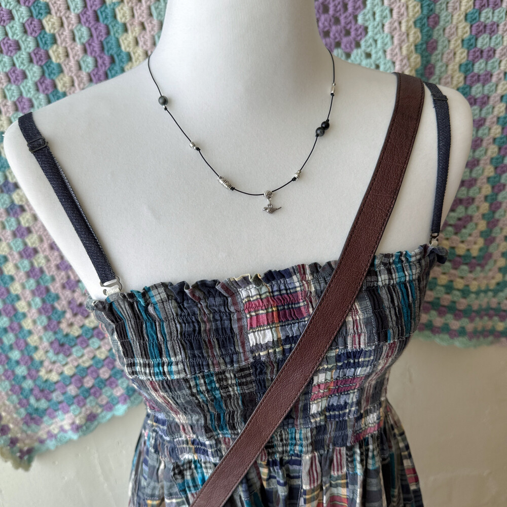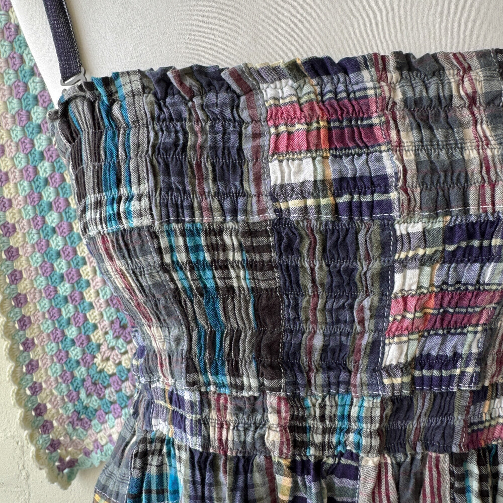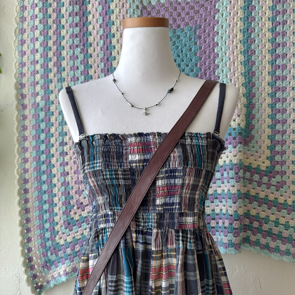 네이비 색감의 체크 패치워크 끈원피스예요