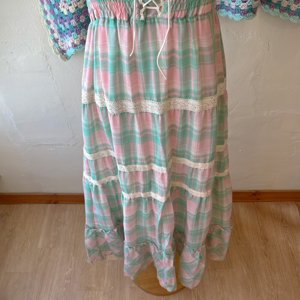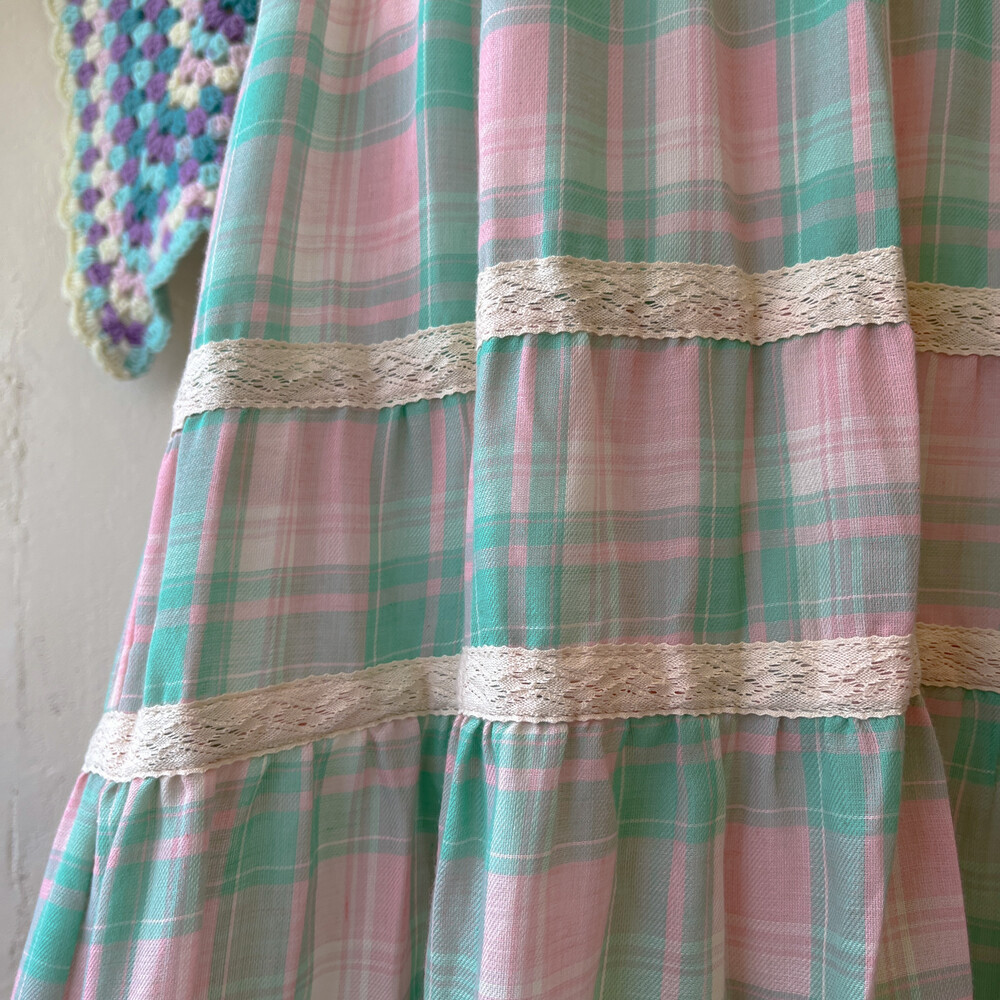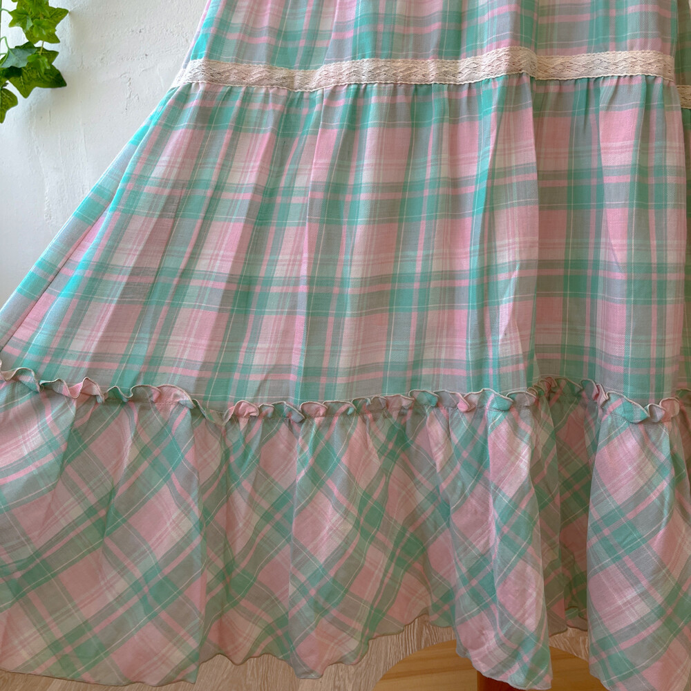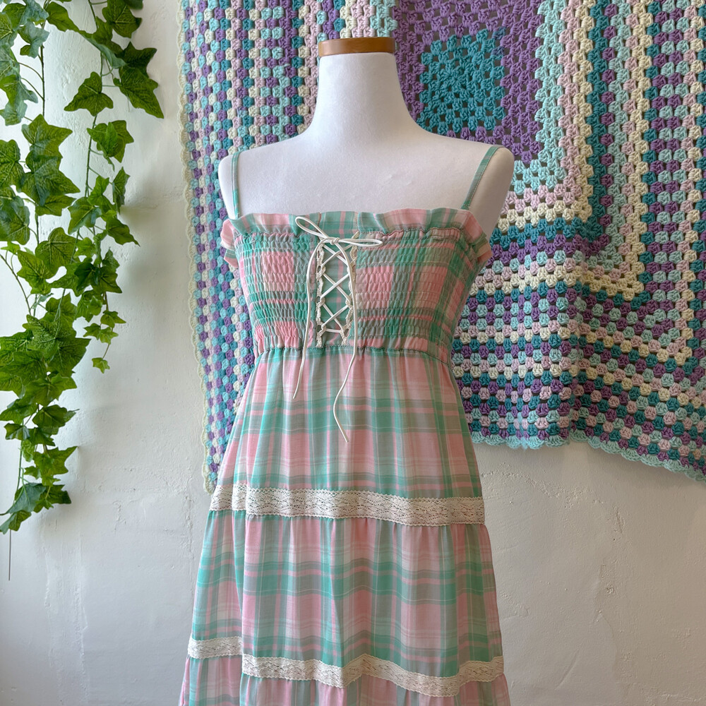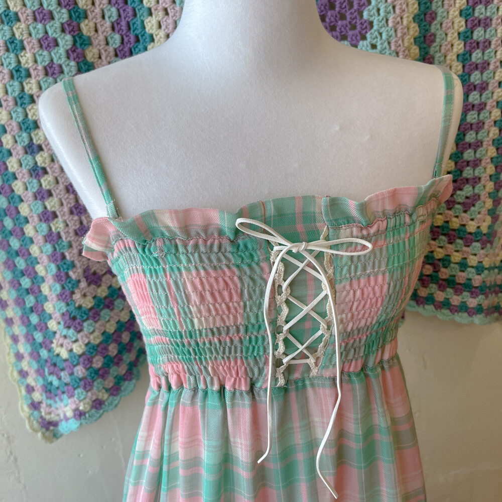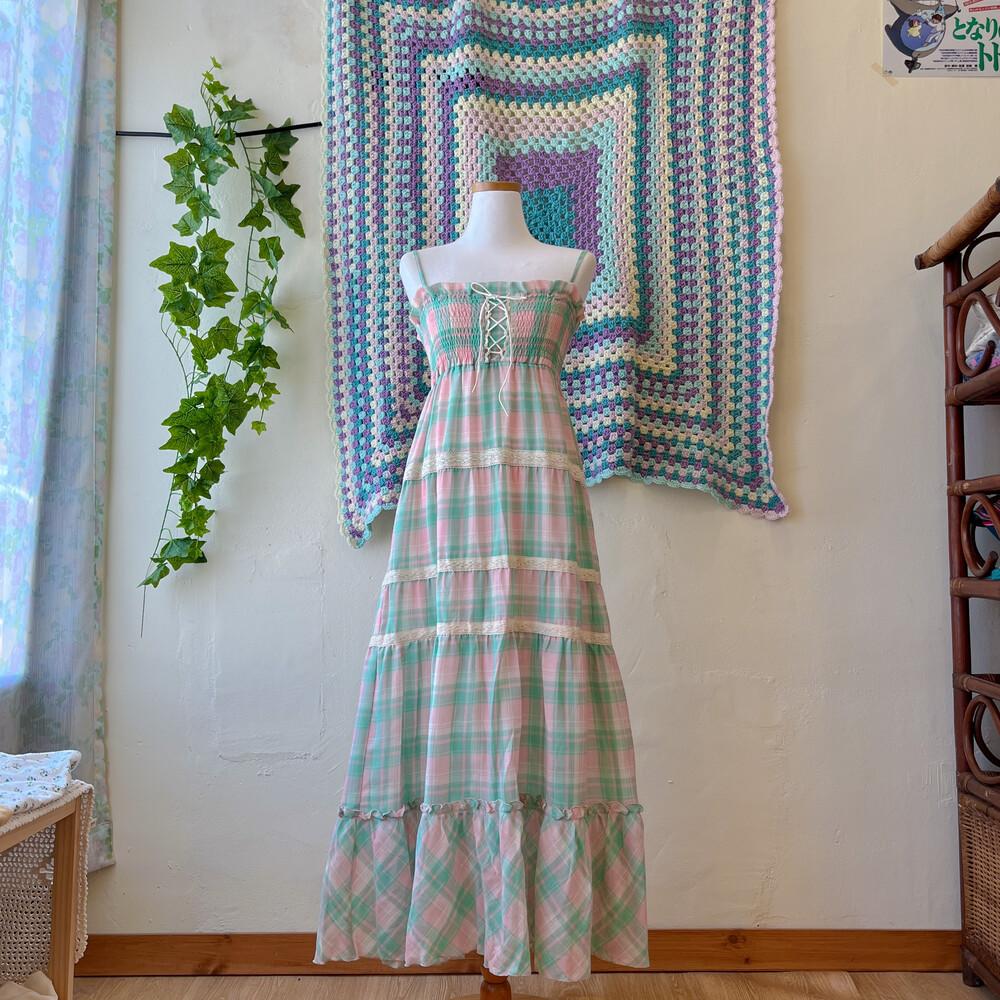 달콤한 색감의 체크 아일렛 끈원피스예요