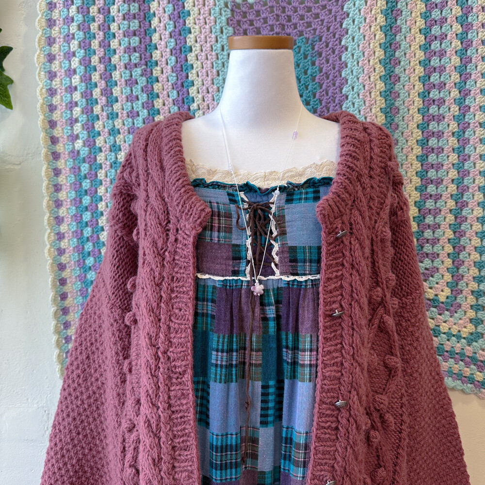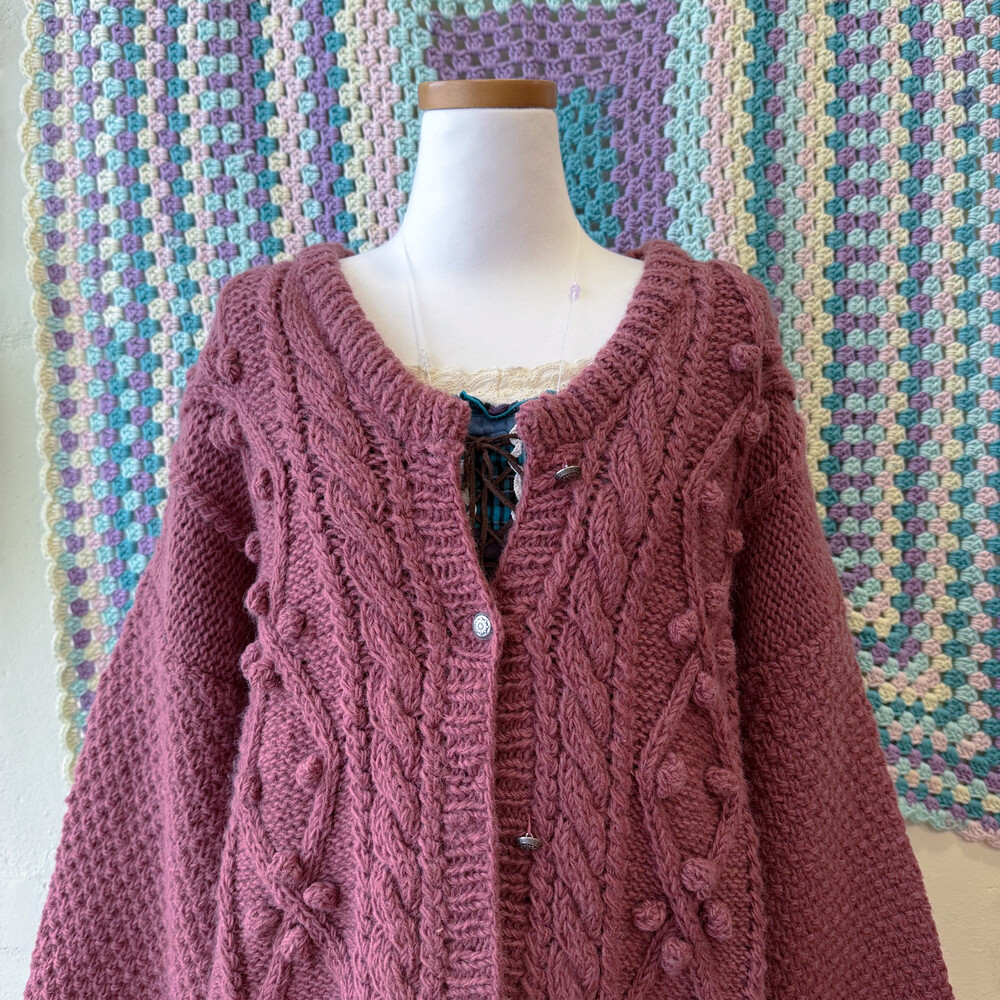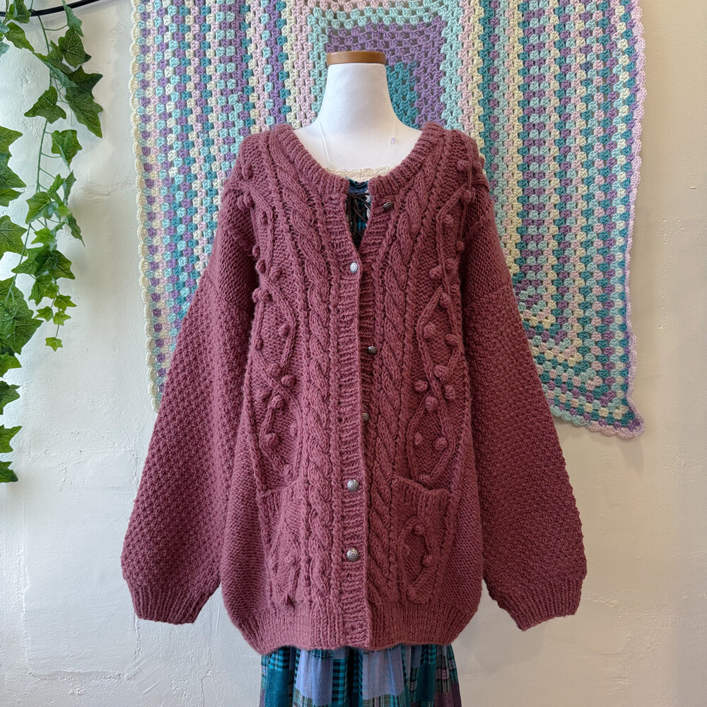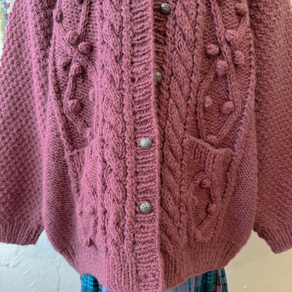 버건디 색감의 폼폼 케이블 가디건이에요