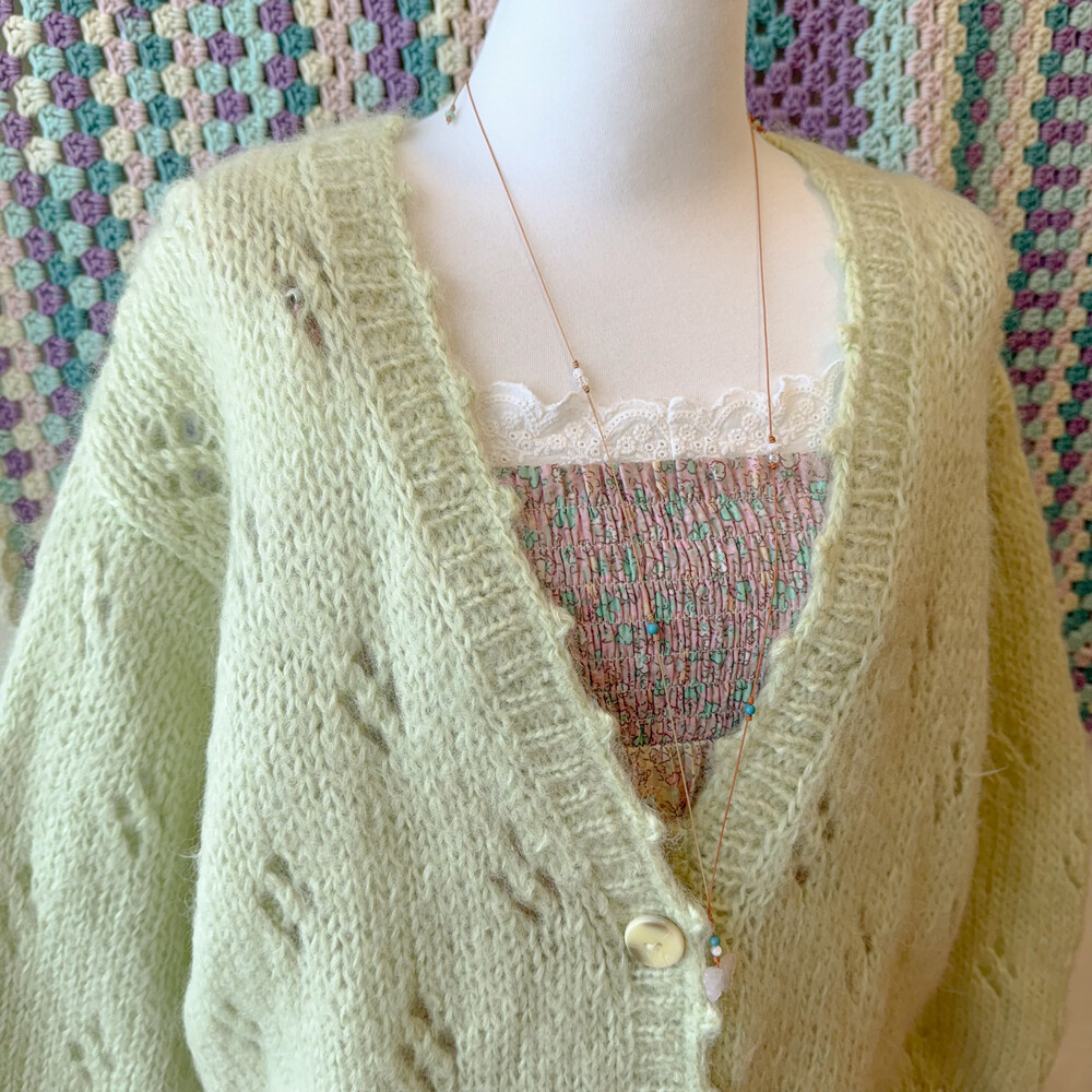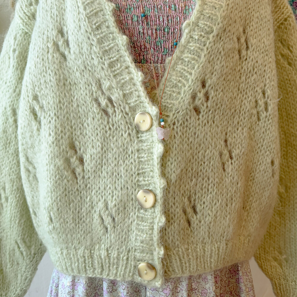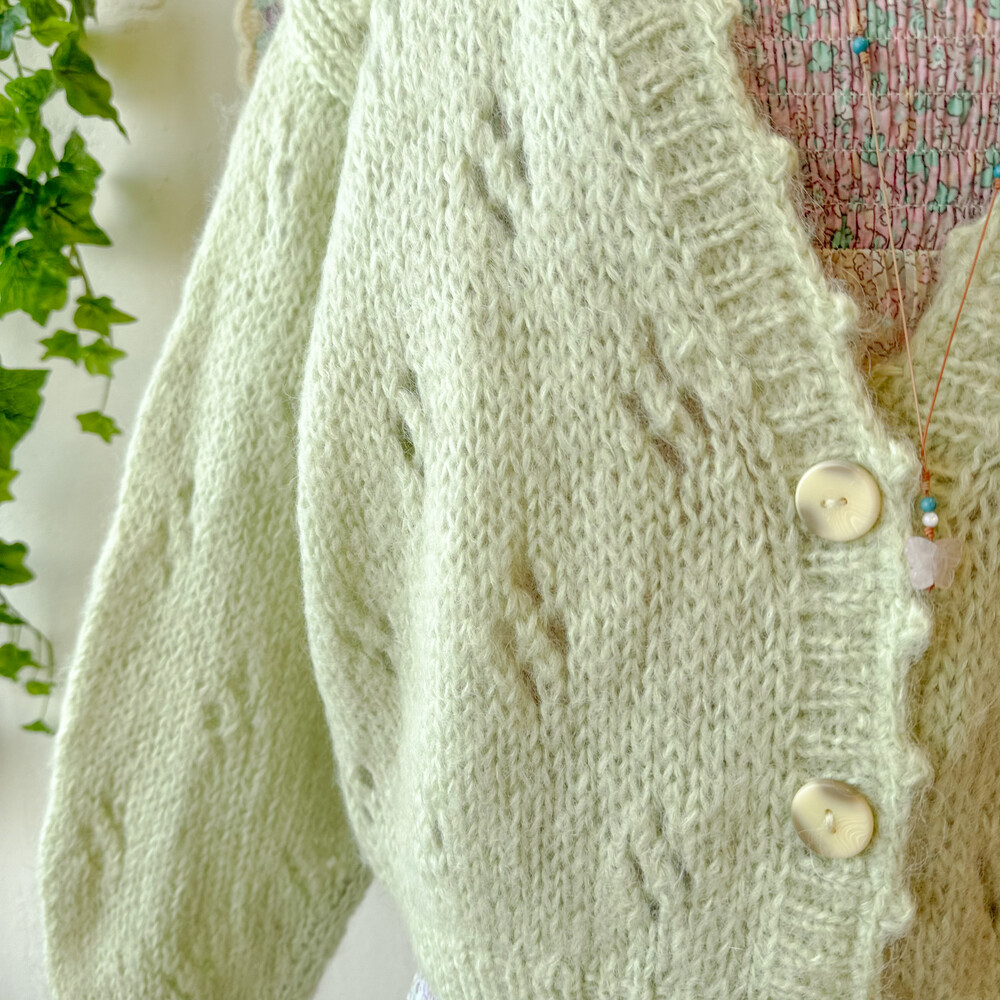 밝은 그린티라떼 색감의 펀칭 브이넥 가디건이에요