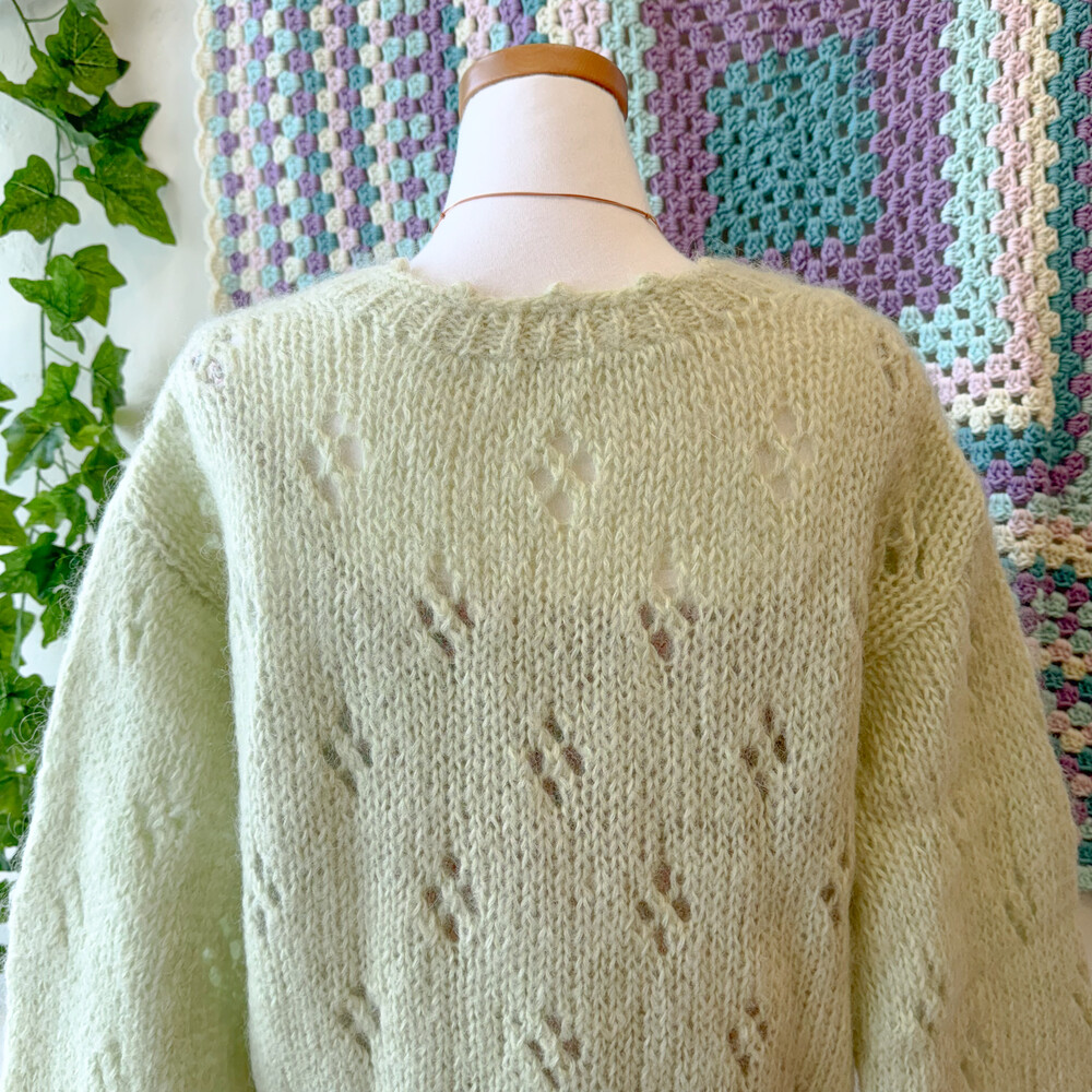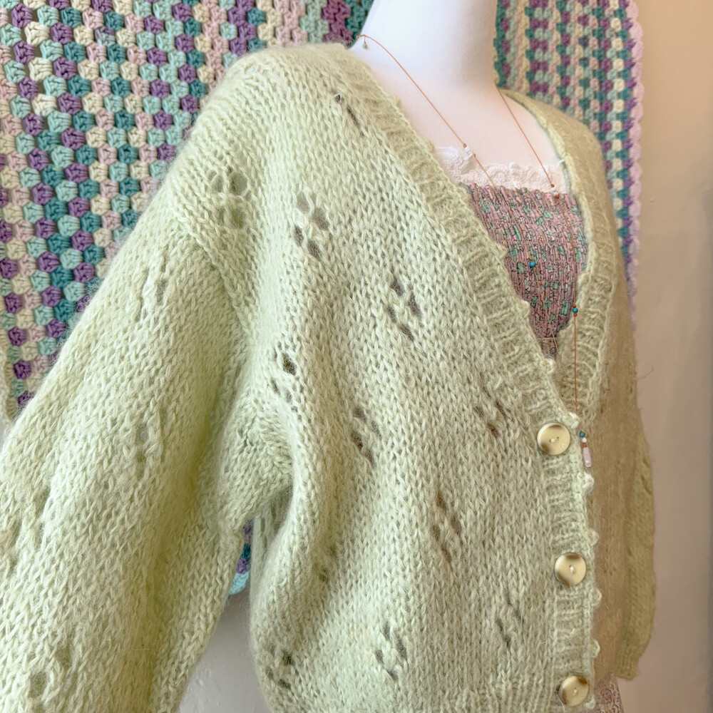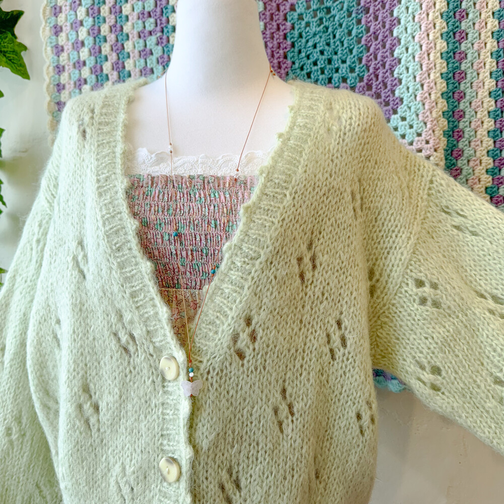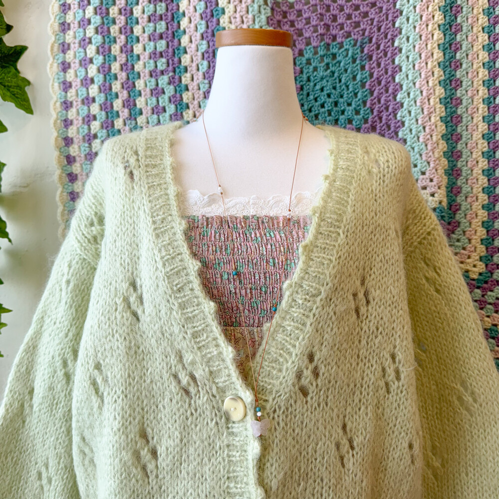 밝은 그린티라떼 색감의 펀칭 브이넥 가디건이에요
