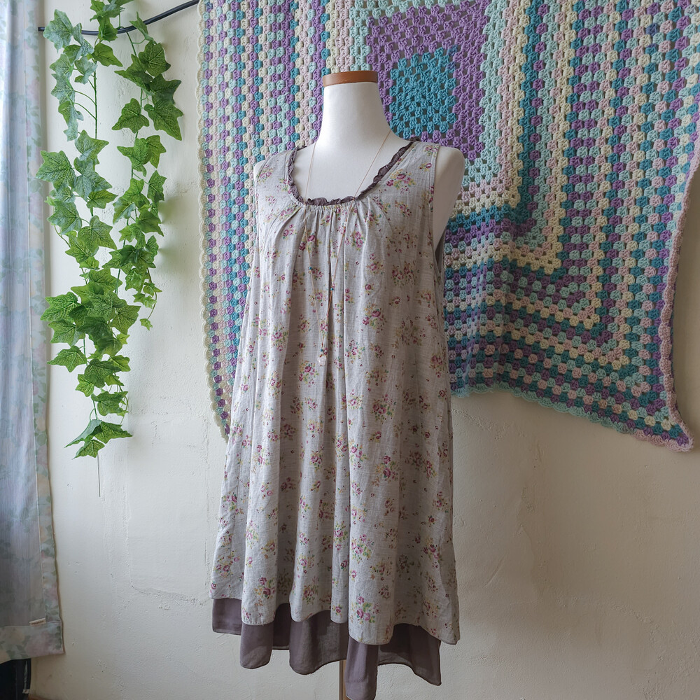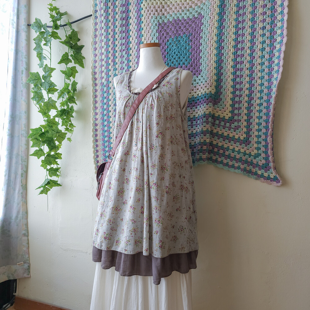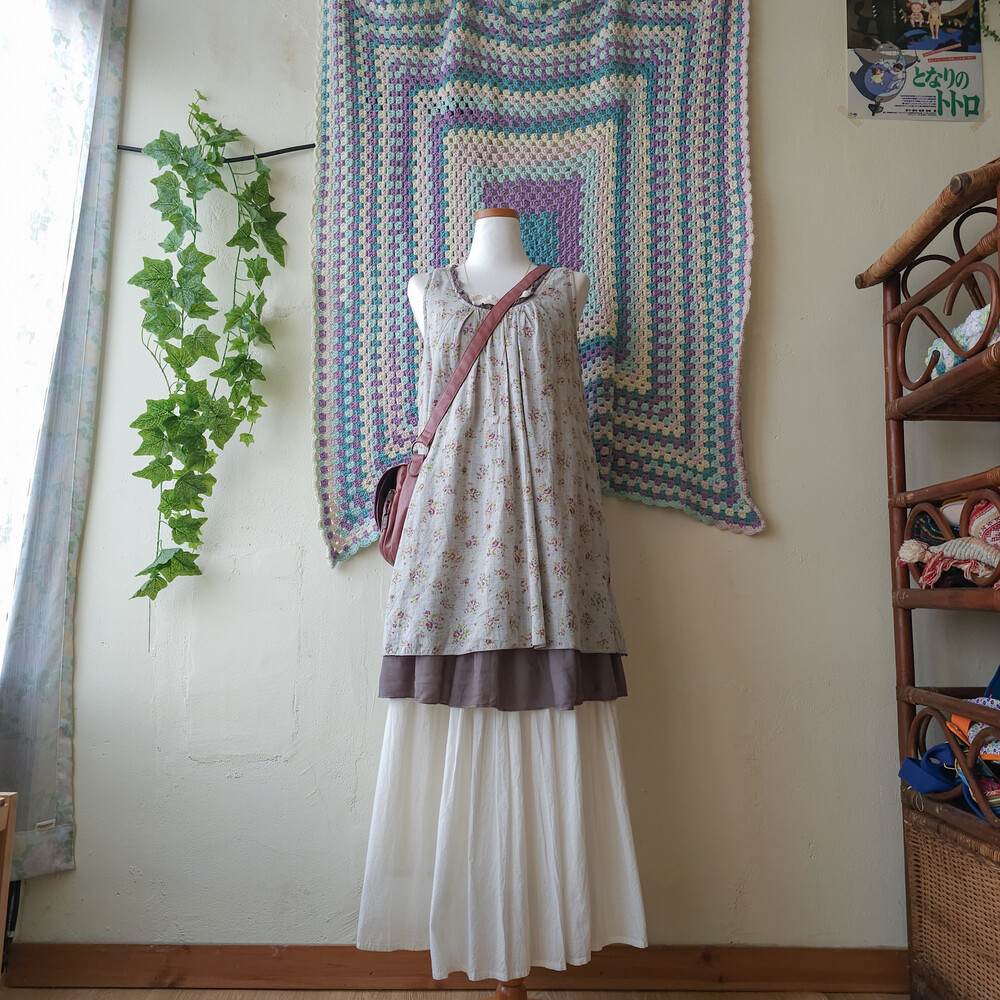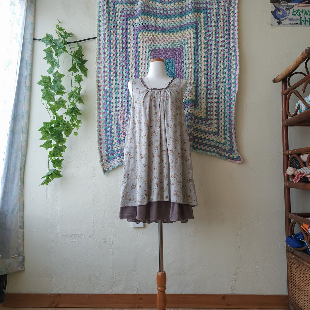그레이, 브라운 색감 조합의 민소매 원피스예요