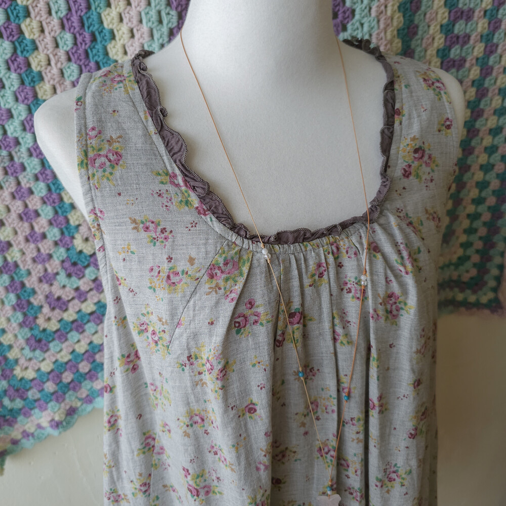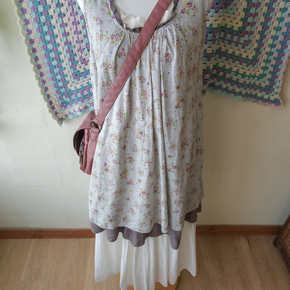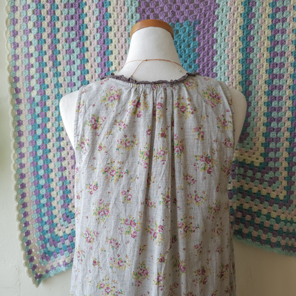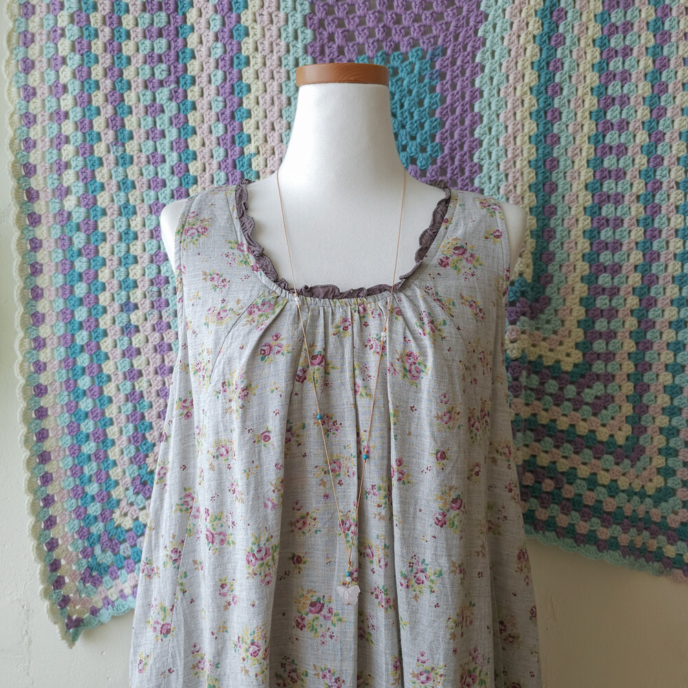 그레이, 브라운 색감 조합의 민소매 원피스예요