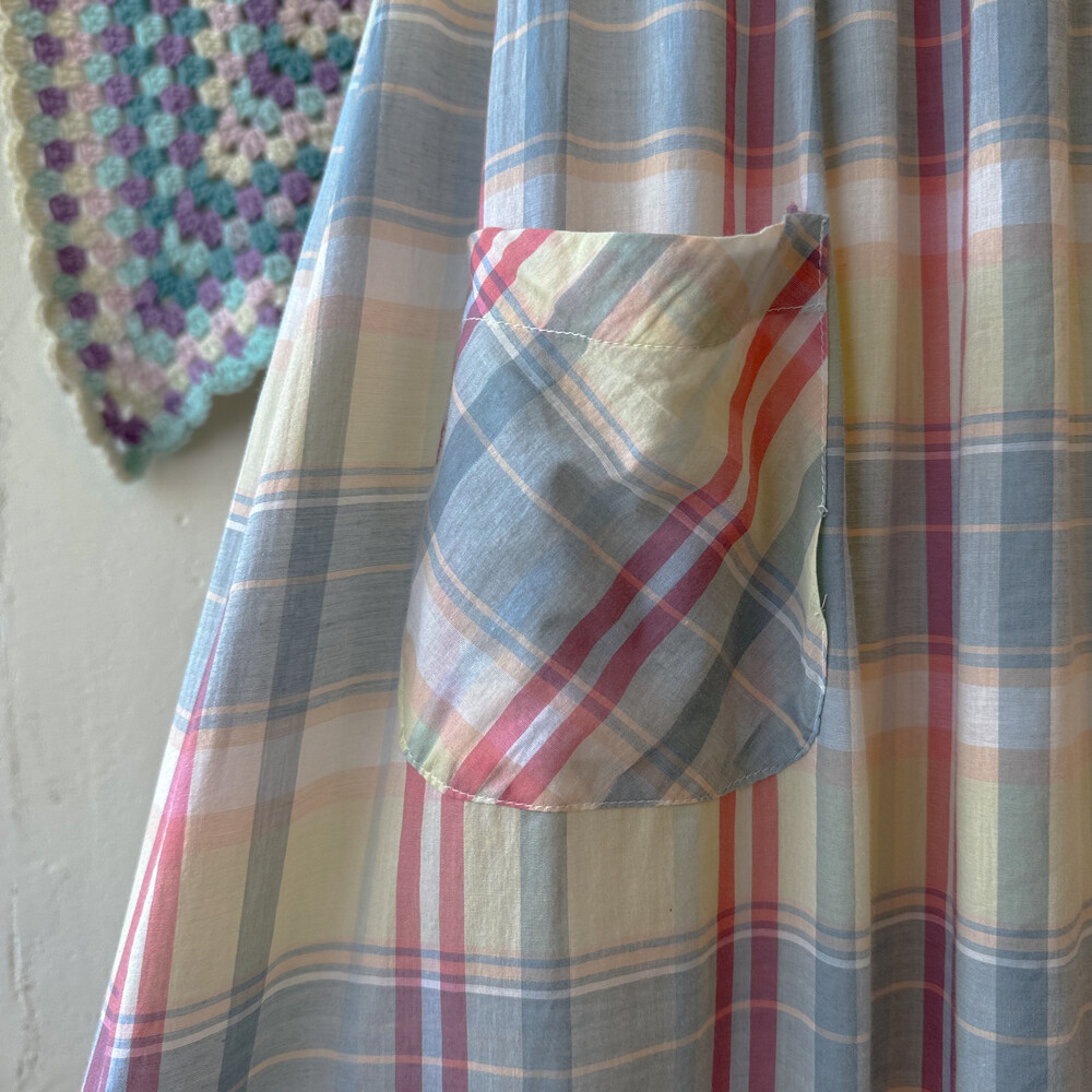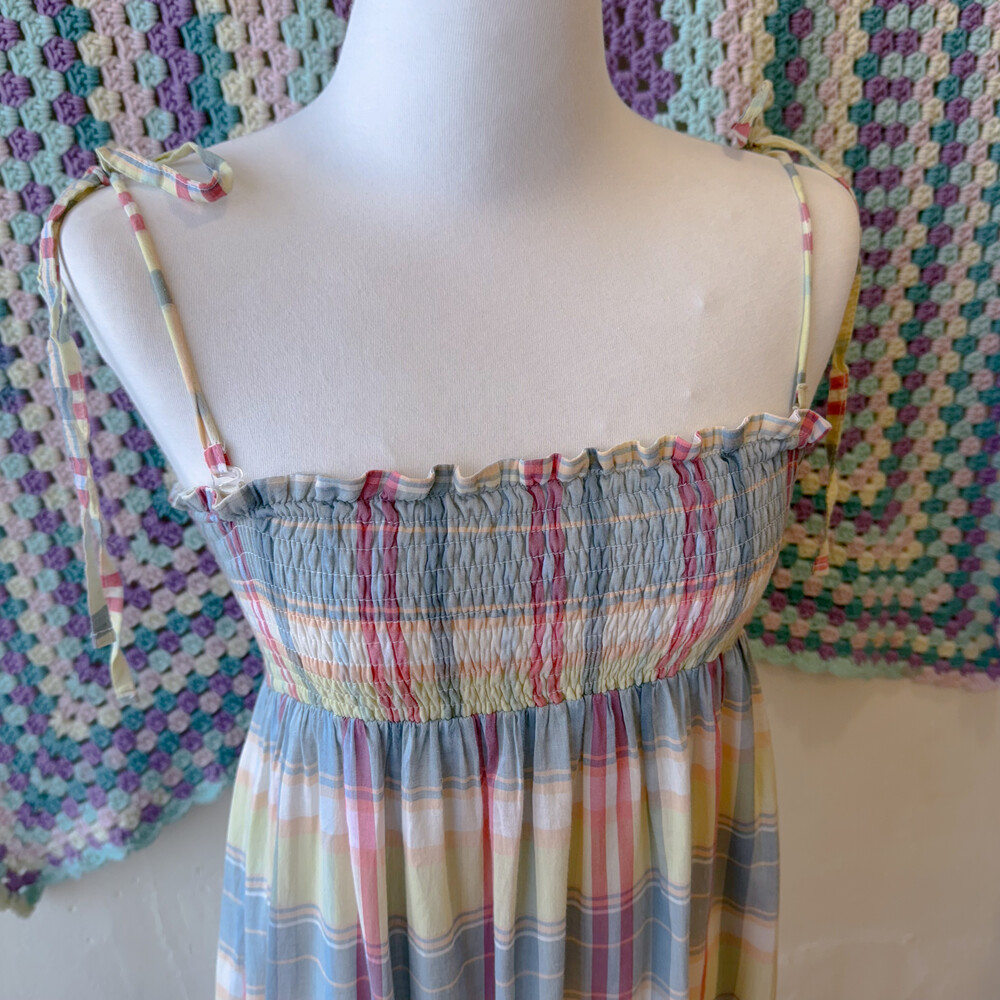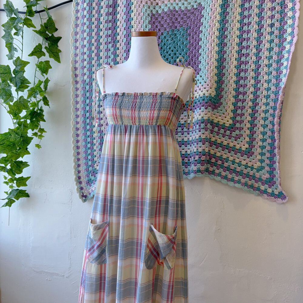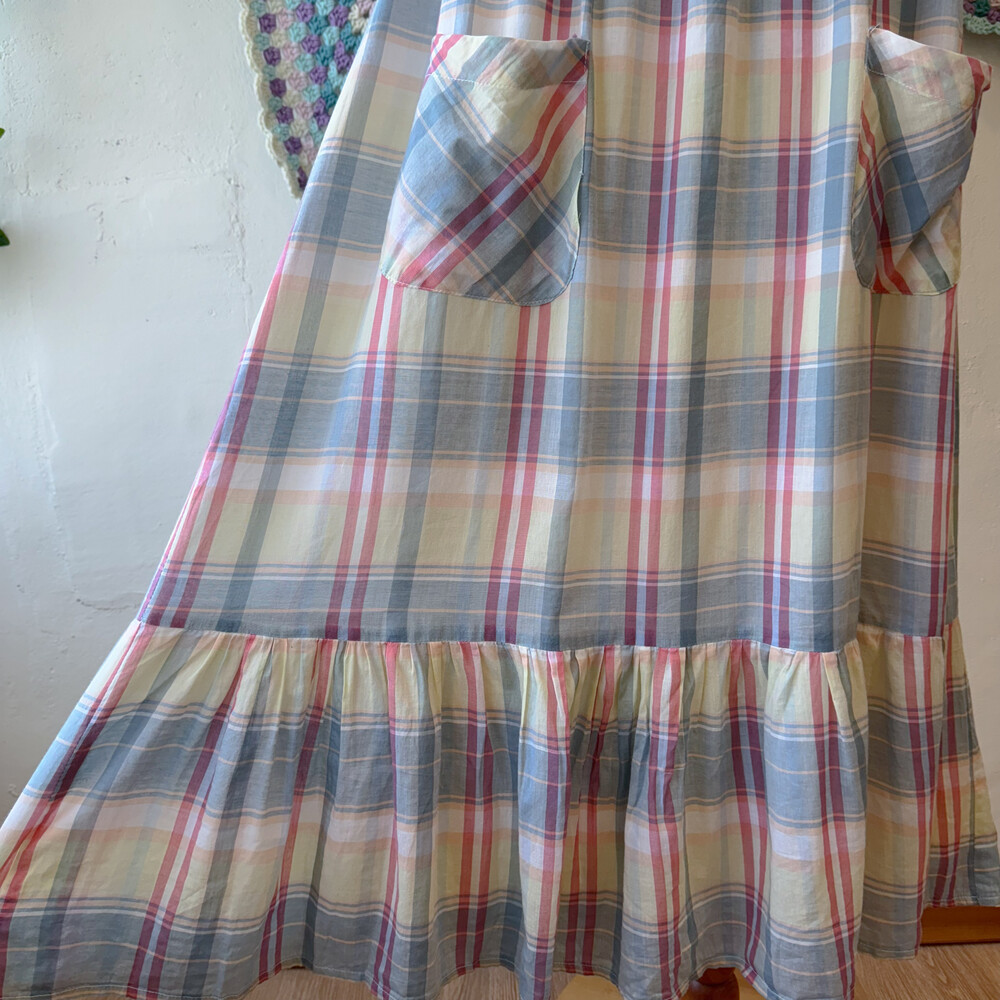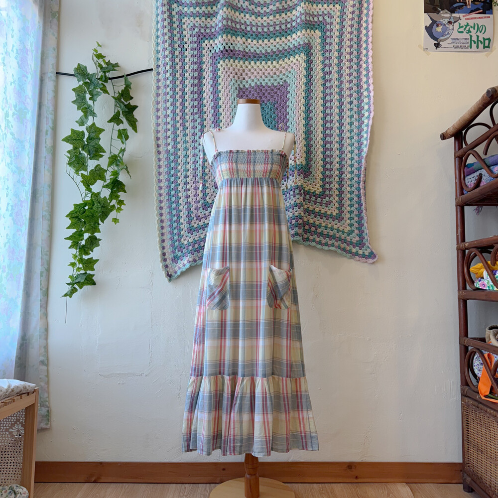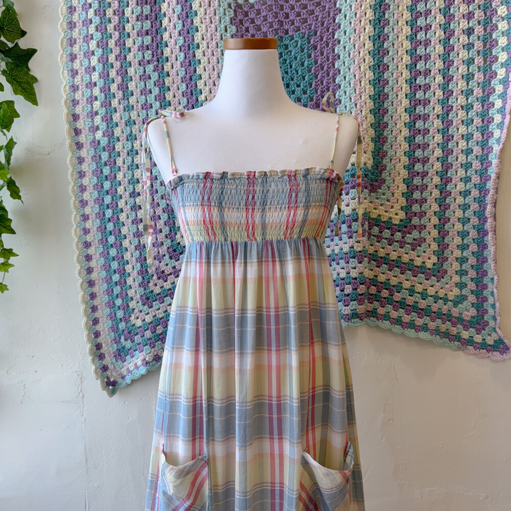 소라, 연두색감이 조합된 체크 끈원피스예요