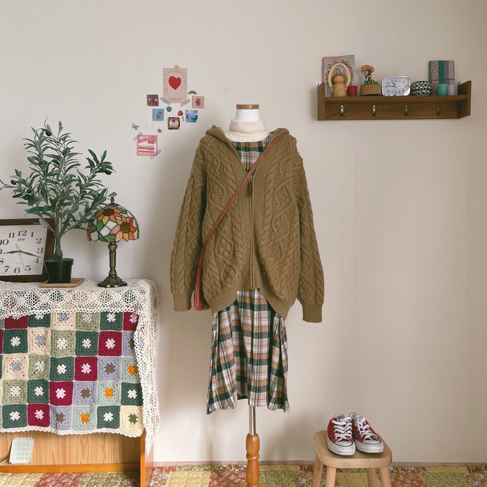 브라운에 올리브 그린 색감이 오묘히 섞인 후드 집업이에요