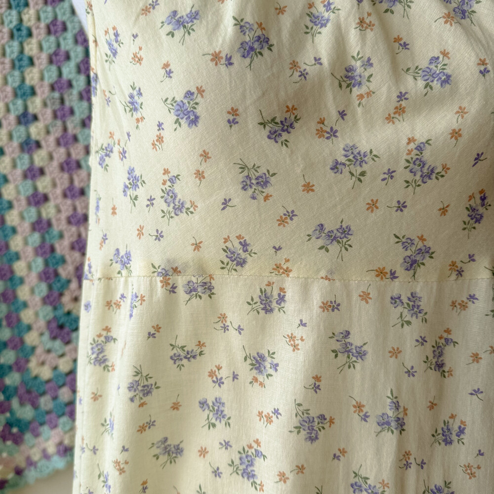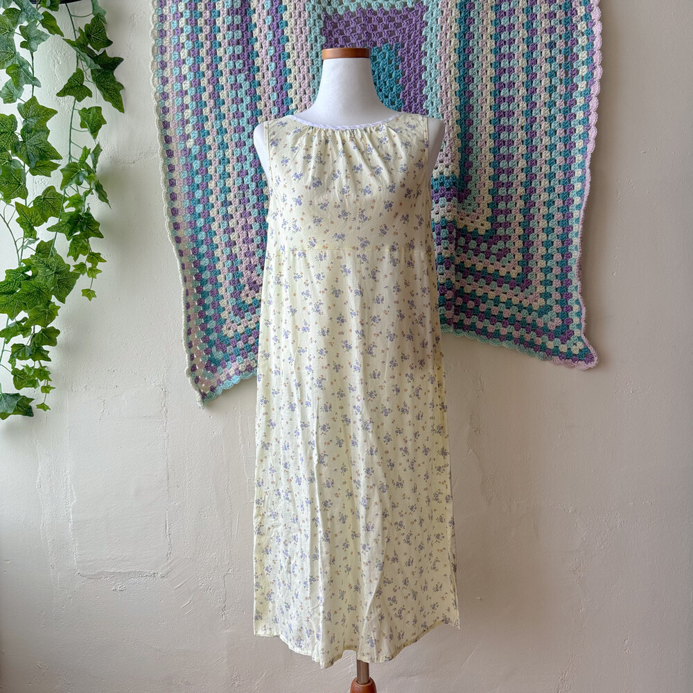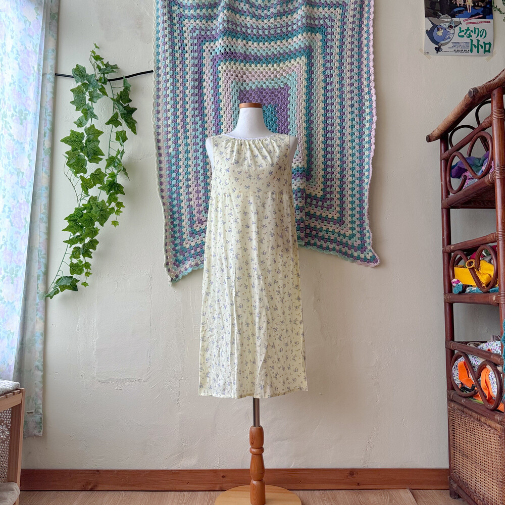 연노랑 색감의 잔꽃 민소매 원피스예요