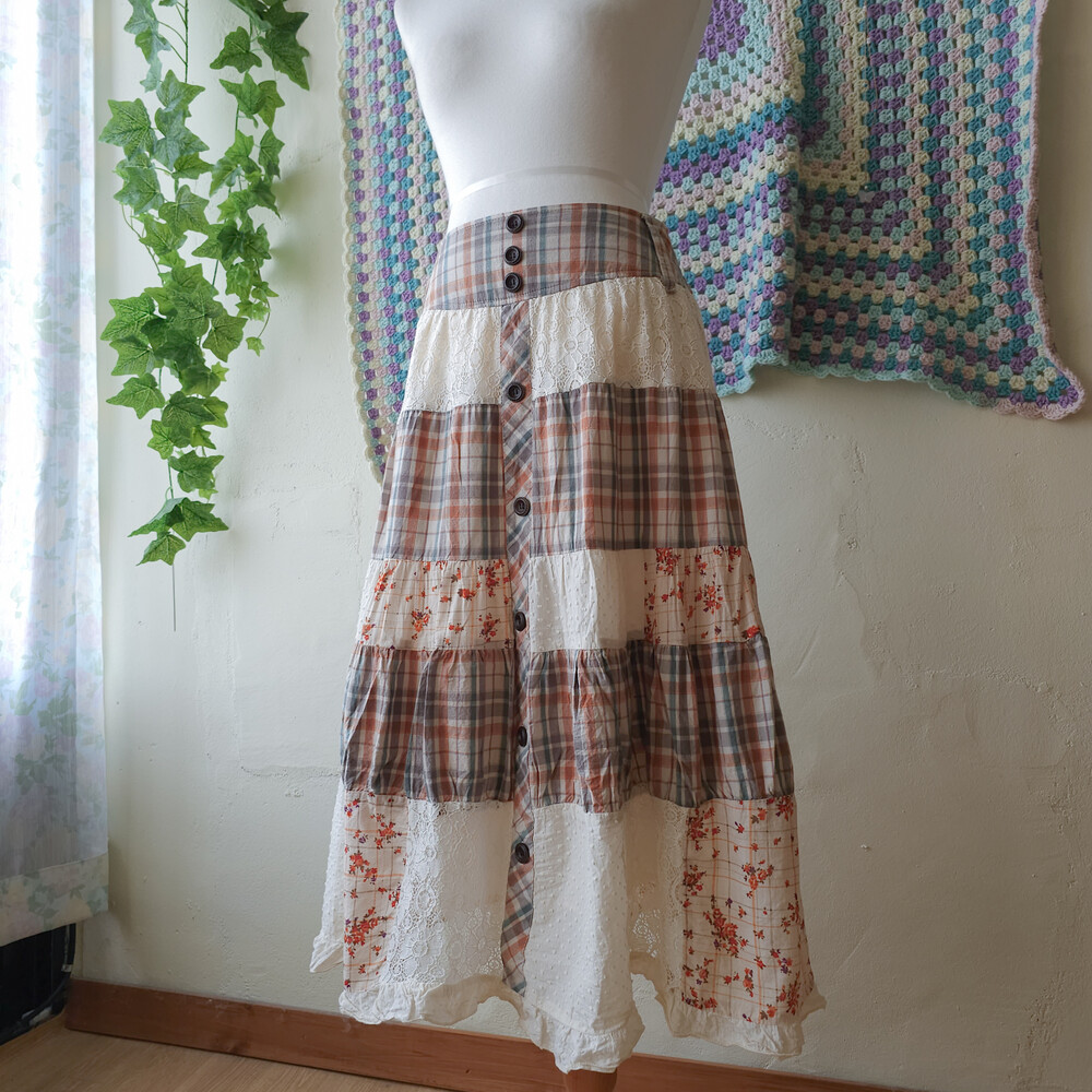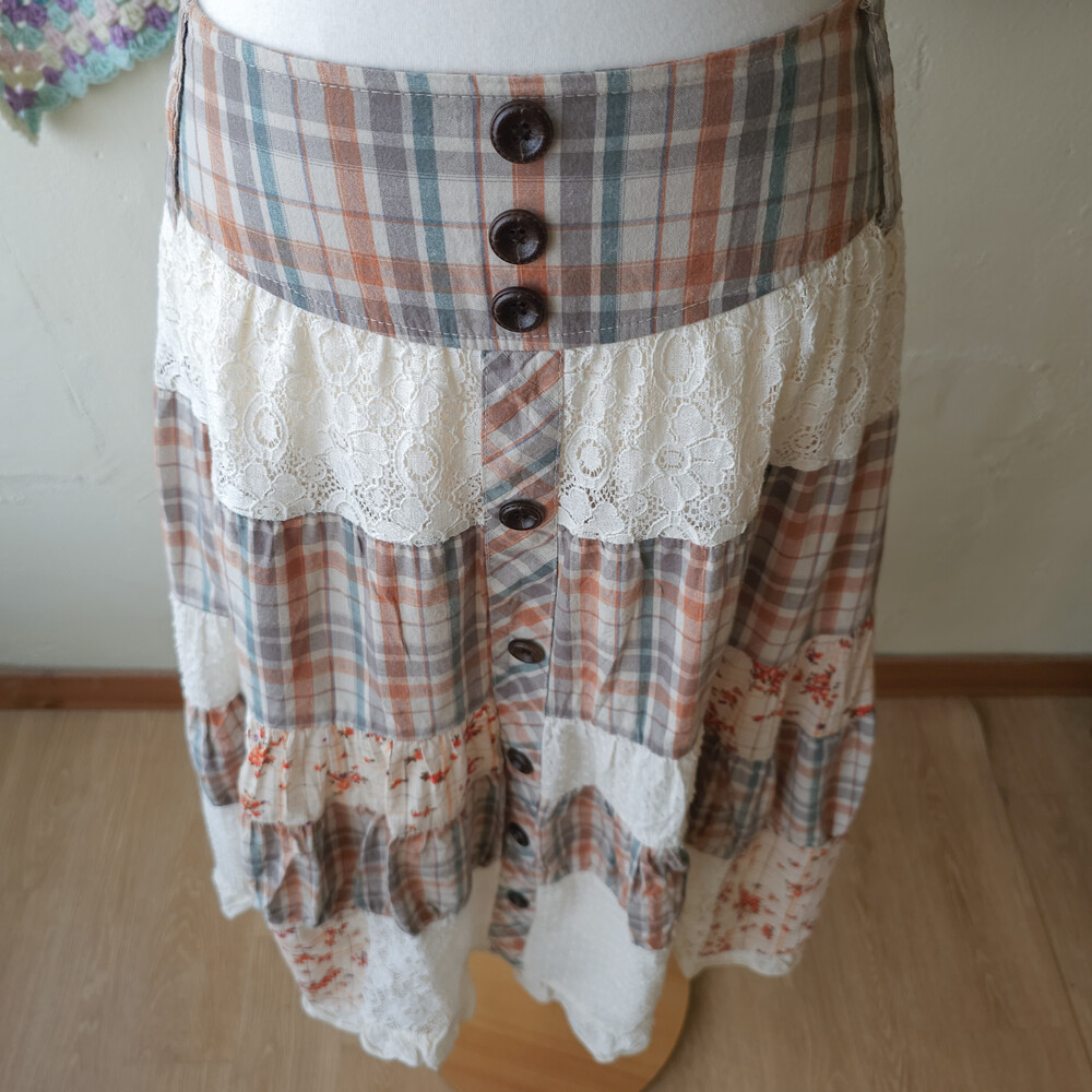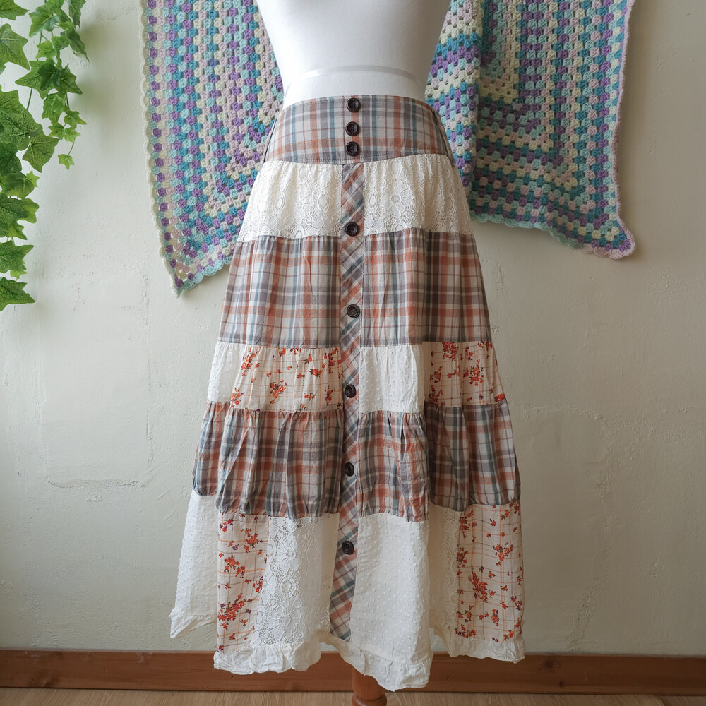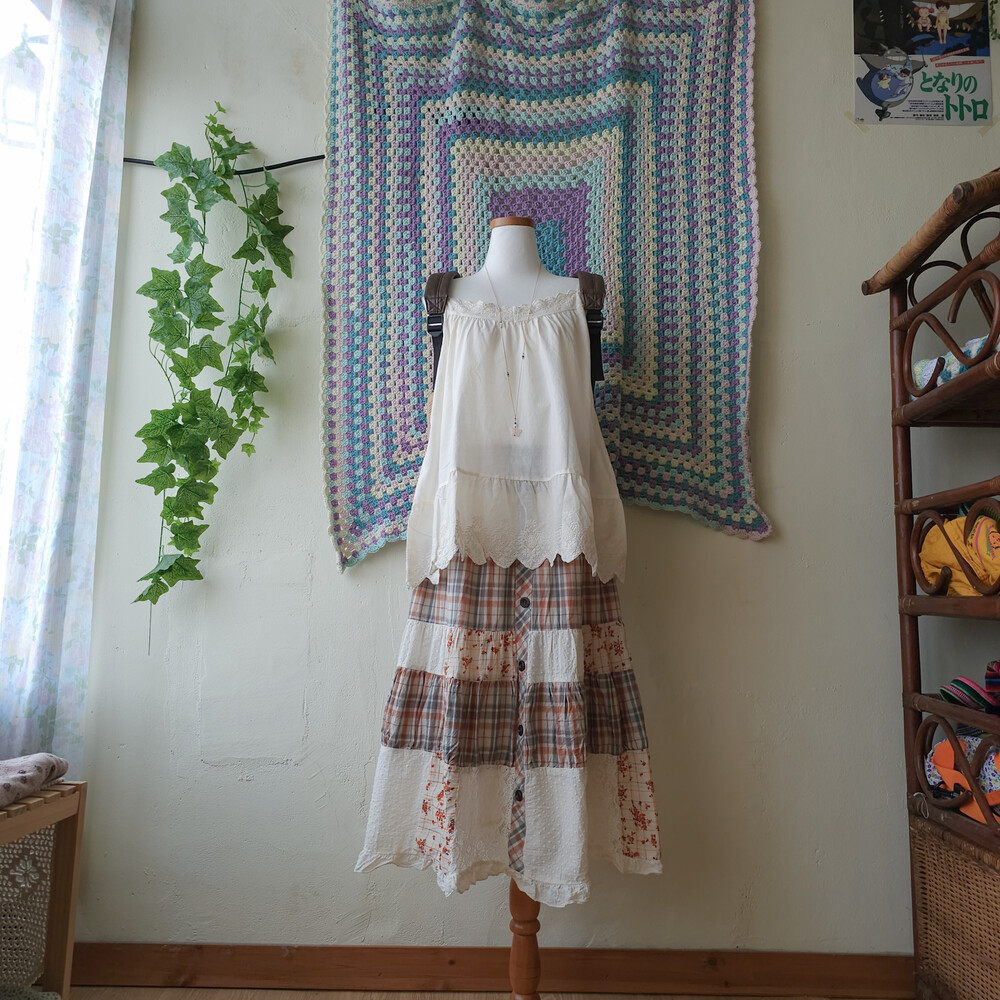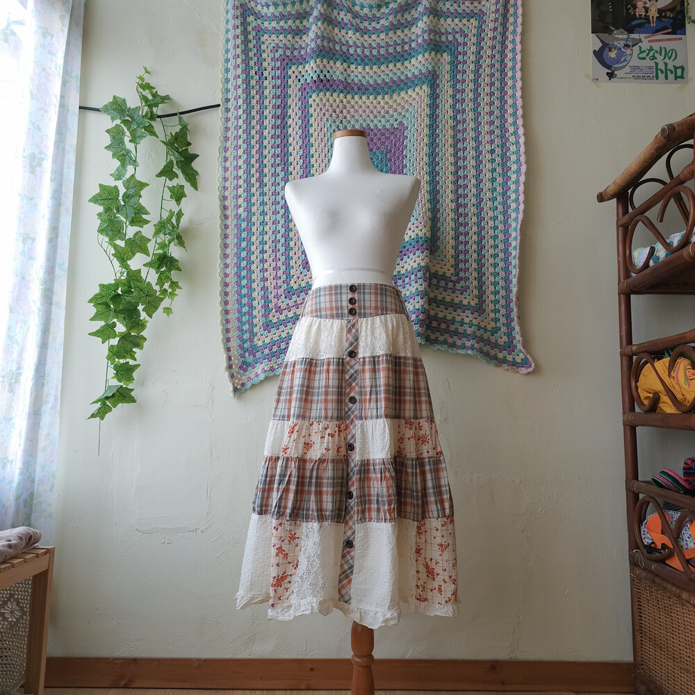 웜한 색감 조합의 체크, 레이스 패치워크 스커트예요