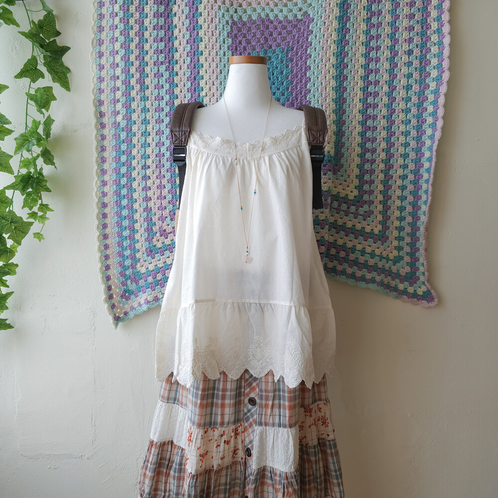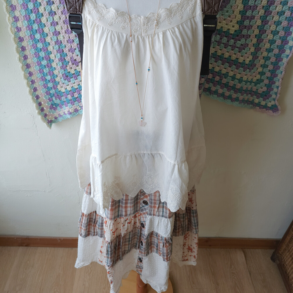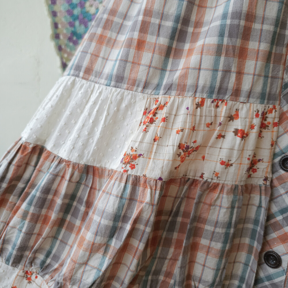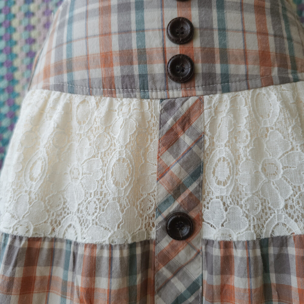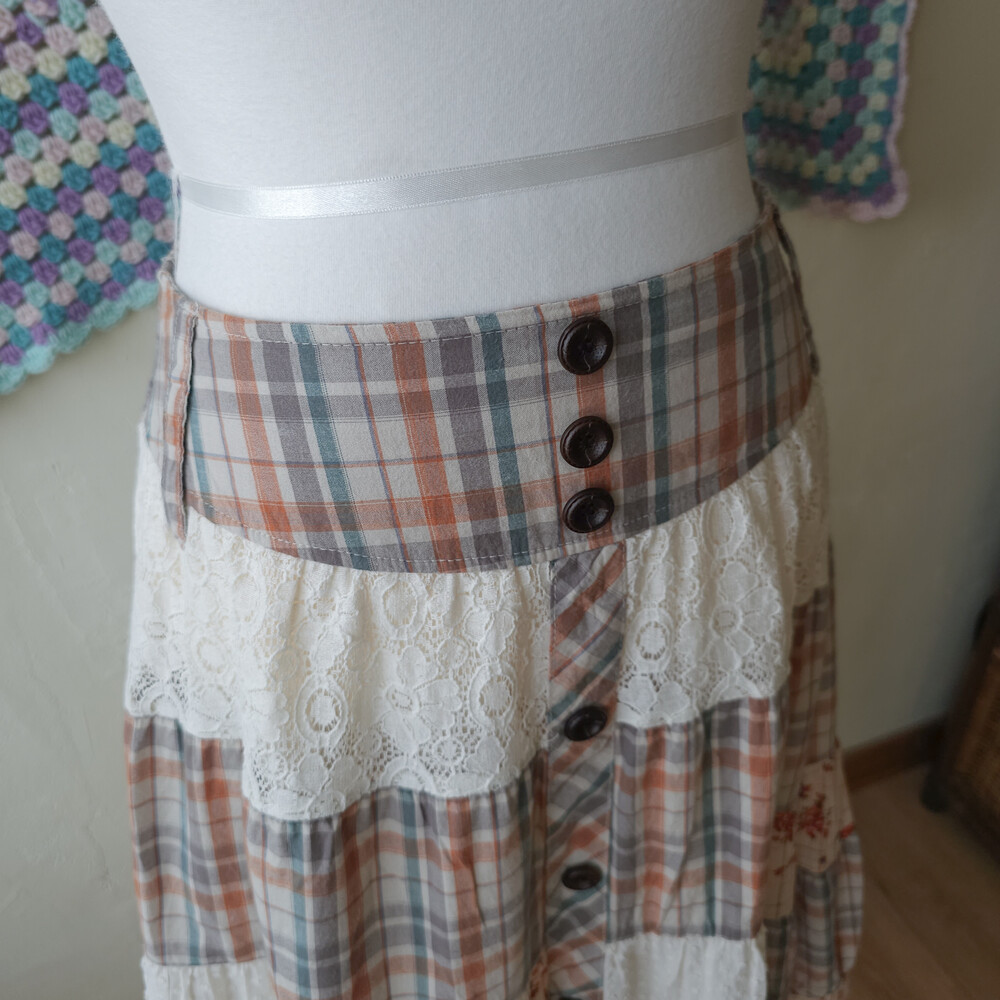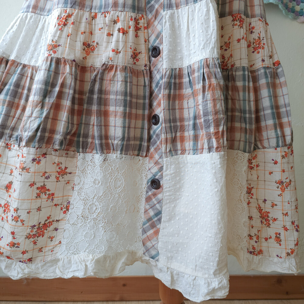 웜한 색감 조합의 체크, 레이스 패치워크 스커트예요