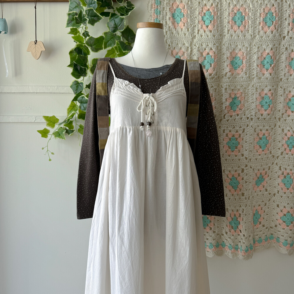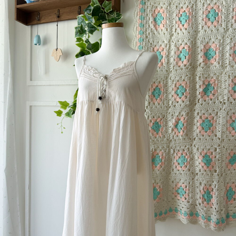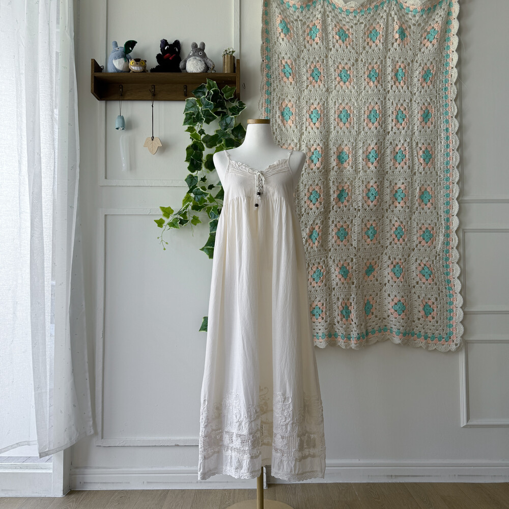아이보리 색감의 코튼 아일렛 끈원피스예요