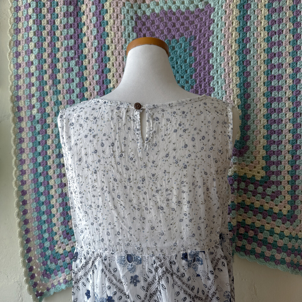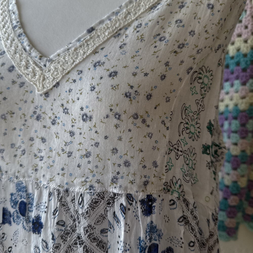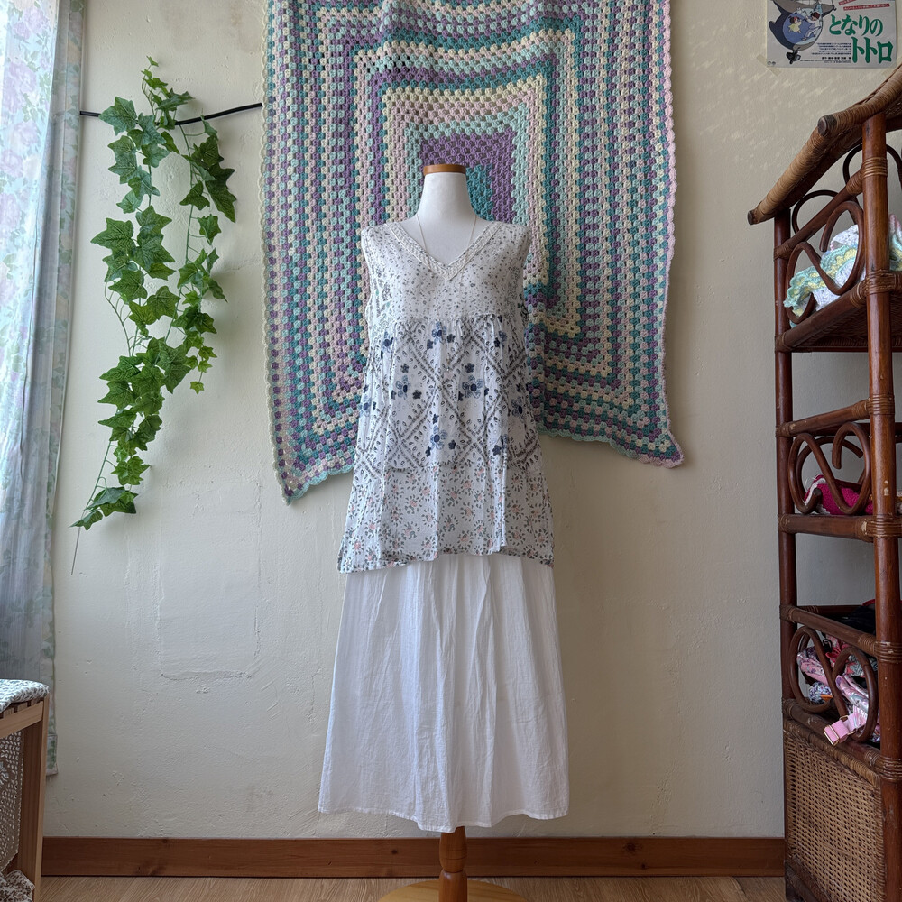 블루, 네이비 색감 베이스의 패치 민소매 블라우스예요