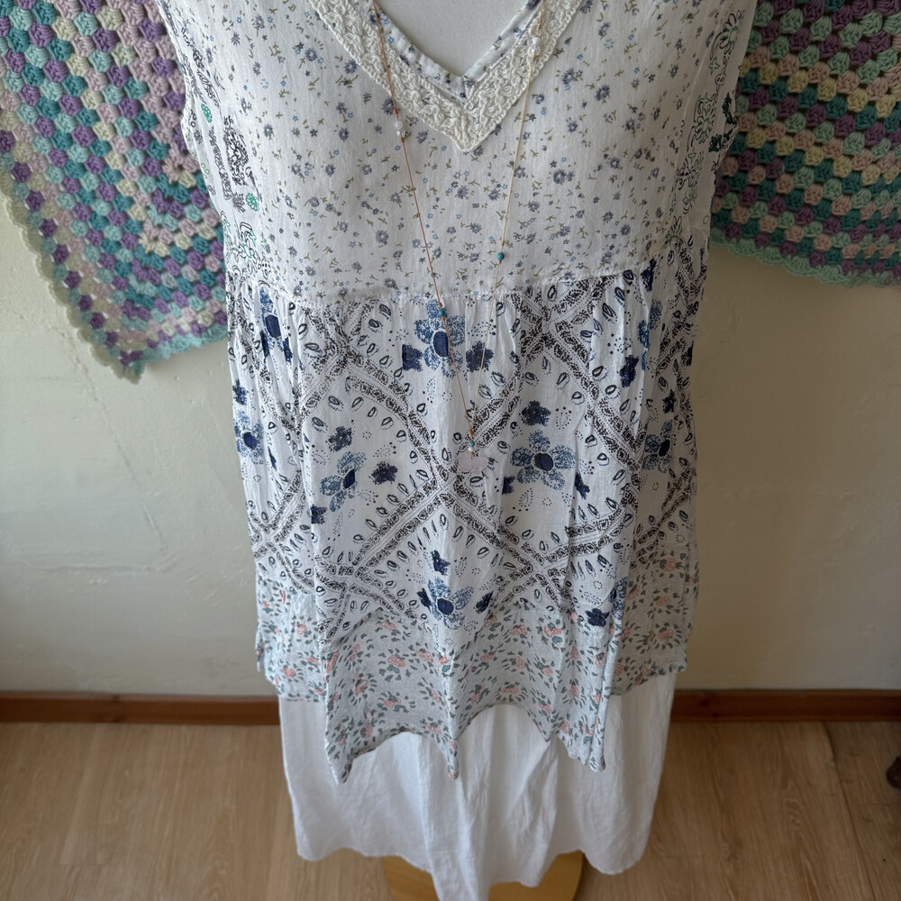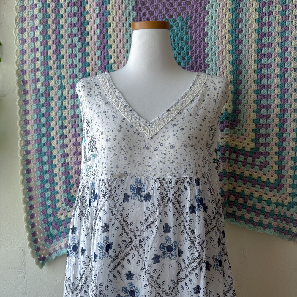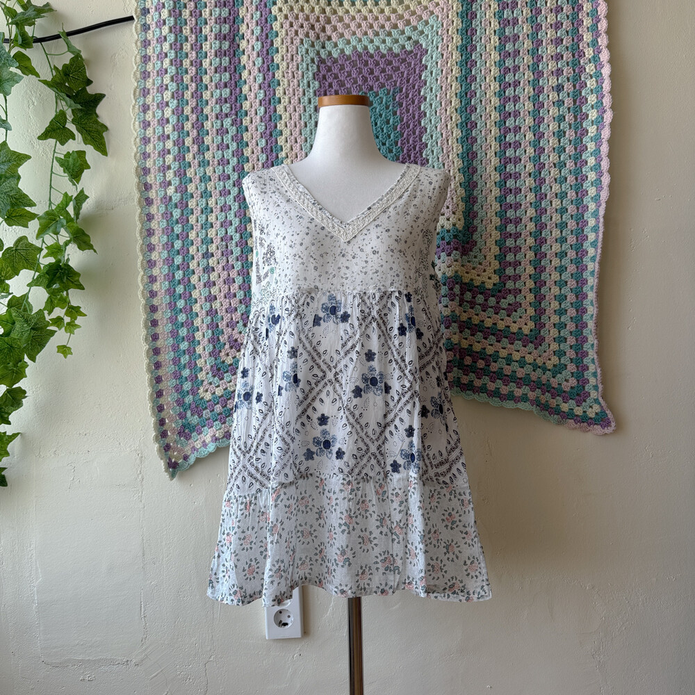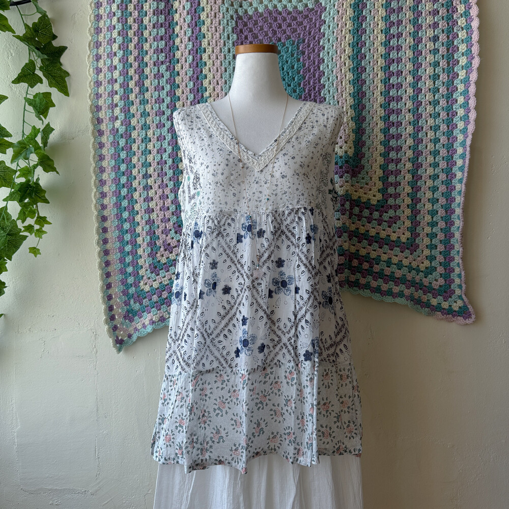 블루, 네이비 색감 베이스의 패치 민소매 블라우스예요