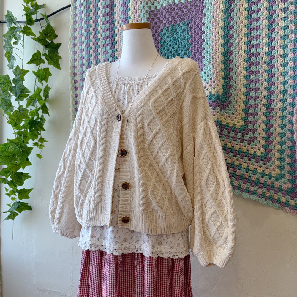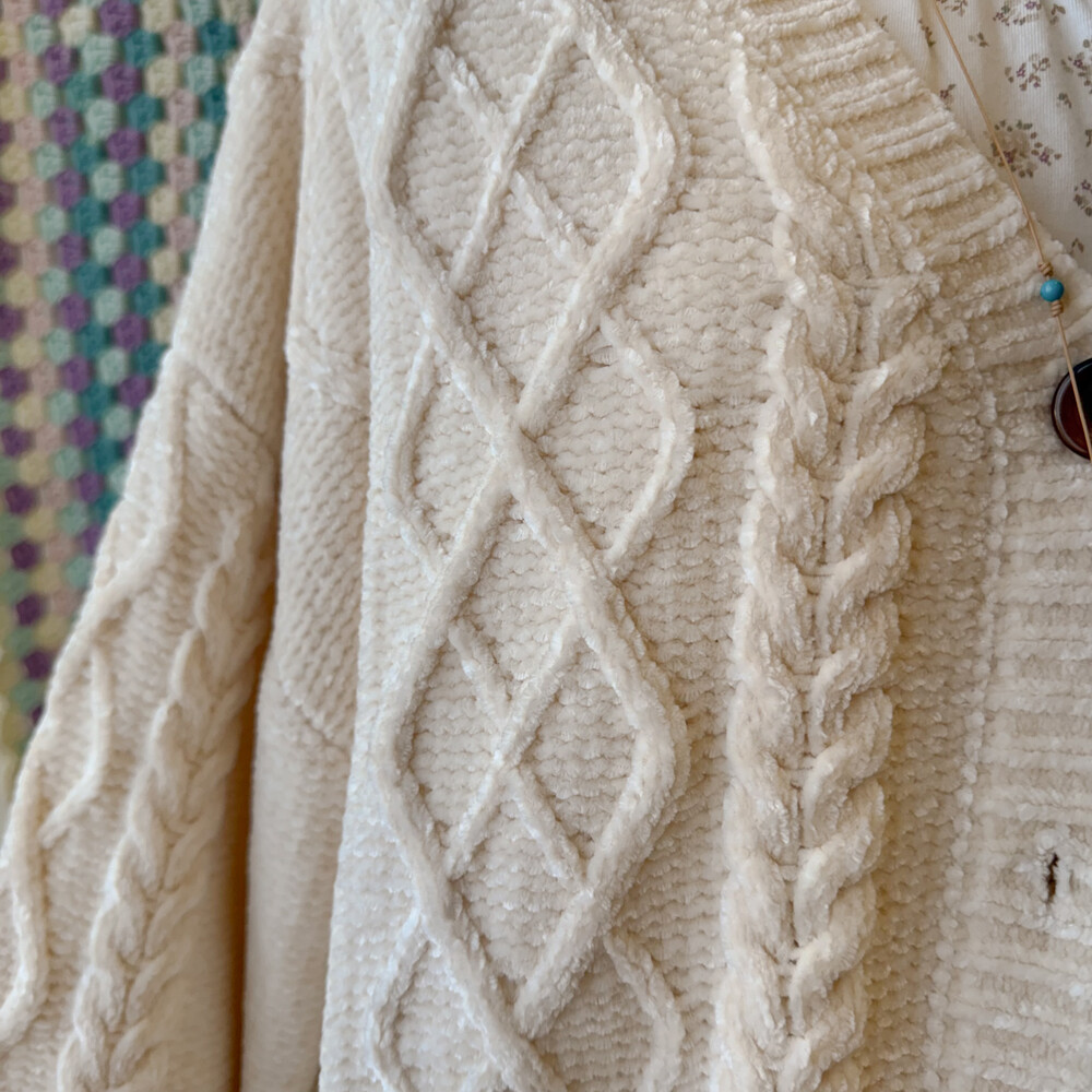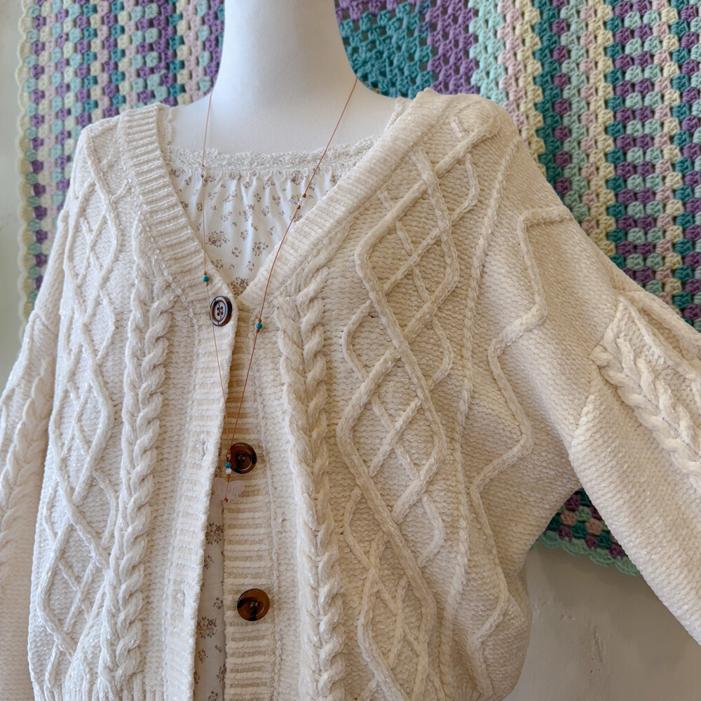 아이보리 색감의 아가일 브이넥 가디건이에요