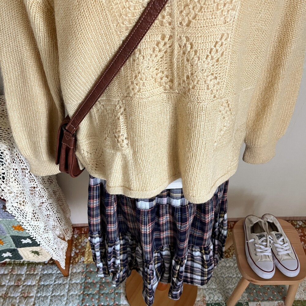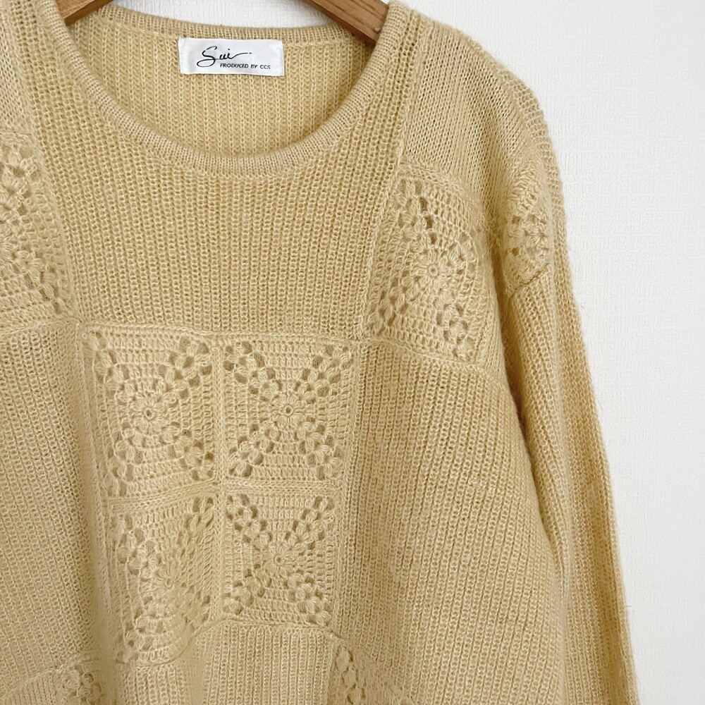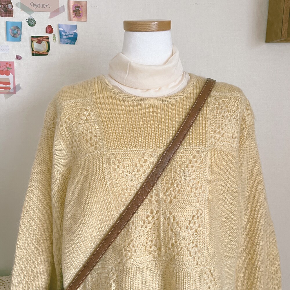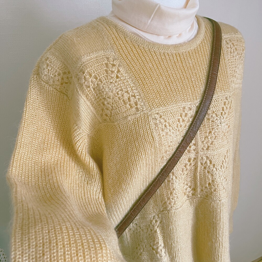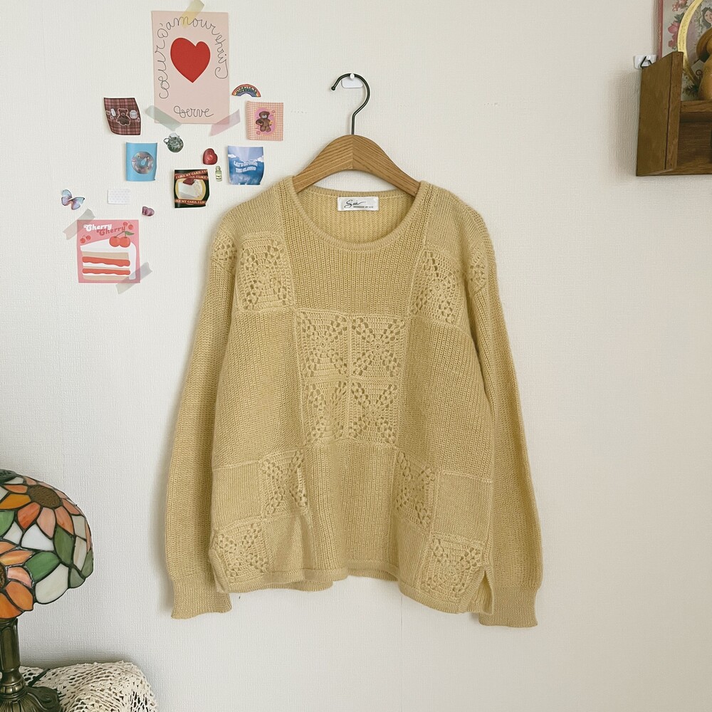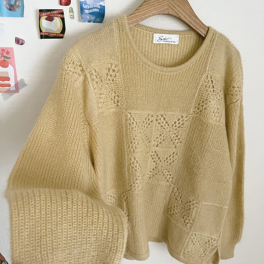 베이지 섞인듯한 노란색감의 모티브 패턴 니트예요