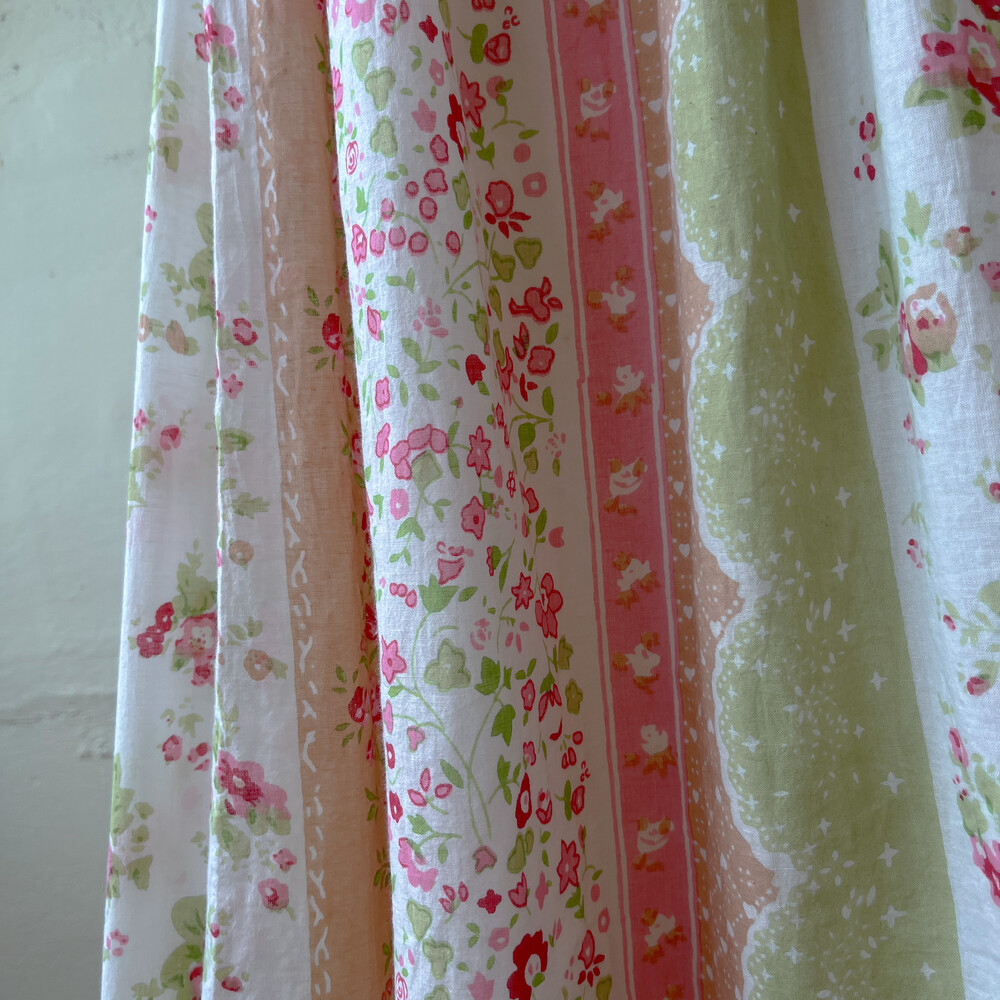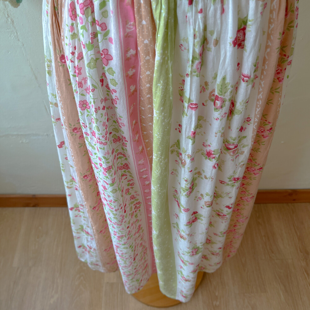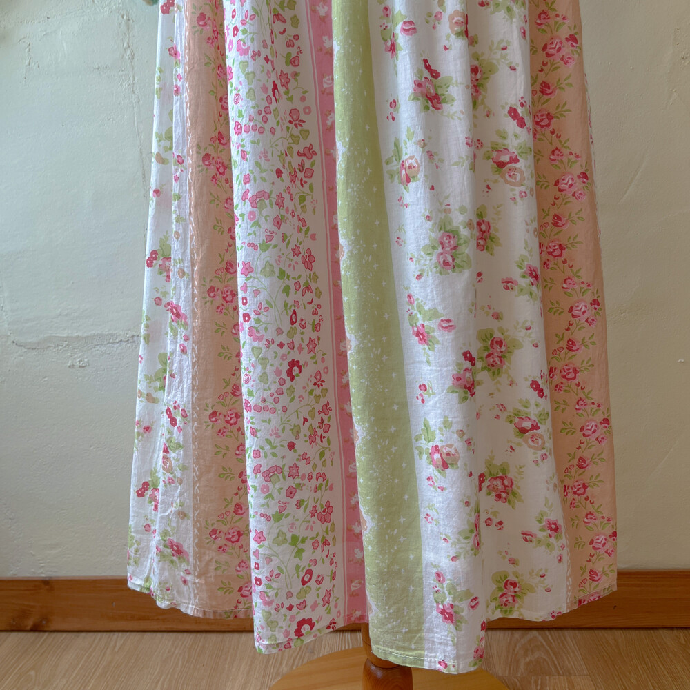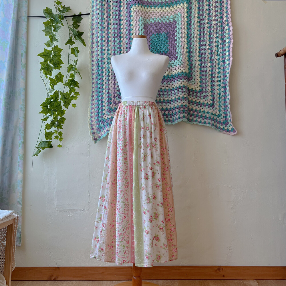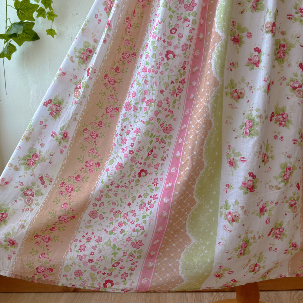 그린, 분홍, 베이지 색감이 조합된 코튼 스커트예요