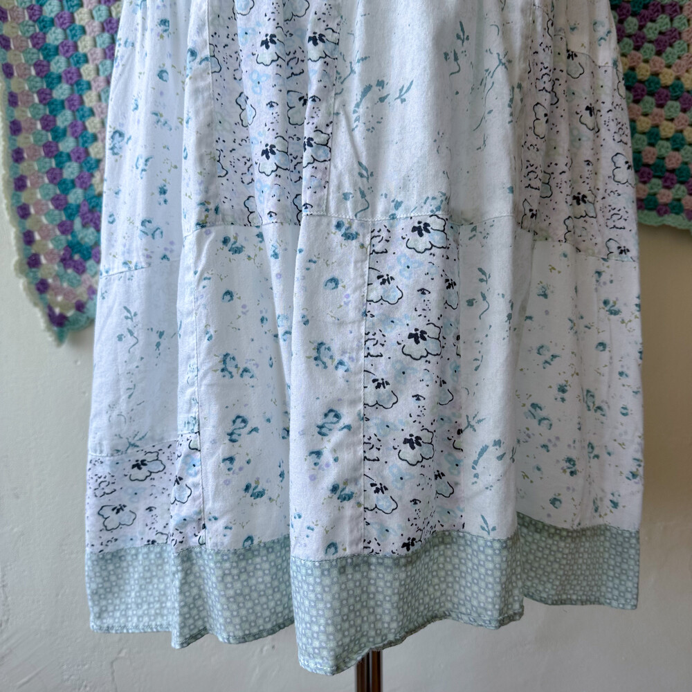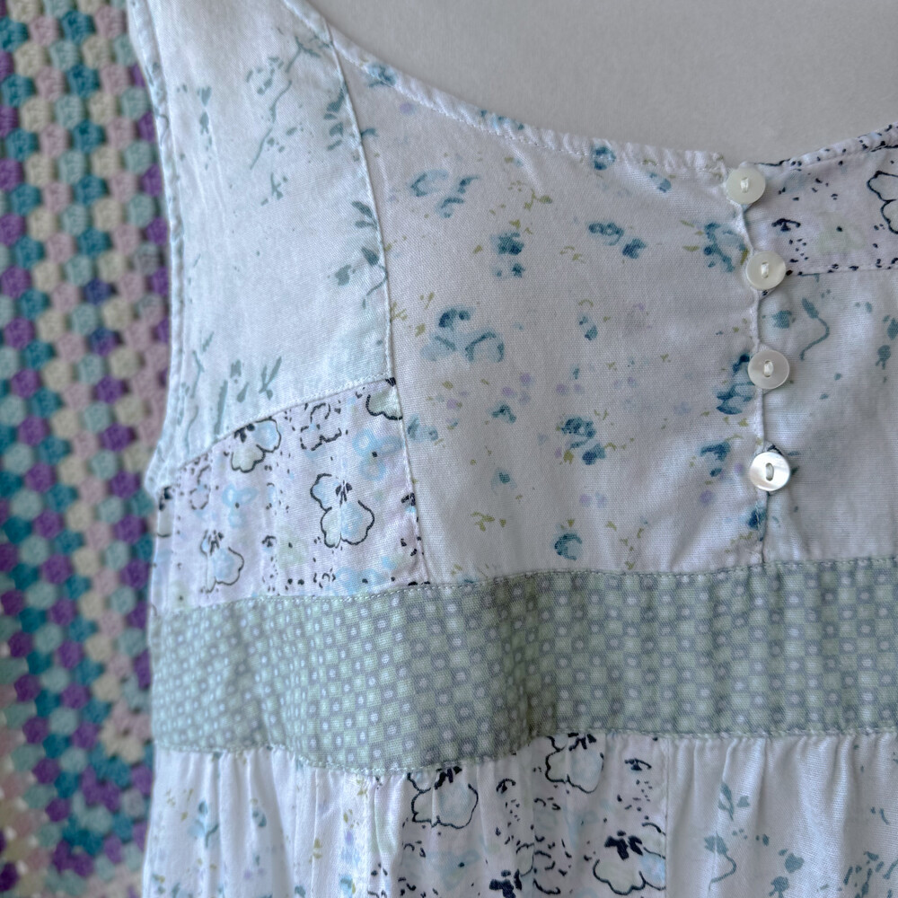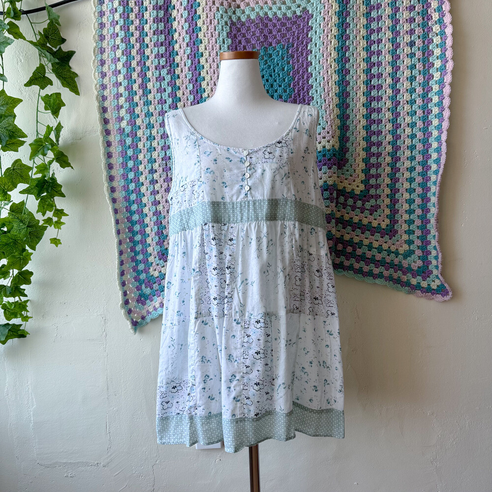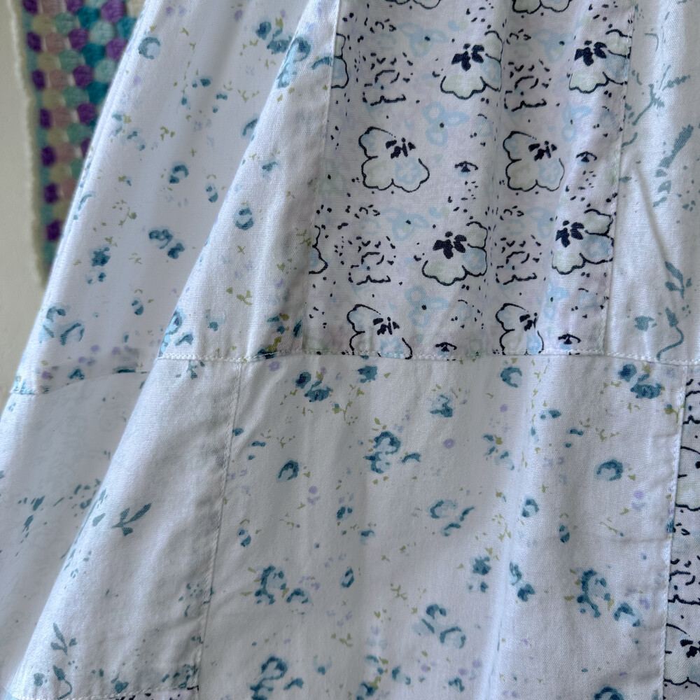 민트와 아쿠아블루가 섞인 색감의 패치워크 블라우스예요