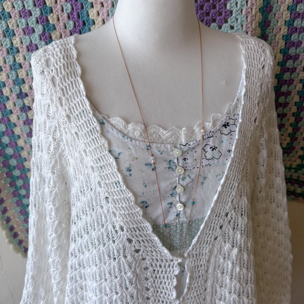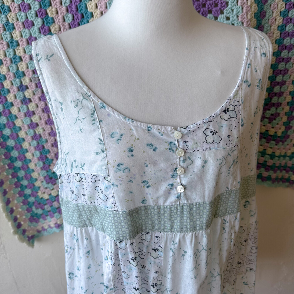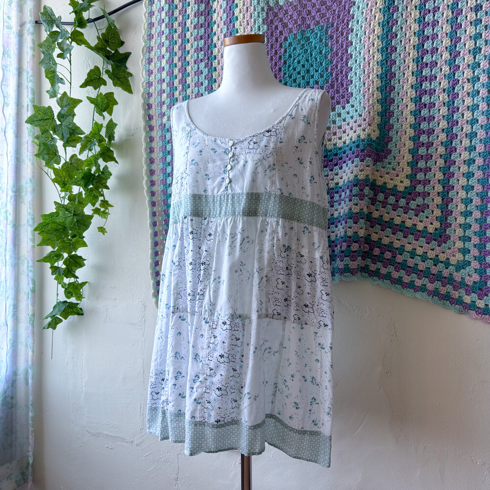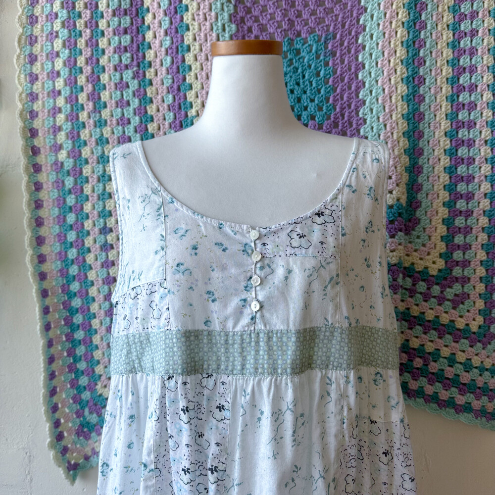 민트와 아쿠아블루가 섞인 색감의 패치워크 블라우스예요