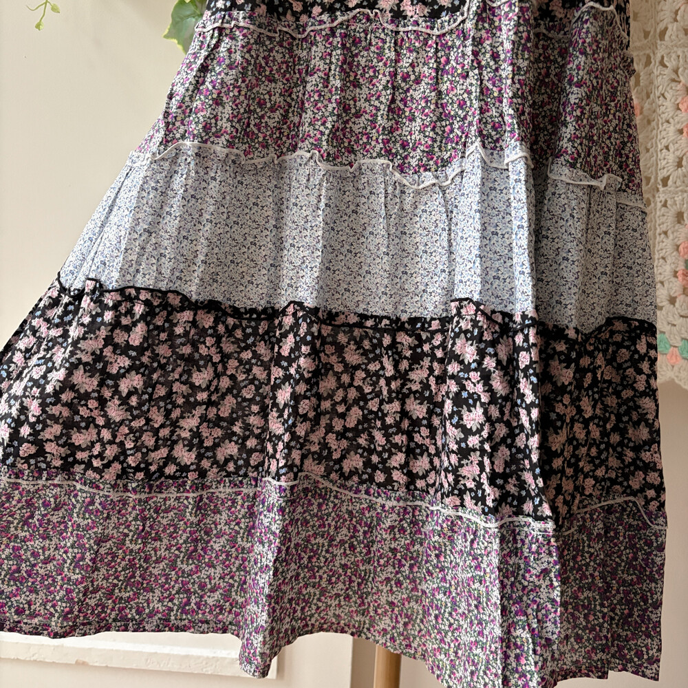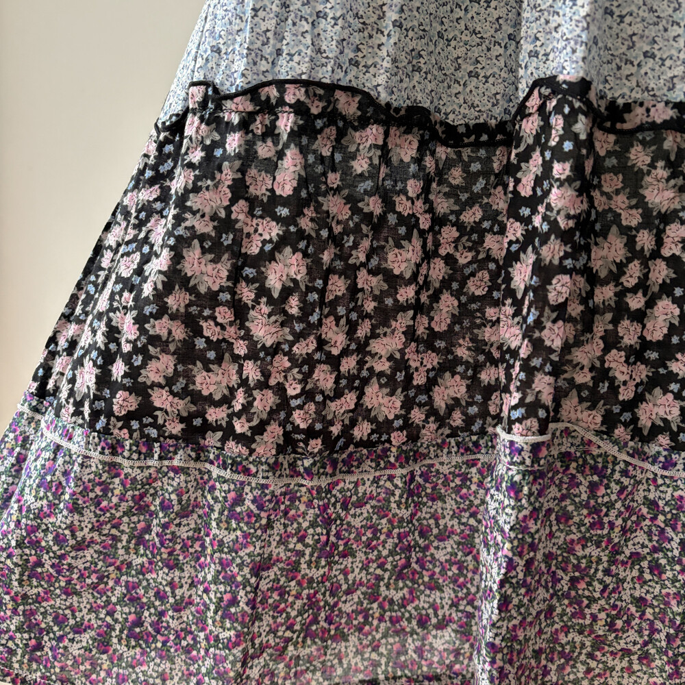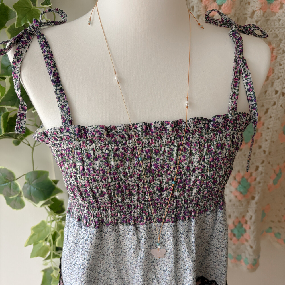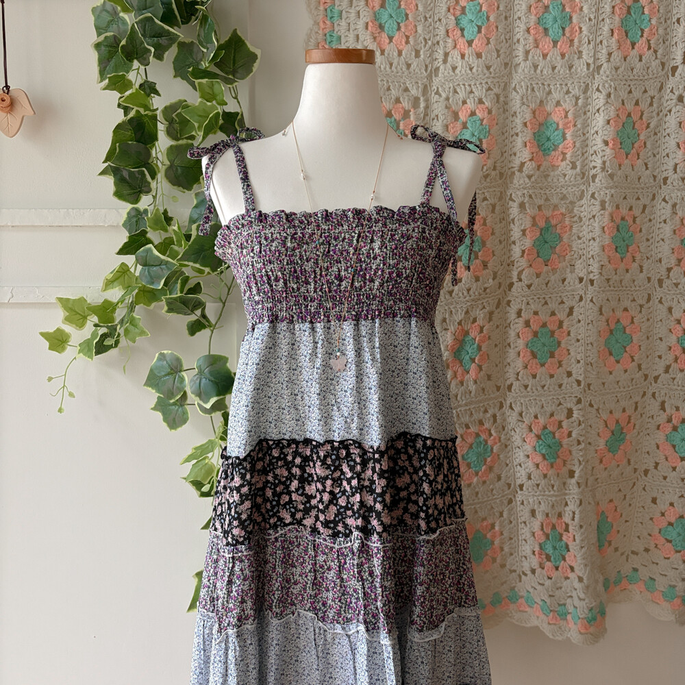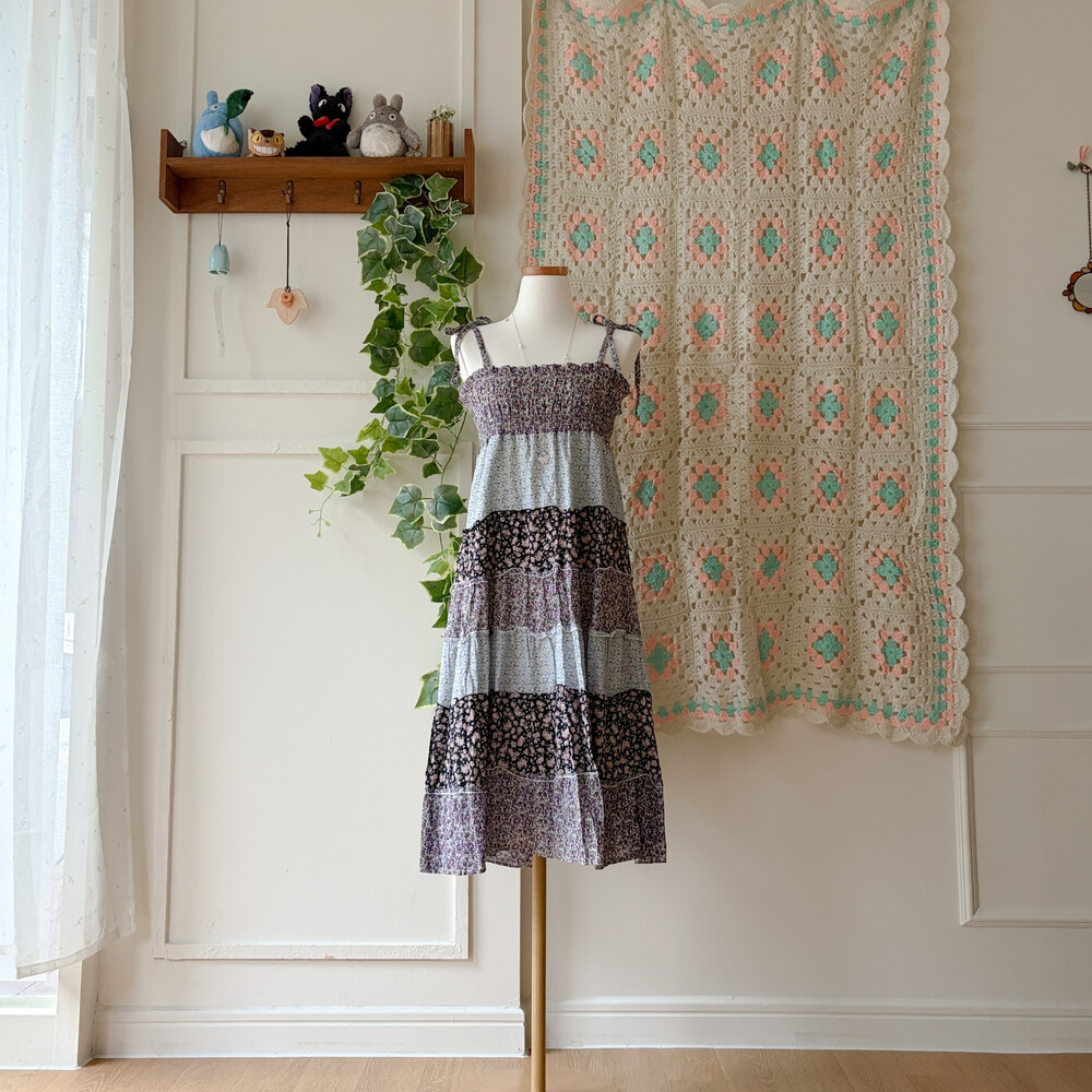 블루, 퍼플 색감의 꽃무늬 패치워크 끈원피스예요
