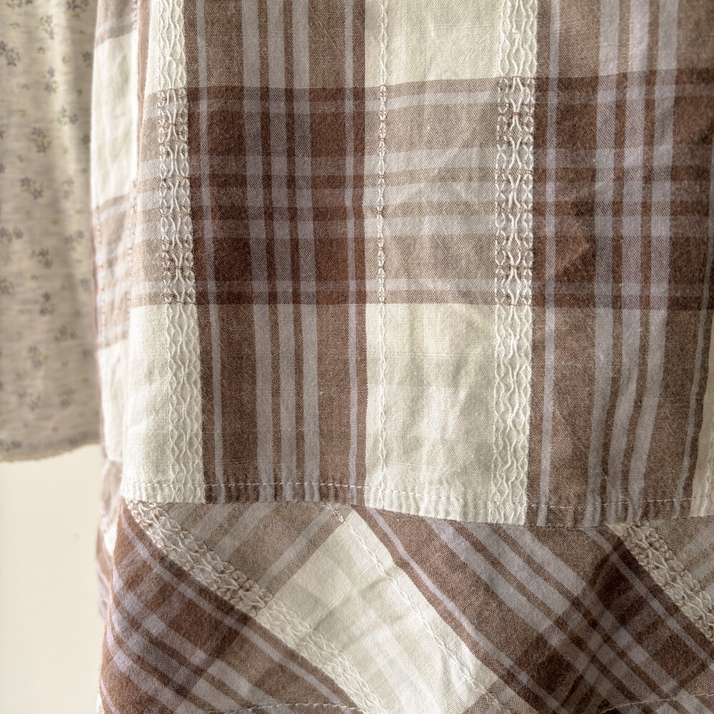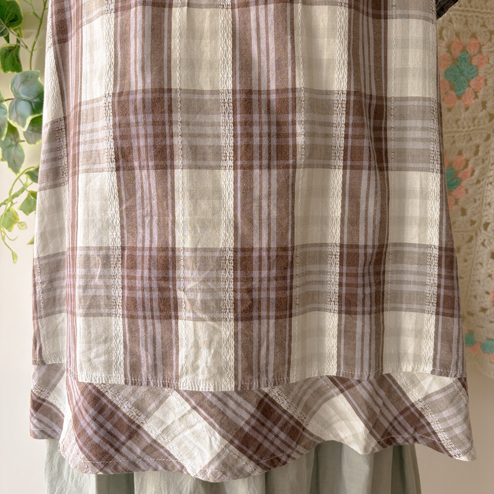 브라운에 연카키, 연보라색감이 조합된 체크 블라우스예요