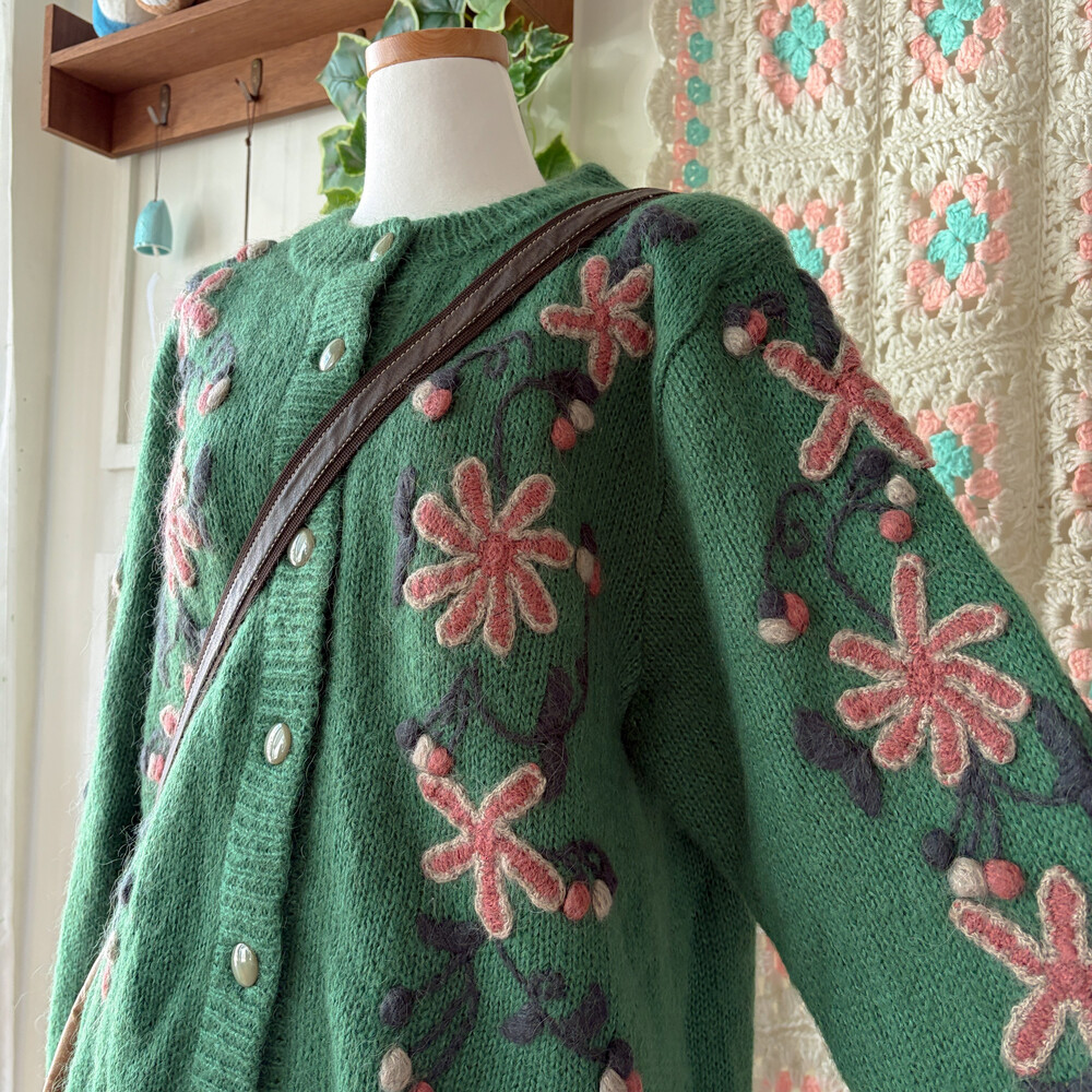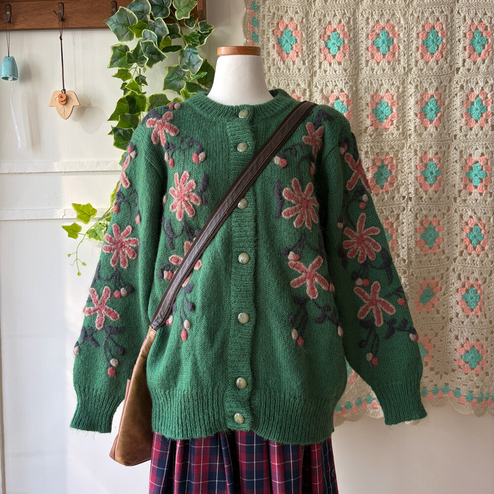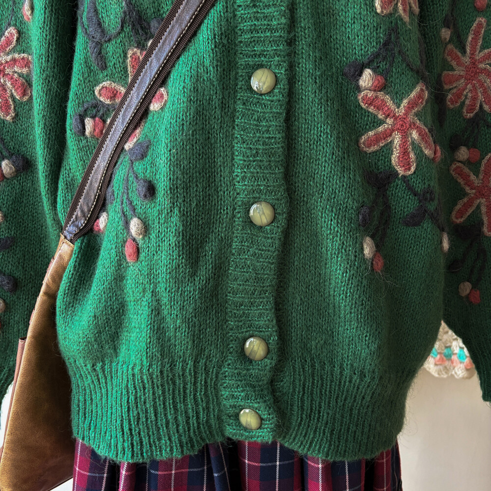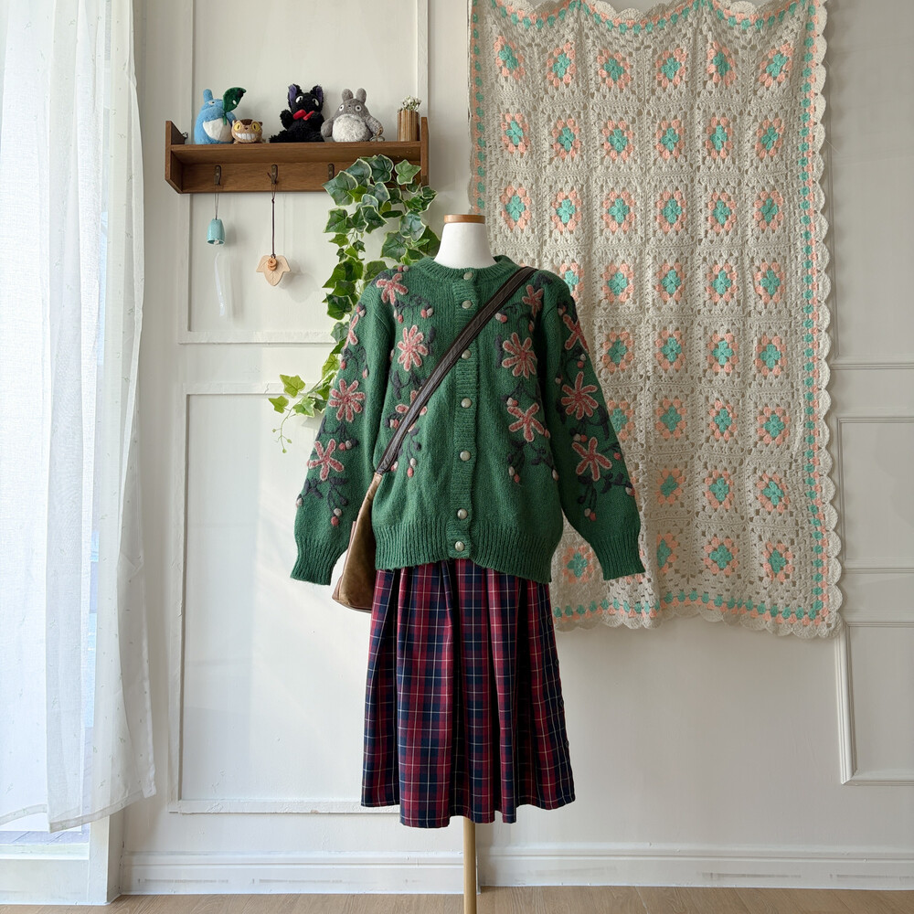 그린 색감의 꽃자수 모티브 가디건이에요