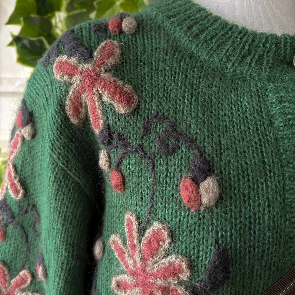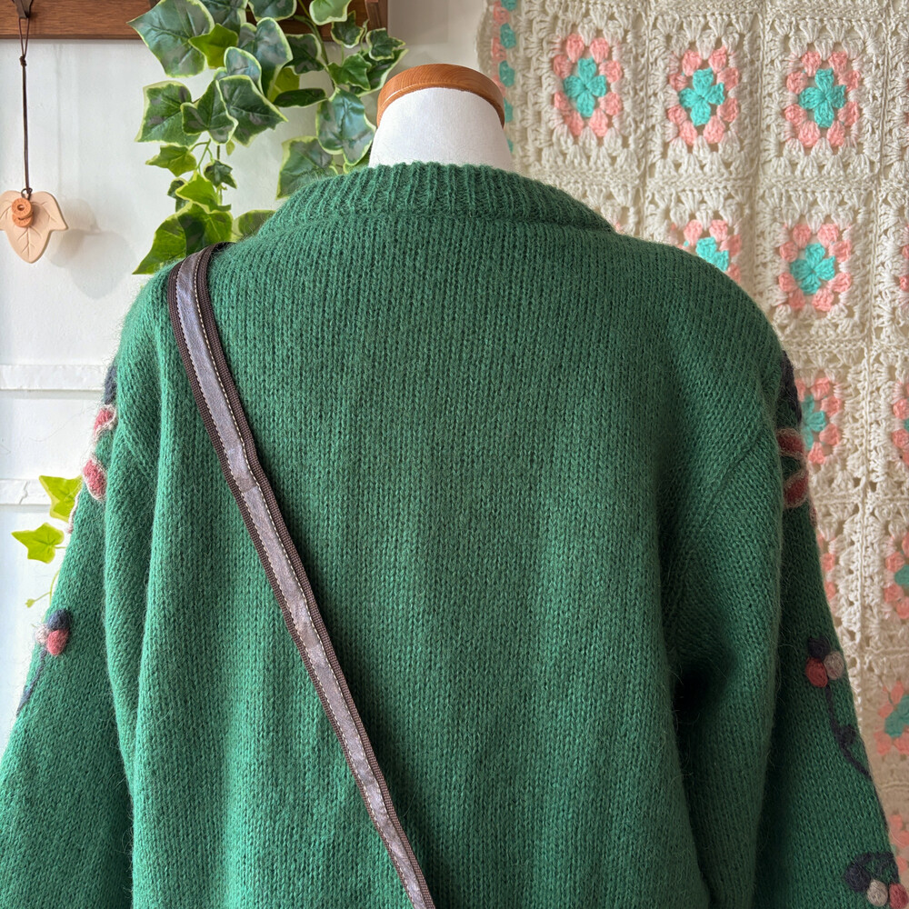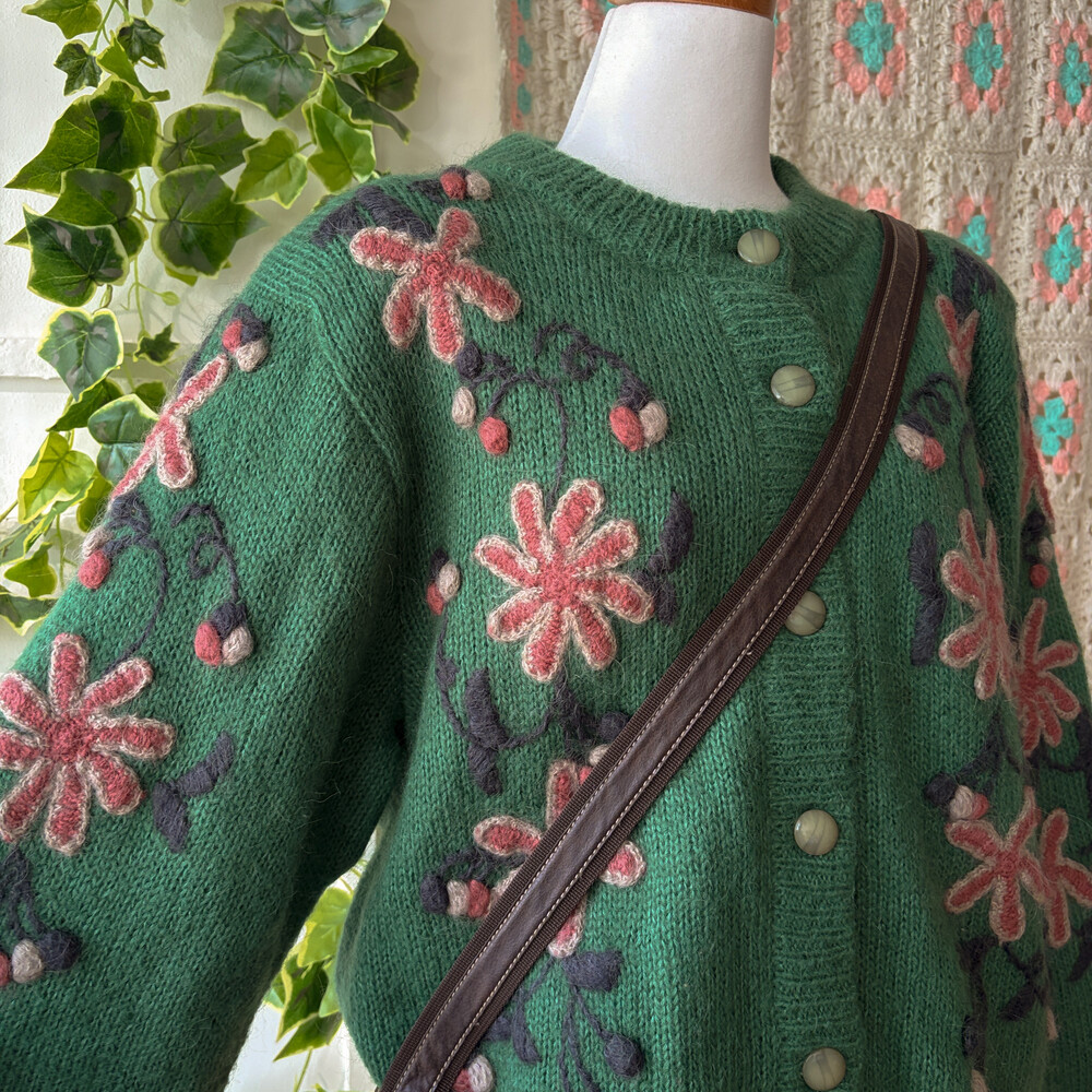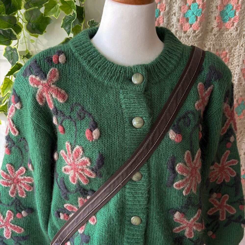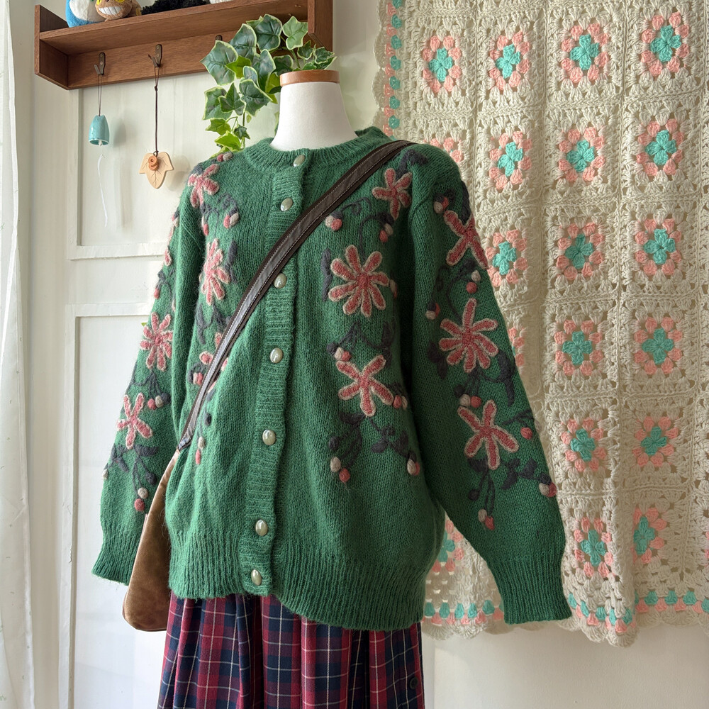 그린 색감의 꽃자수 모티브 가디건이에요